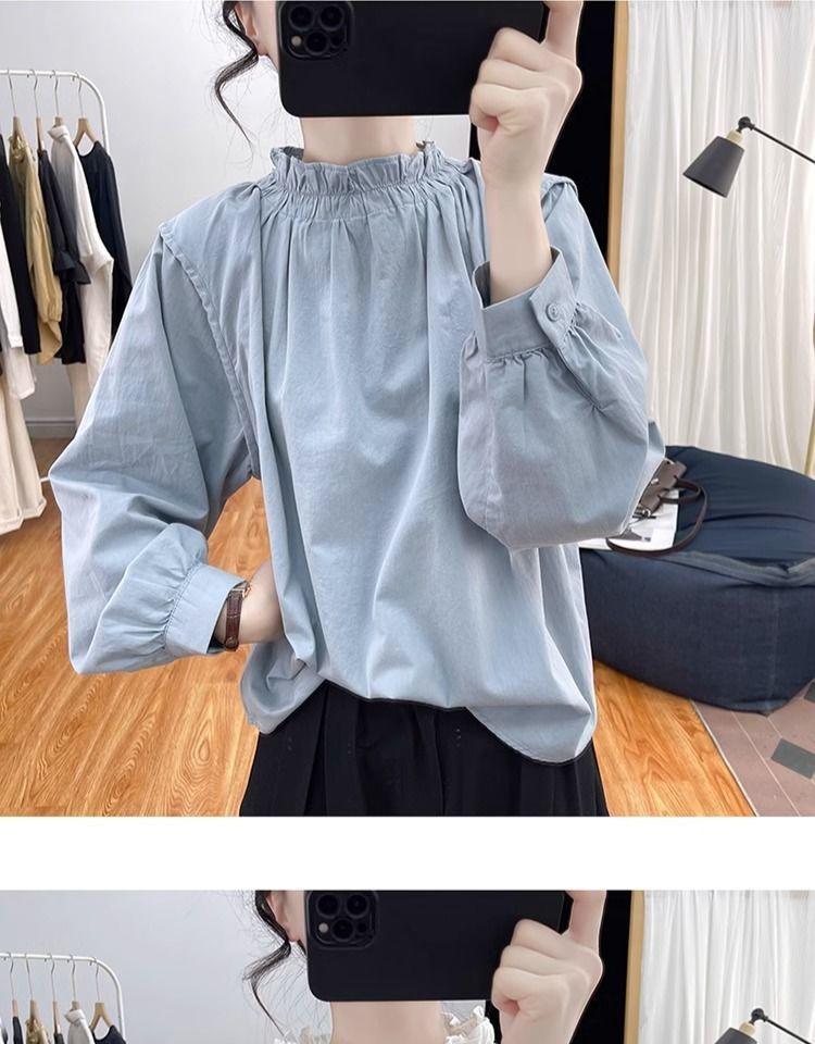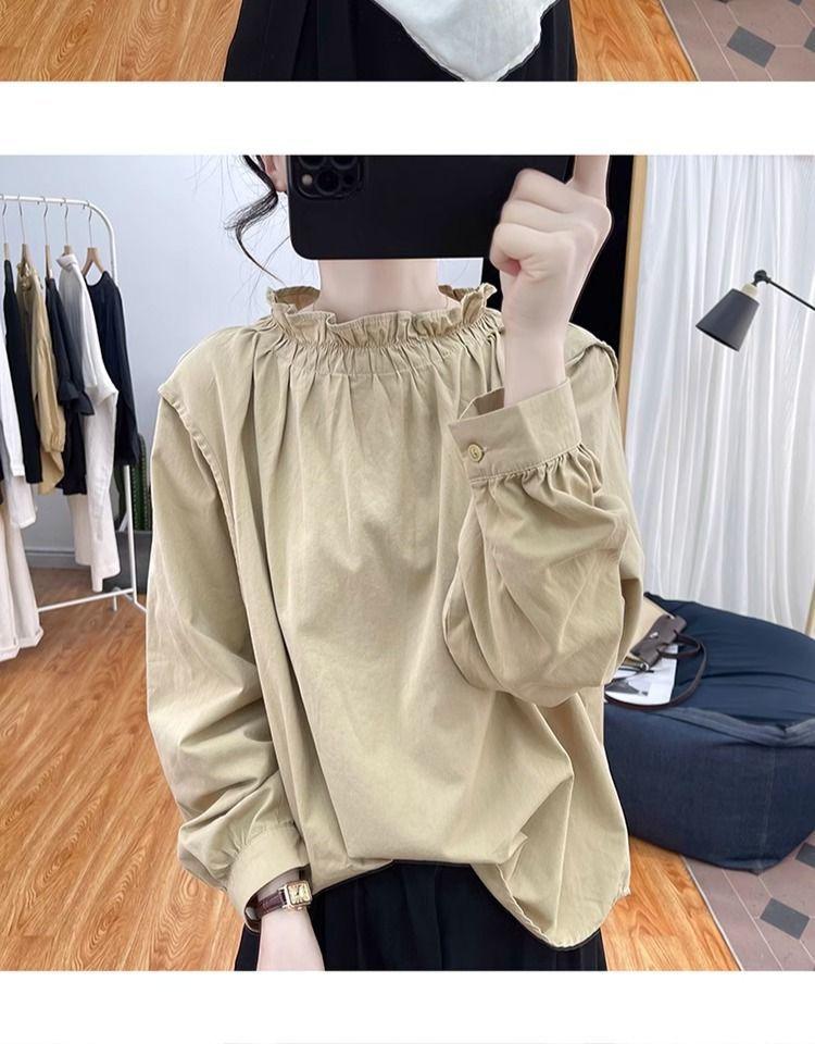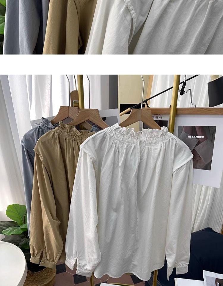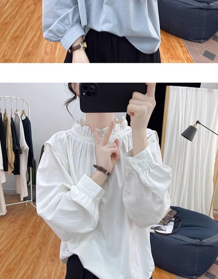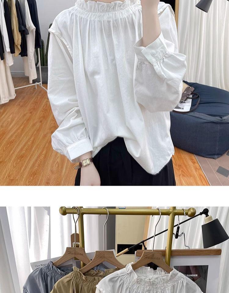Primavera/Verano Cuello de Hoja de Loto Manga Linterna Algodón Puro Manga Larga Camisa para Mujer Top Reductor de Edad Nuevo Suéter Retro Camisa Holgada