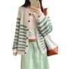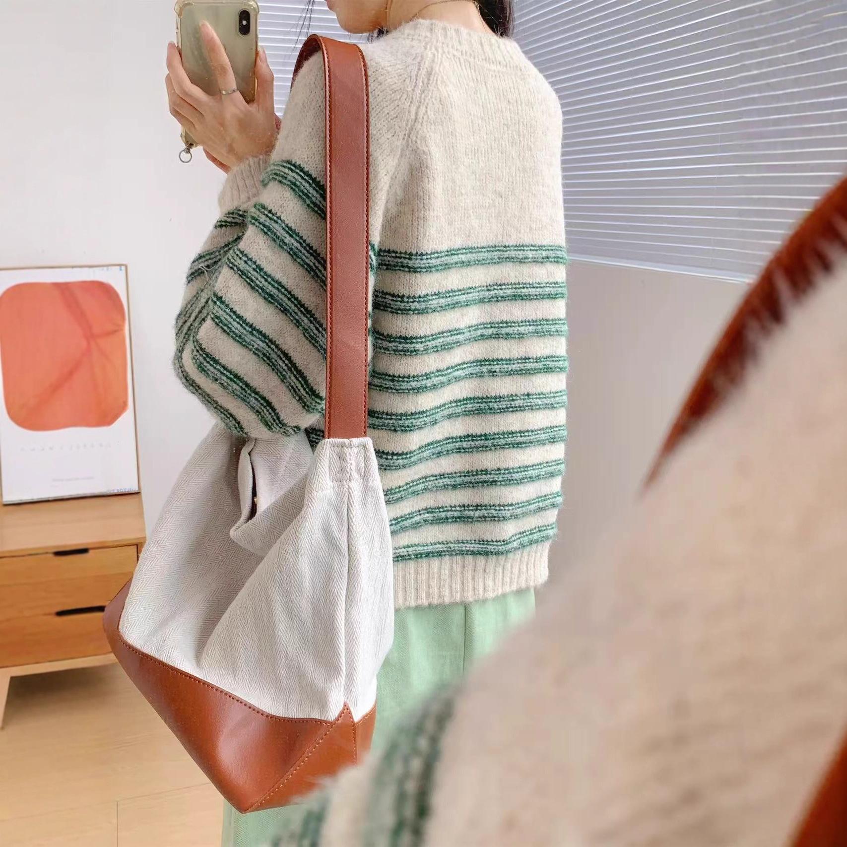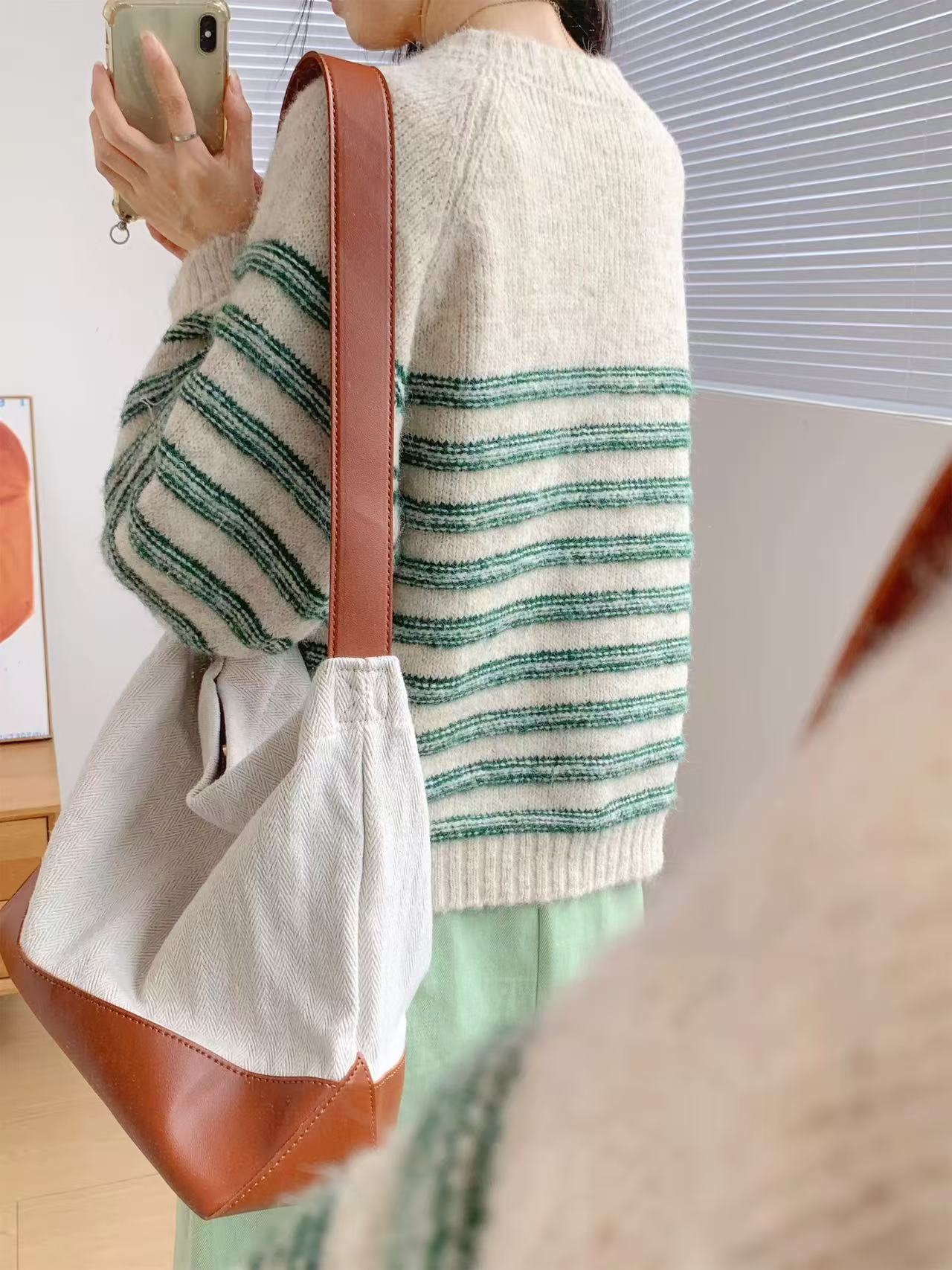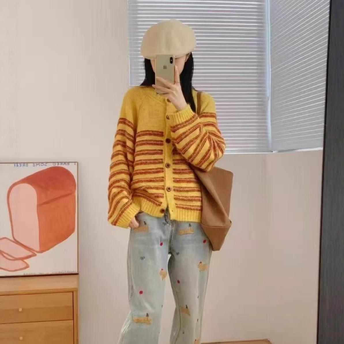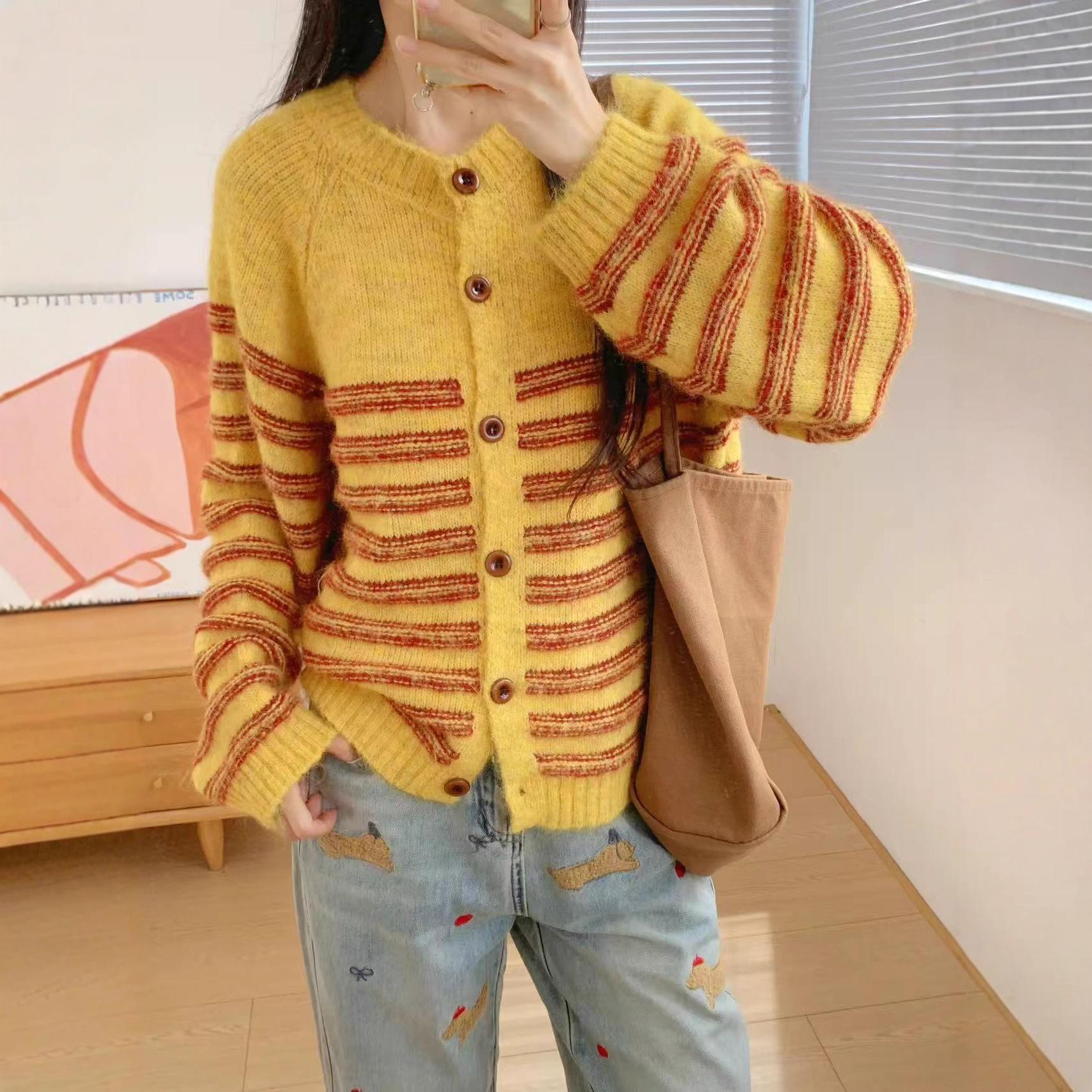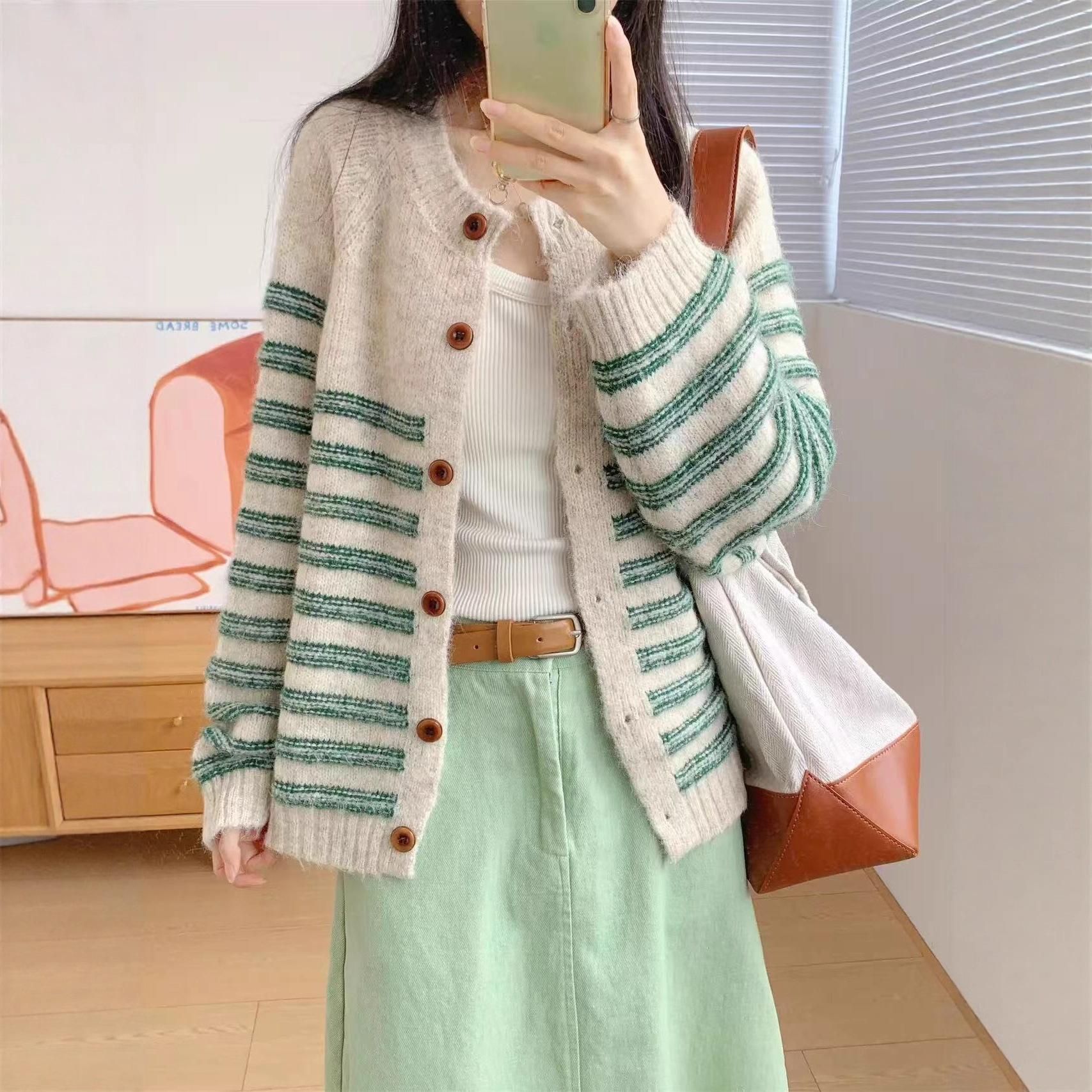Retiro en Mostrador Marca Grande Etiqueta Cortada Ropa de Mujer Estilo Holgazán Suéter Rayado Mujer Otoño Invierno Retro Temperamento Grueso Top de Punto