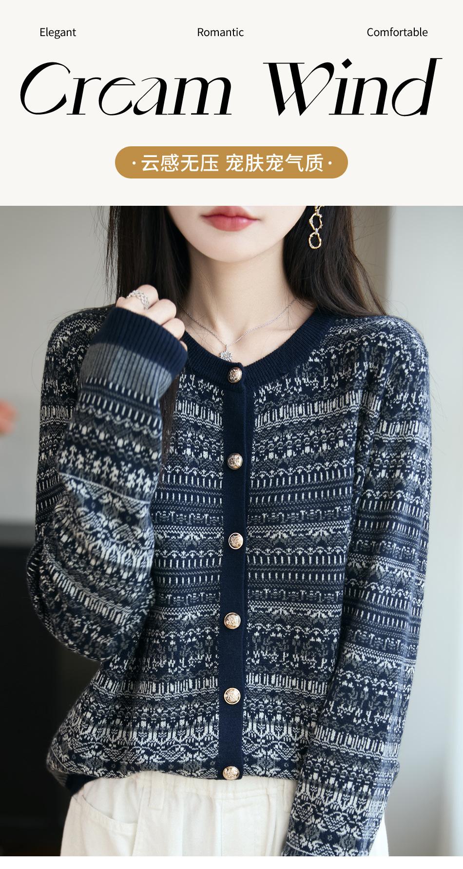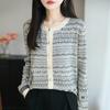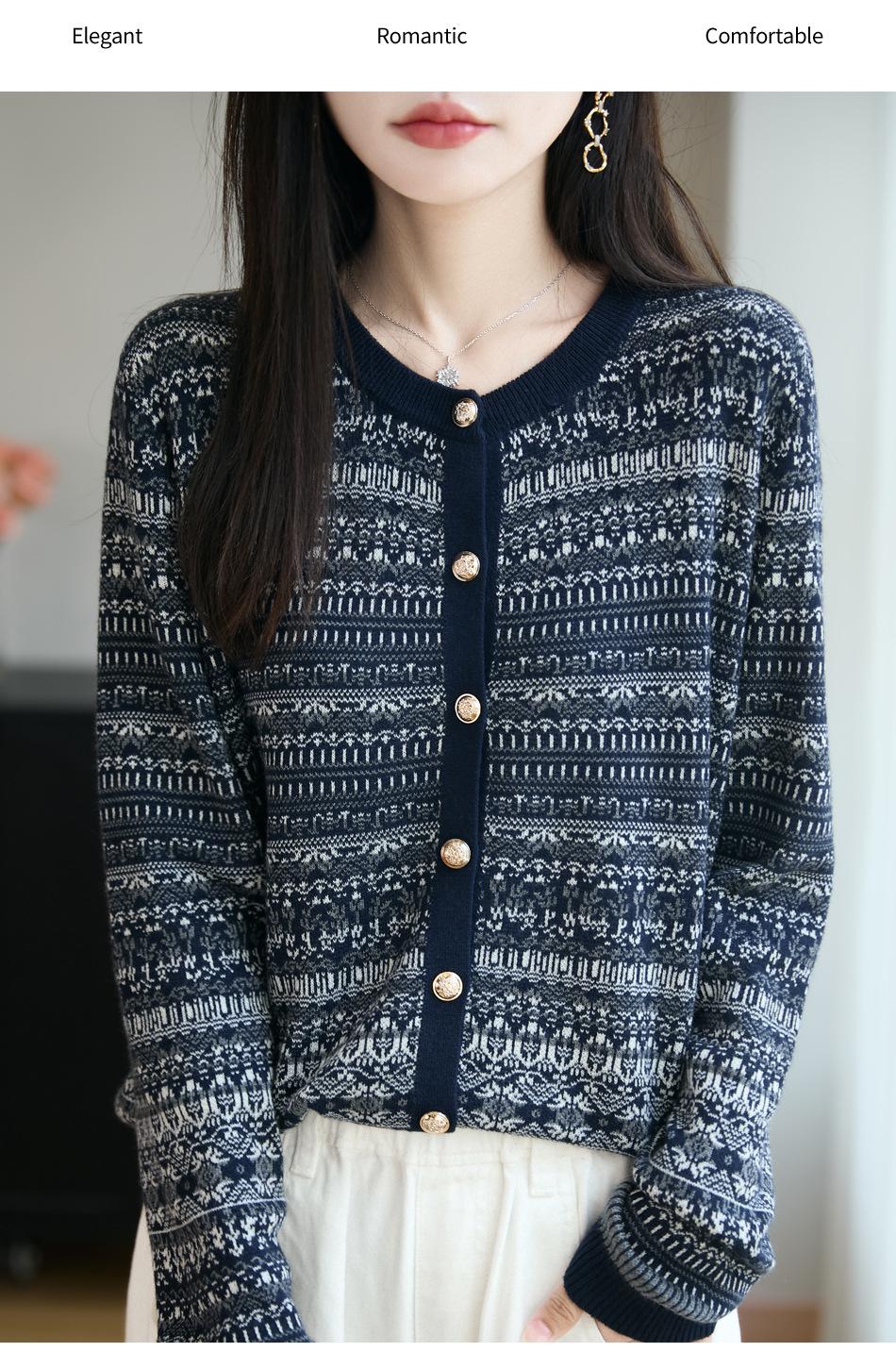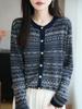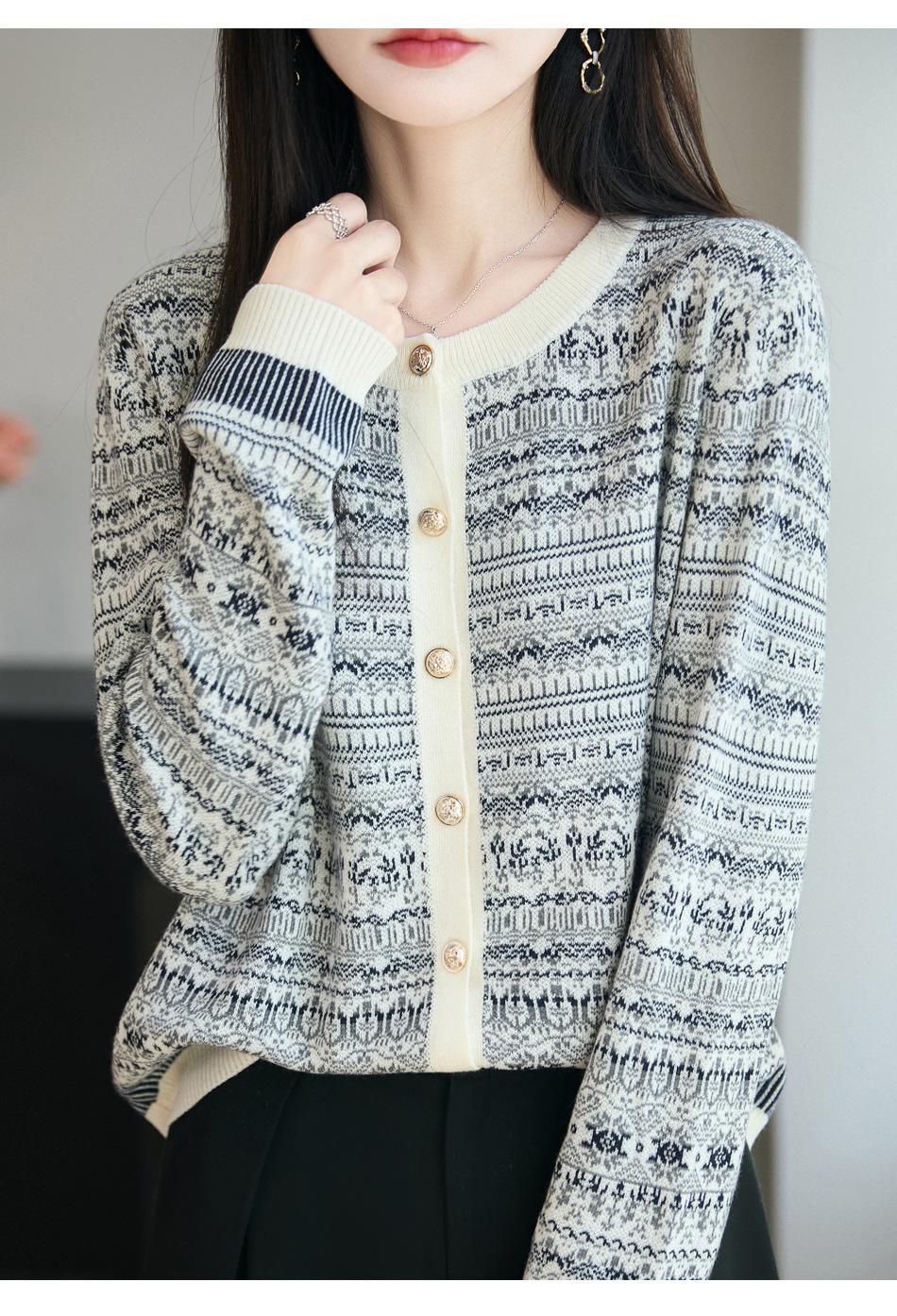 Cárdigan de Punto de Lana Merino Fina de Otoño Temprano 2025 con Cuello Redondo y Manga Larga para Mujer, Temperamento, Jacquard, Holgado, Top Exterior