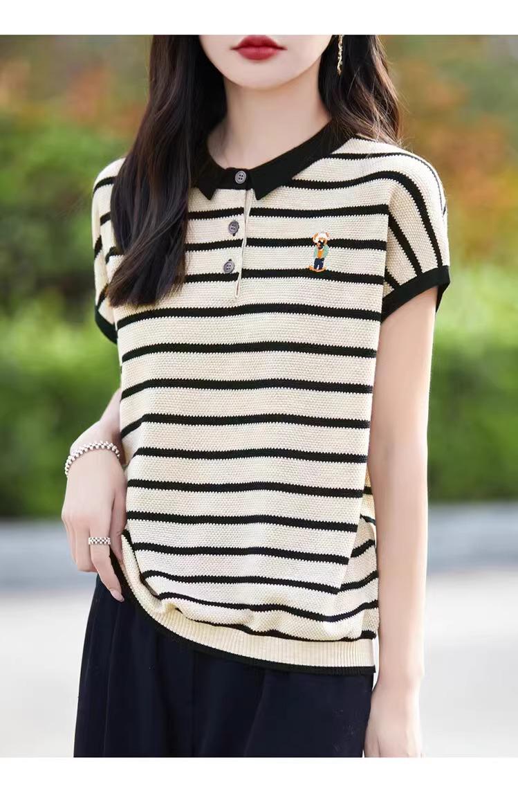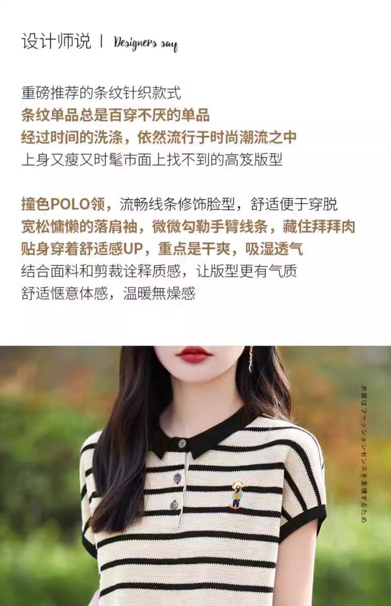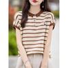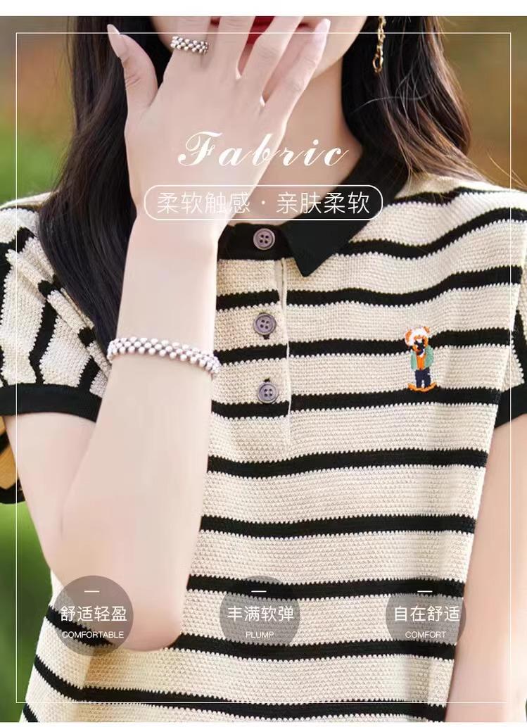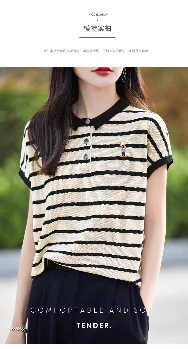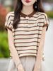 Camiseta de Manga Corta a Rayas para Mujer Verano Nueva Moda Elegante de Gama Alta Suelta Adelgazante Cuello POLO Camiseta de Punto Moderna A3484