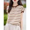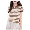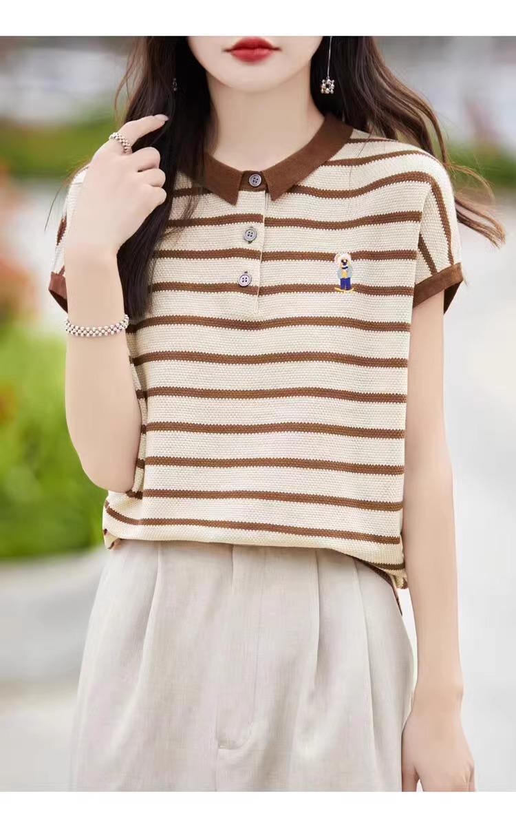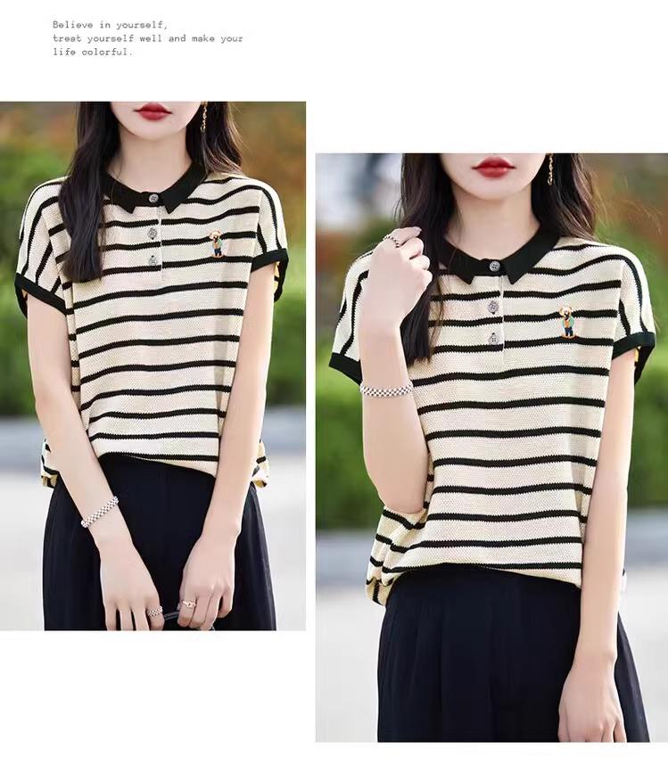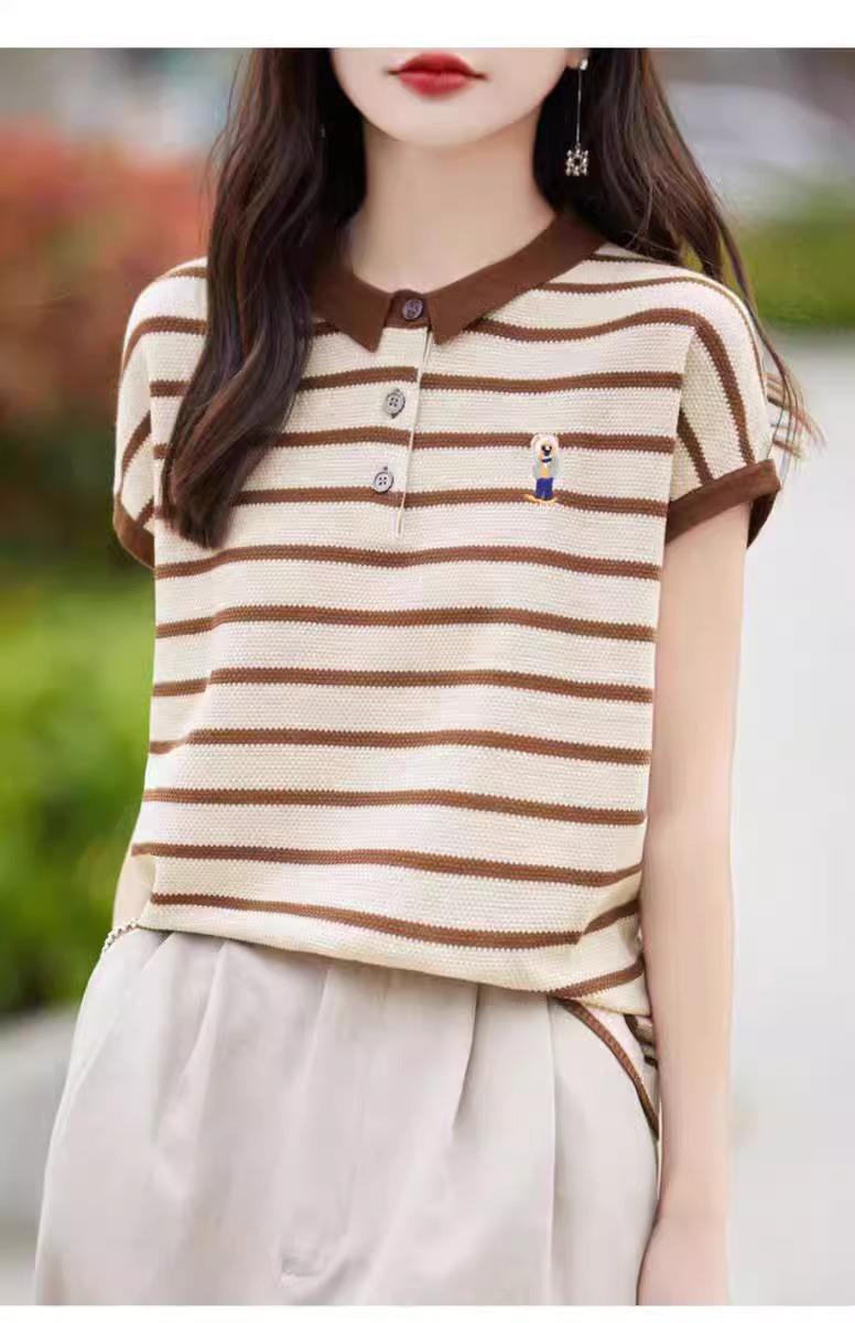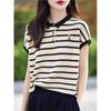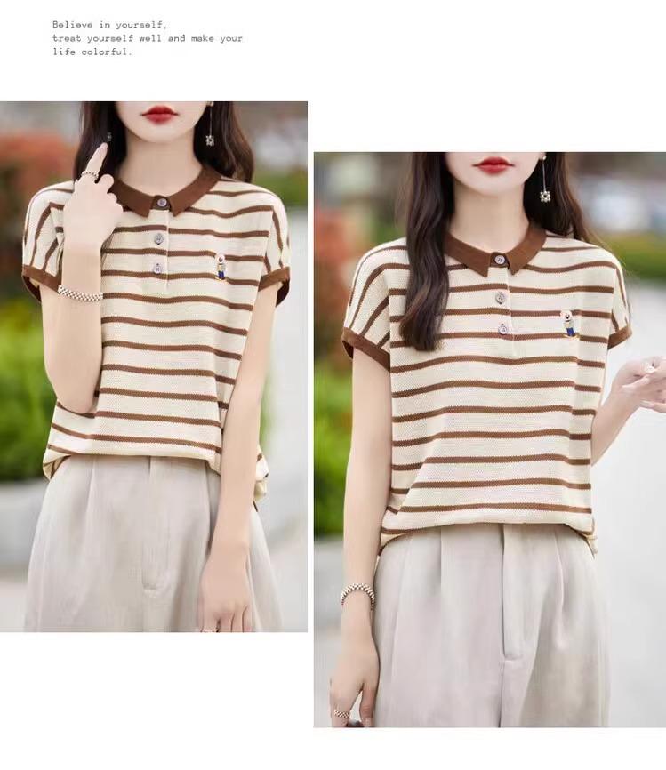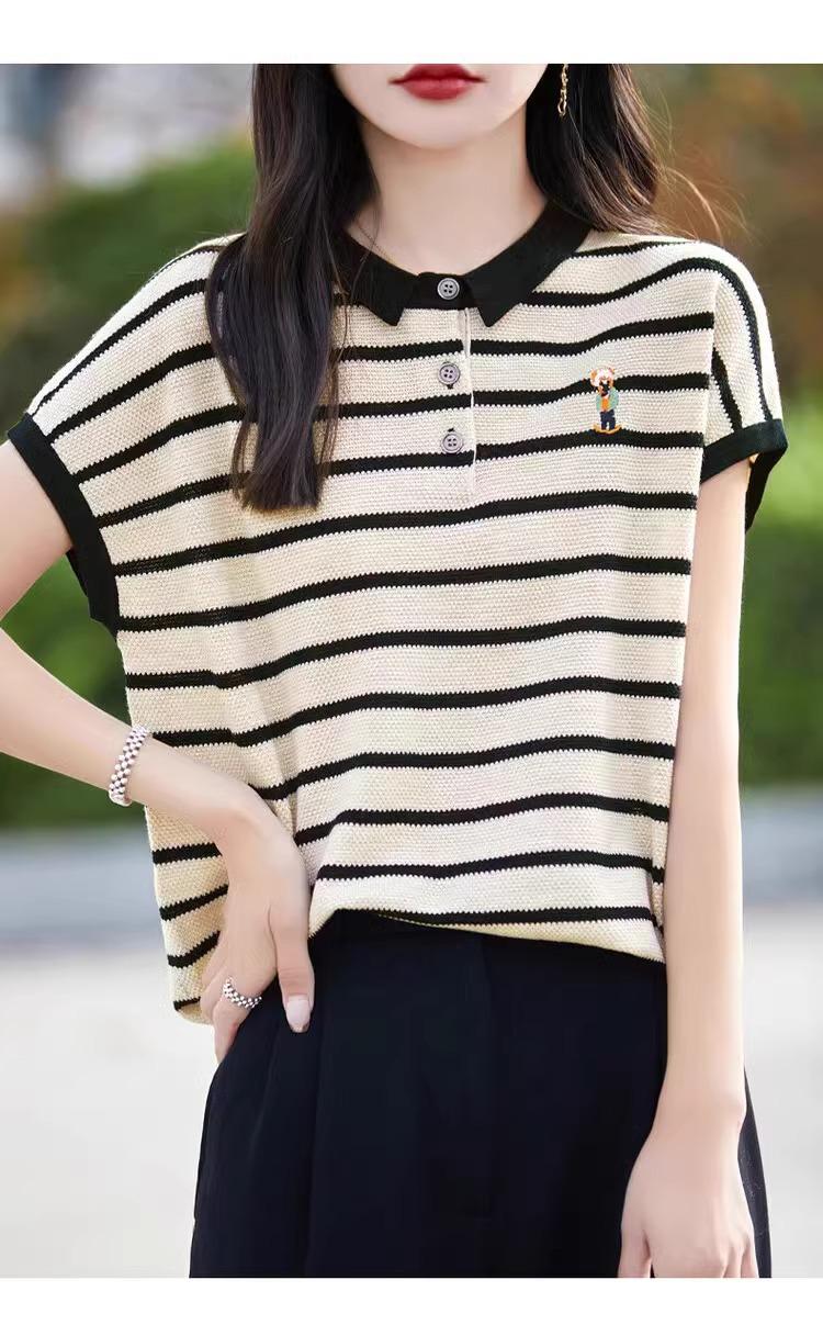 Camiseta de Manga Corta a Rayas para Mujer Verano Nueva Moda Elegante de Gama Alta Suelta Adelgazante Cuello POLO Camiseta de Punto Moderna A3484