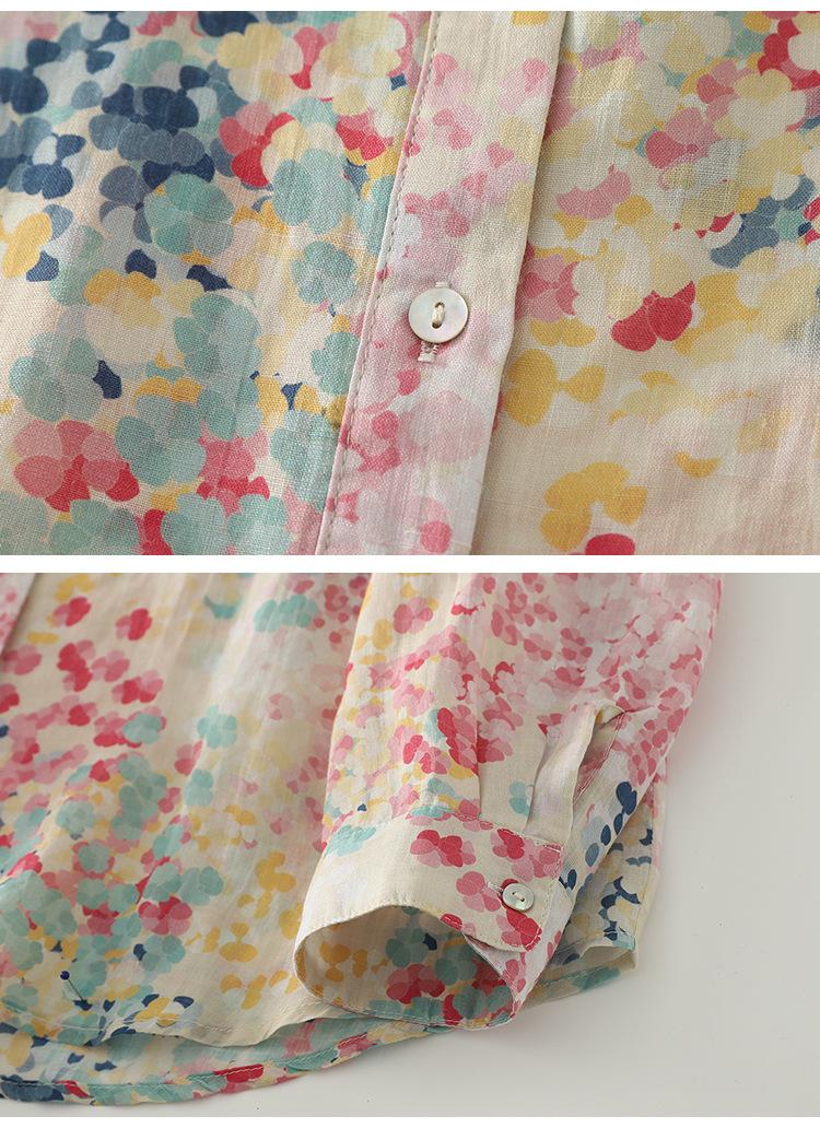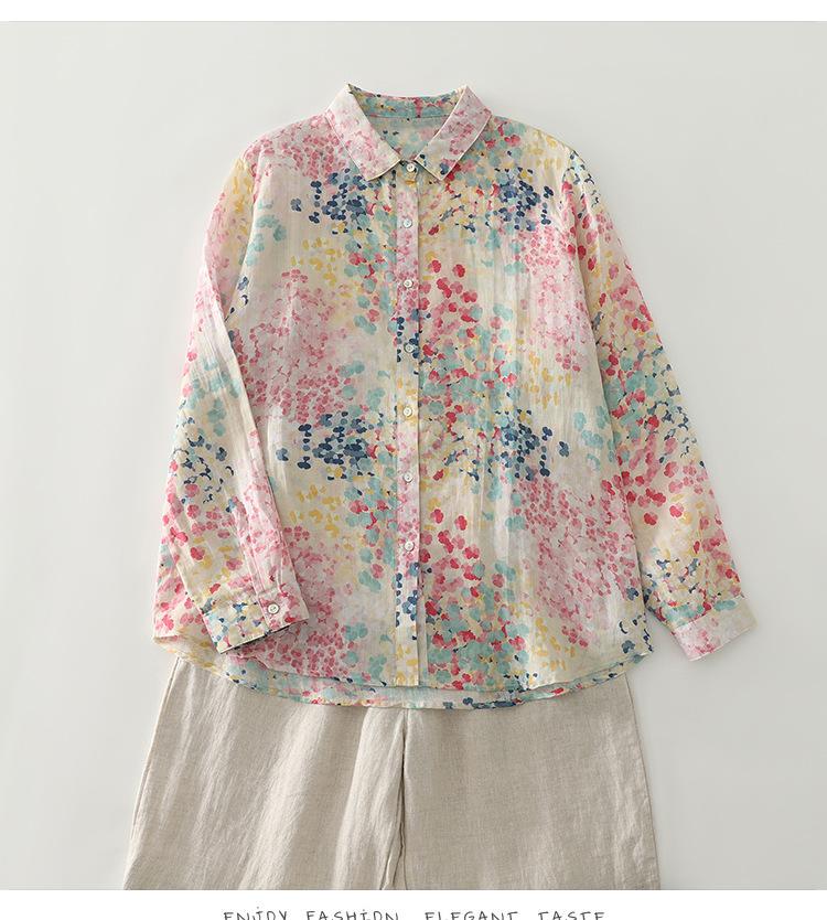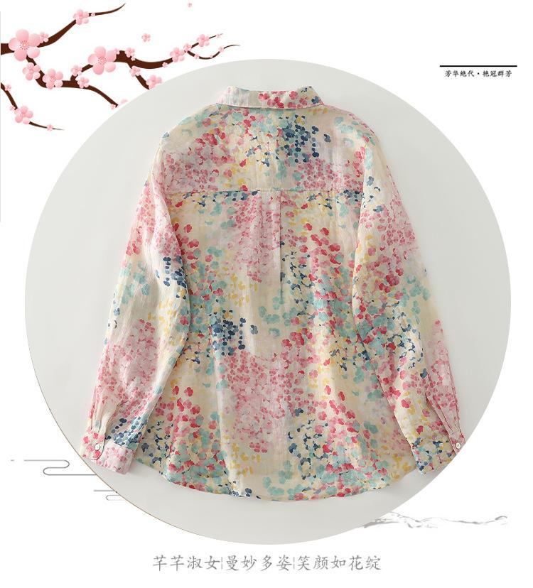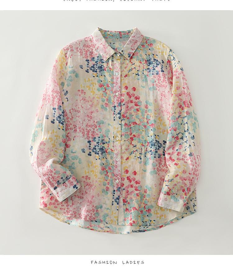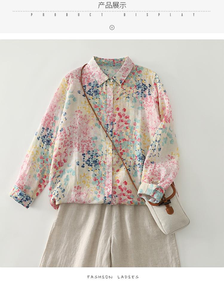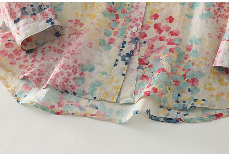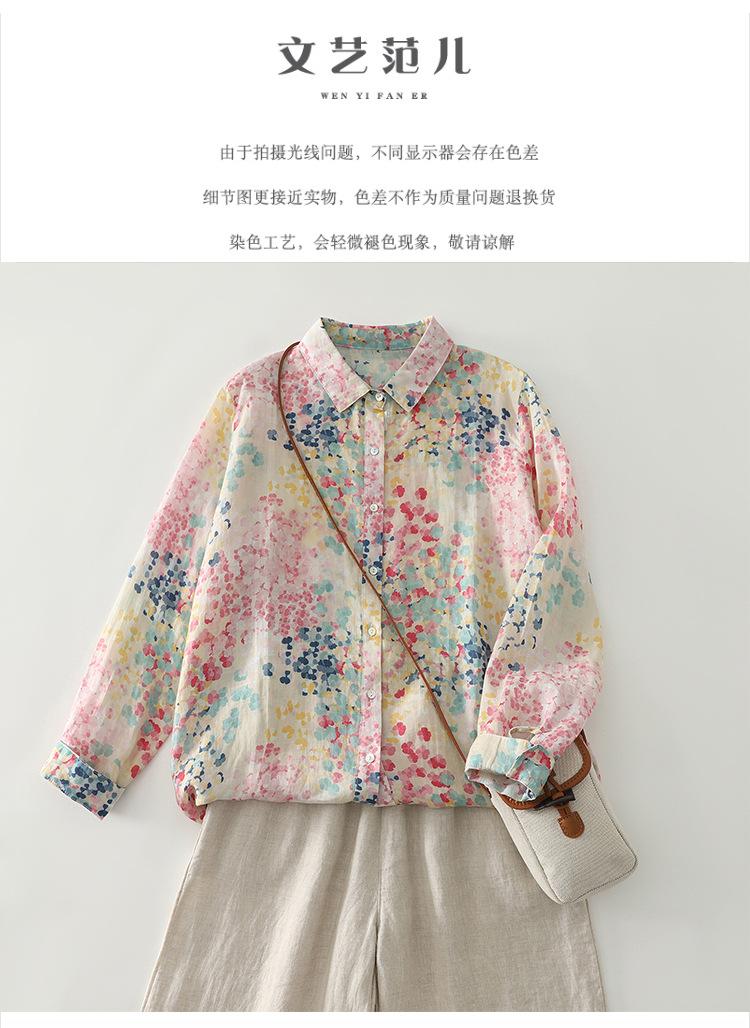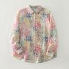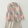 Foto Real En Stock Camisa Floral de Algodón Lino Color Macaron Nicho Versátil Suelta Estilo Principios de Otoño Camisa Estampada Top de Mujer