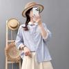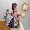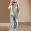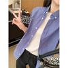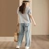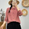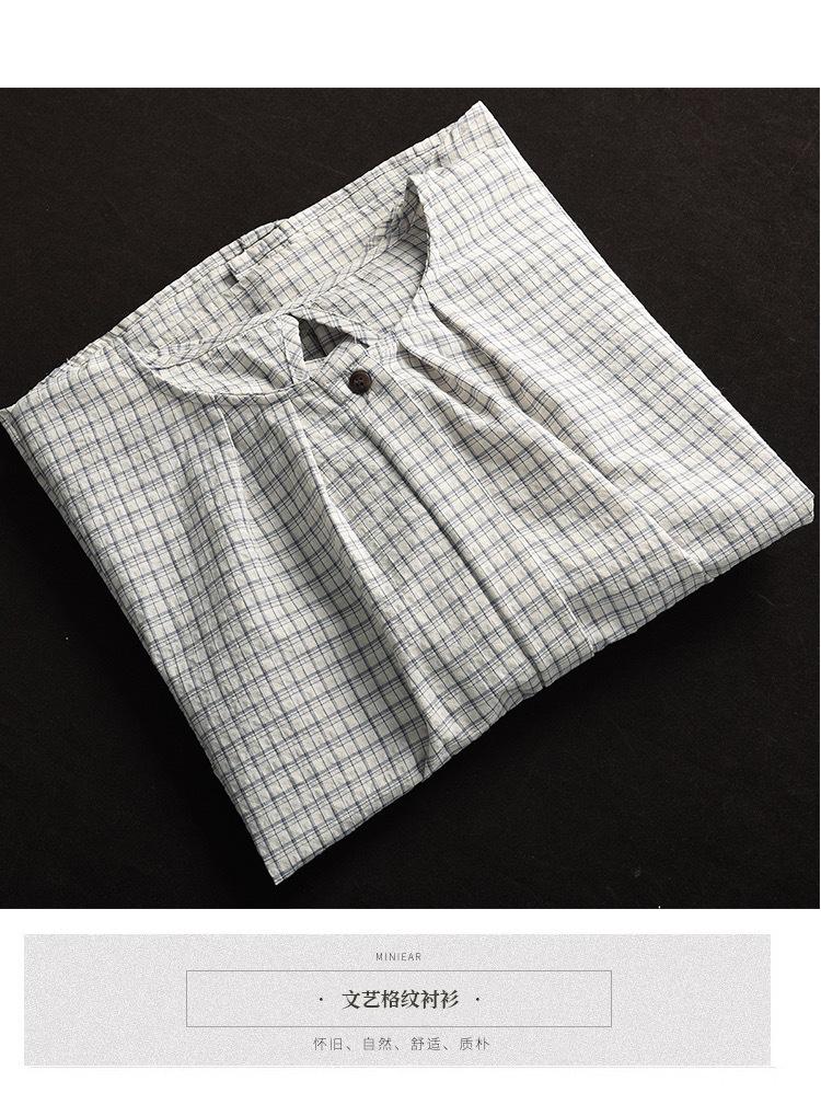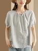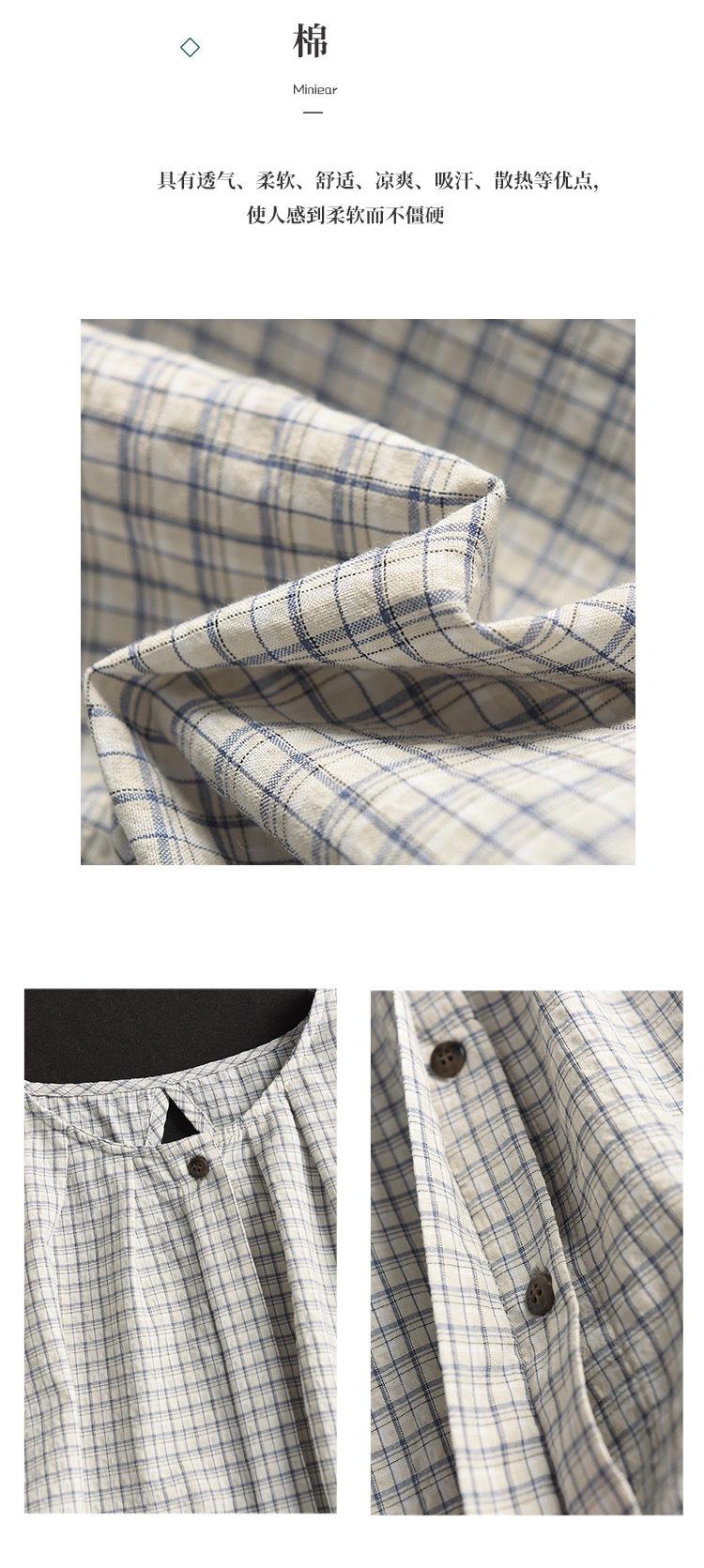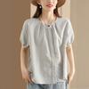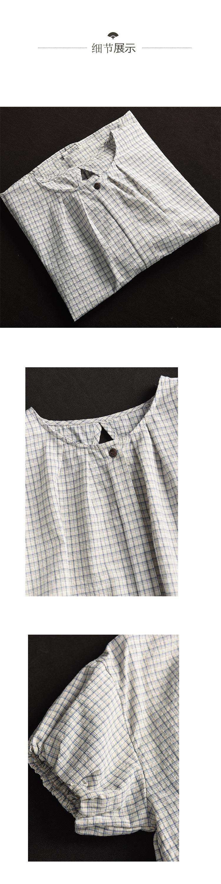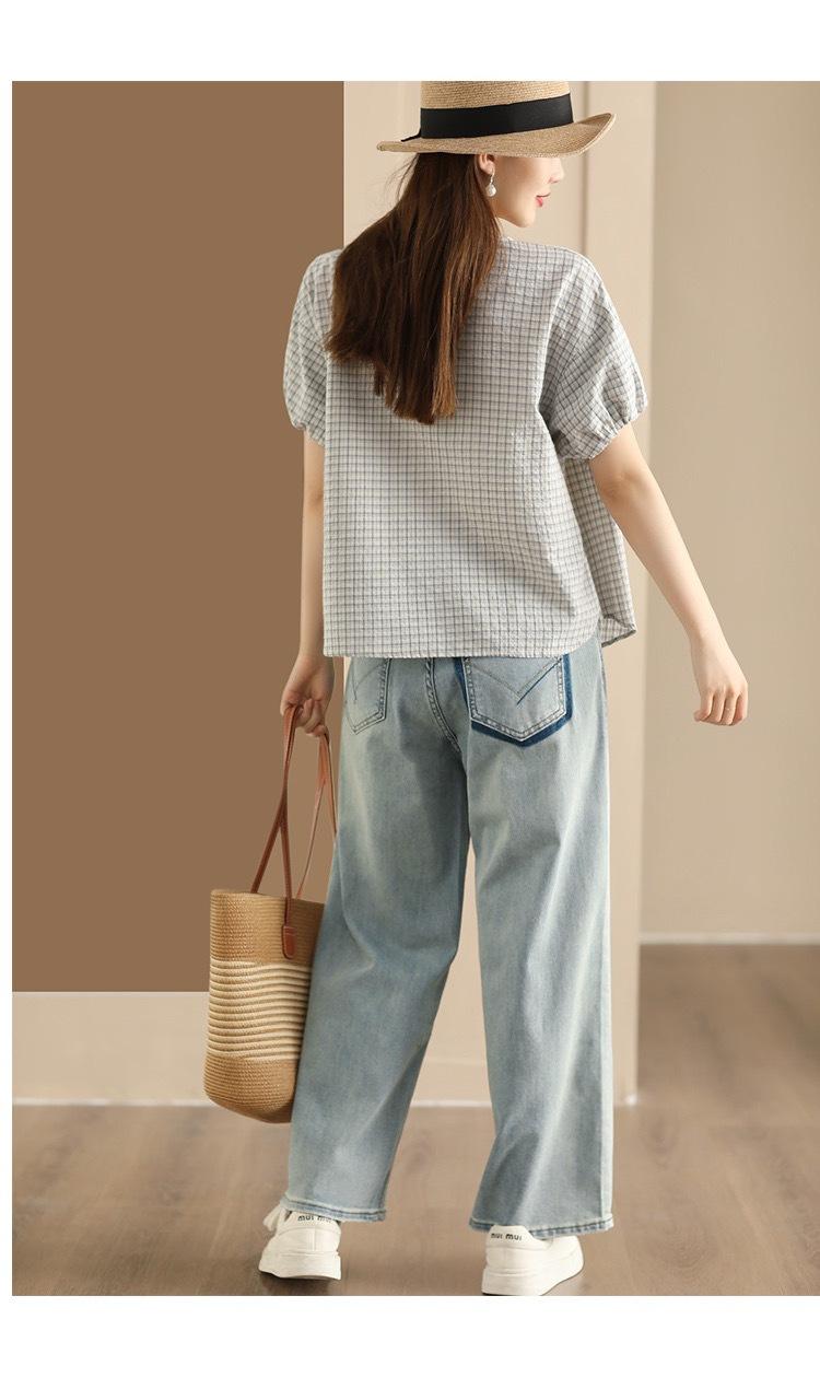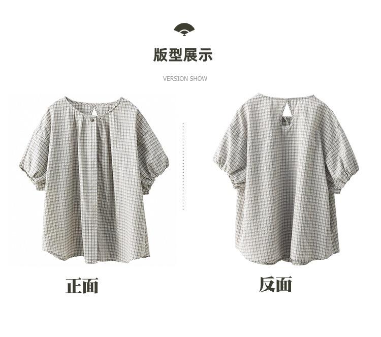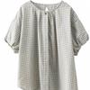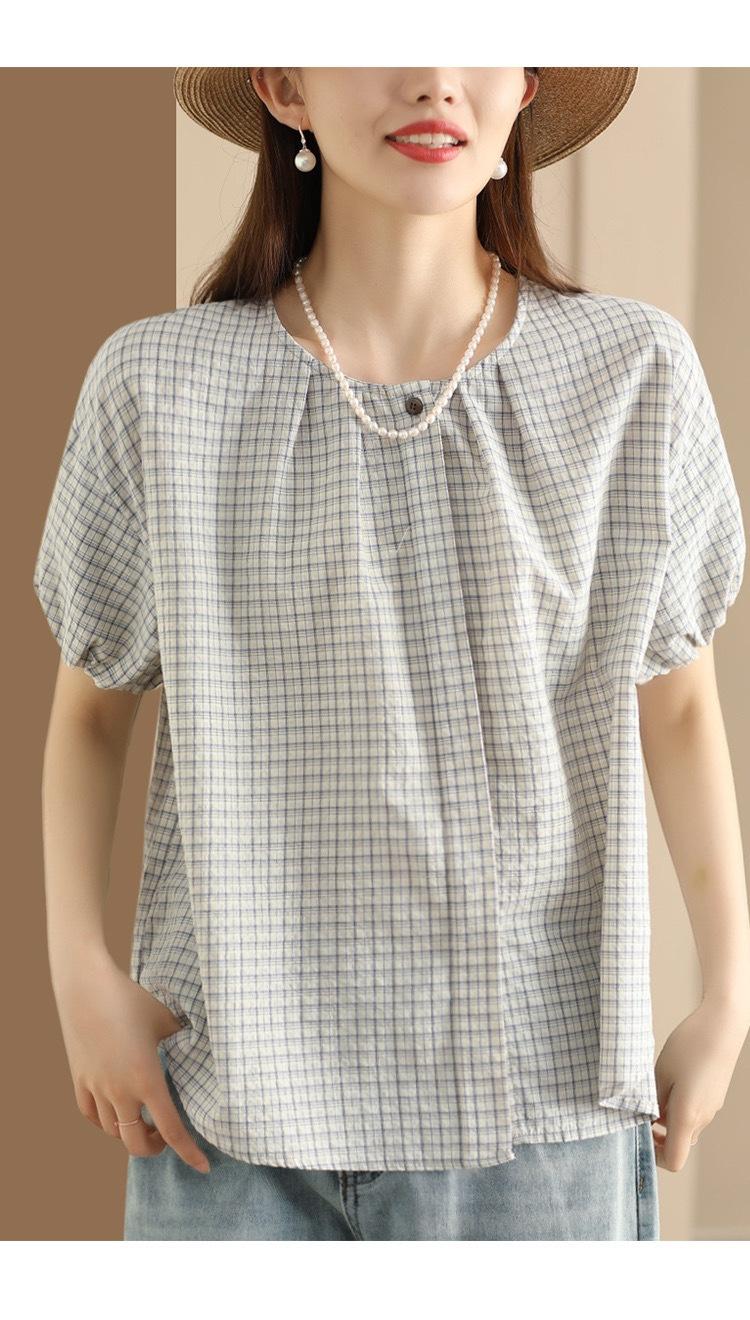 Camisa Artística de Cuadros Teñida con Hilo para Mujer, Jersey de Punto Plisado con Cuello Redondo y Manga Corta Anudado a Mano, Elegante Camisa de Cuadros