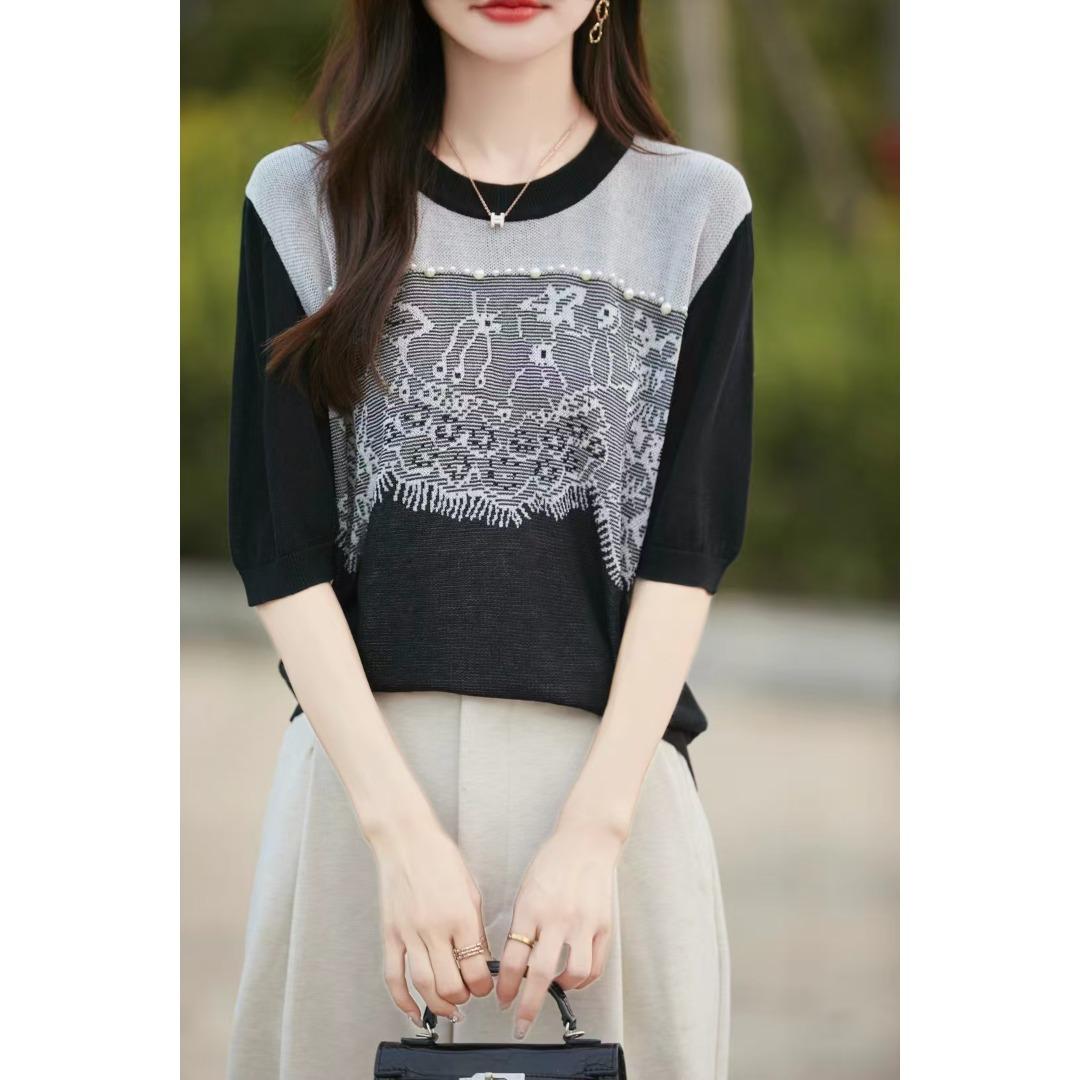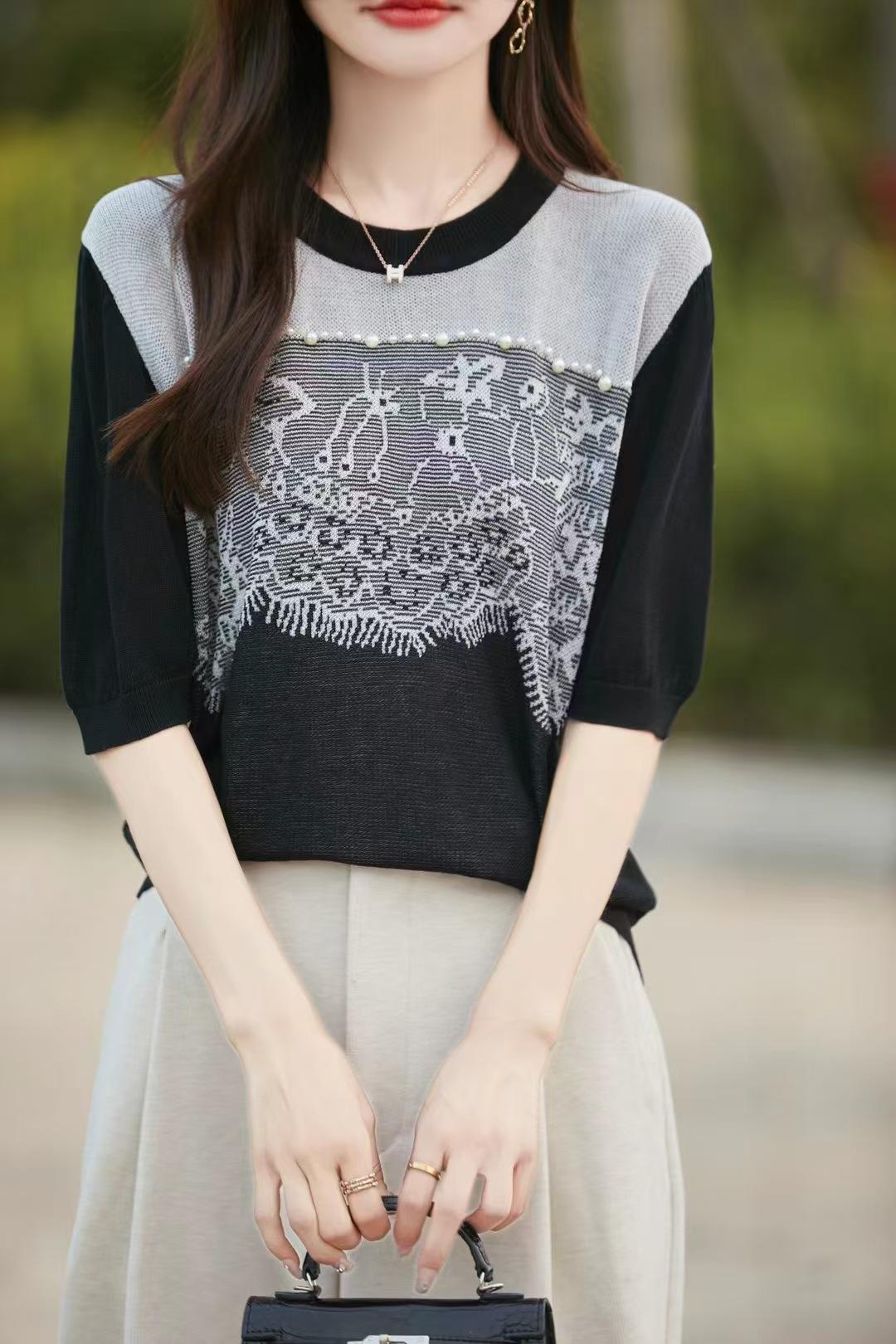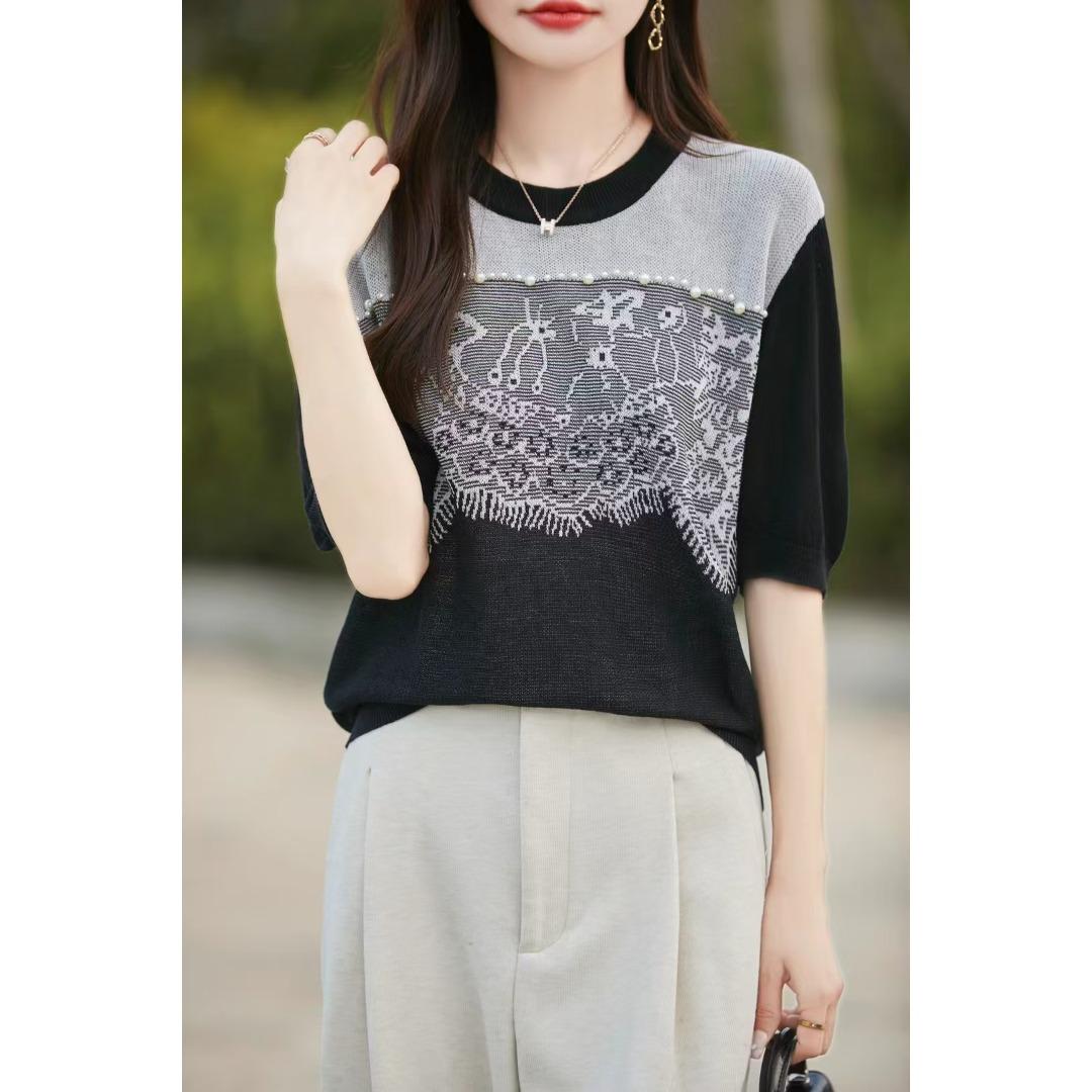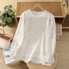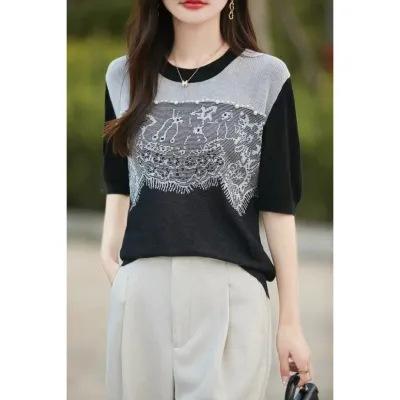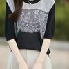 Estilo Francés Encaje Costuras Mujer 2024 Primavera y Otoño Nuevo Suelto Cuello Redondo Jersey Básico con Ropa