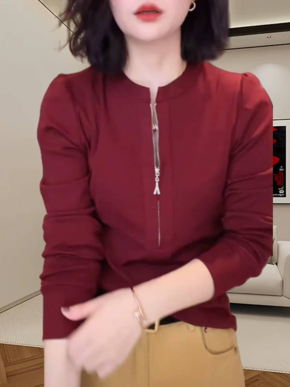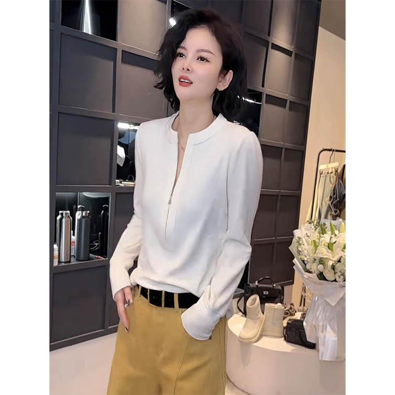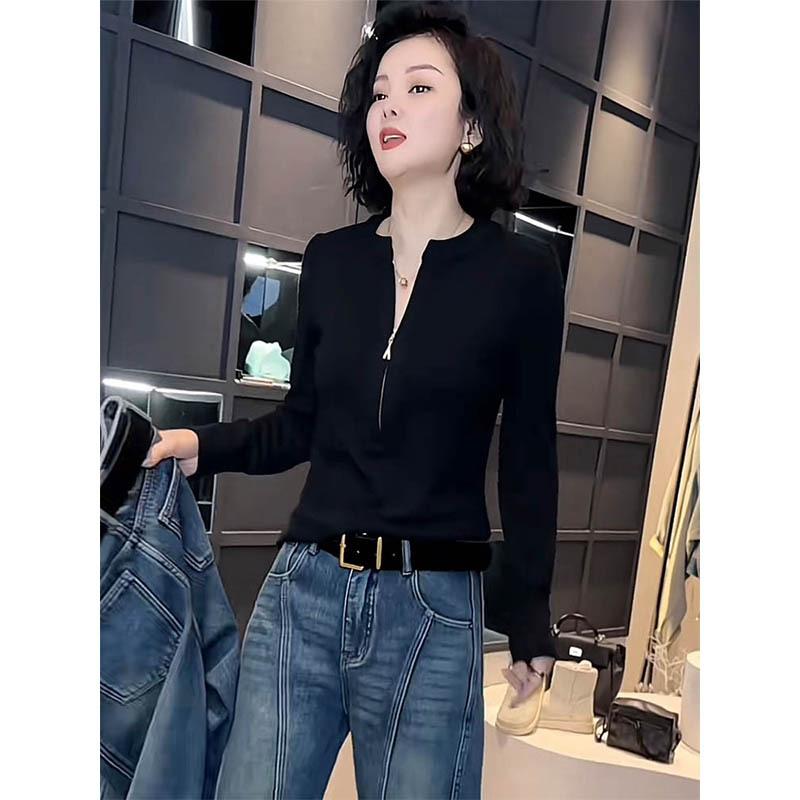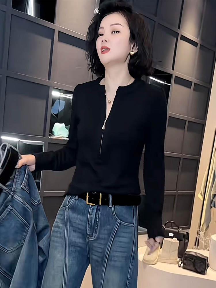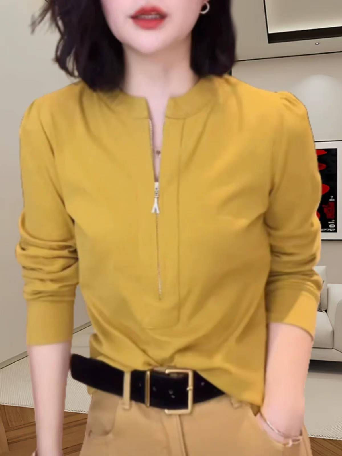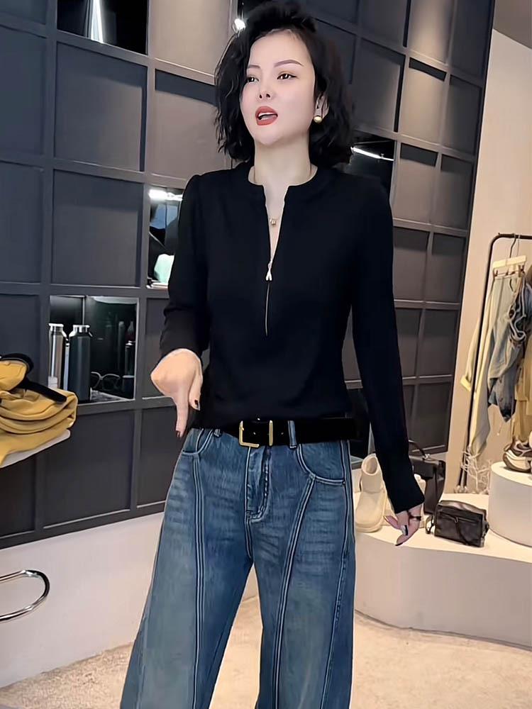 Primavera 2025 Nueva Camiseta Base de Manga Larga para Mujer Cuello Alto Versátil Adelgazante Media Cremallera Top Sencillo Tendencia