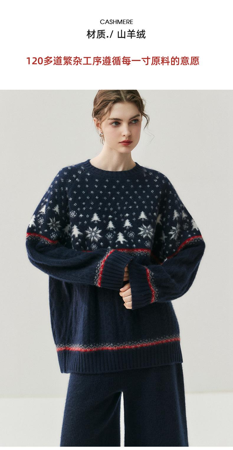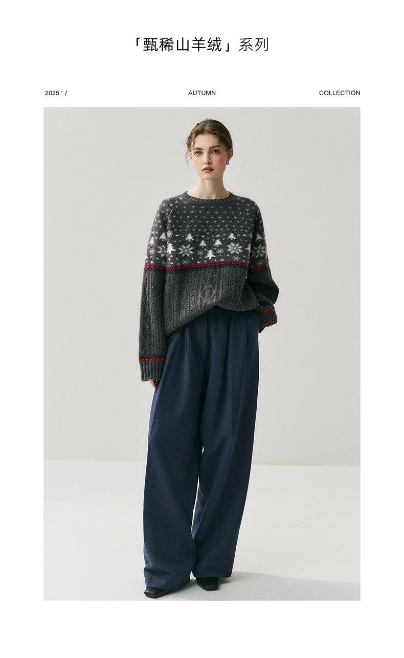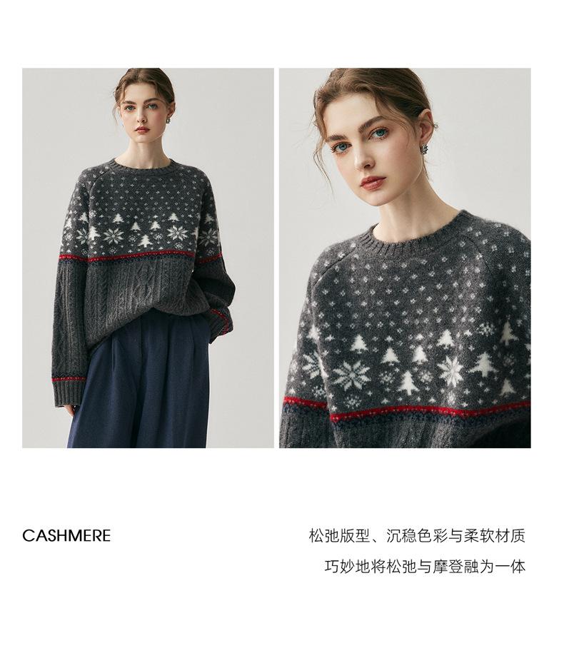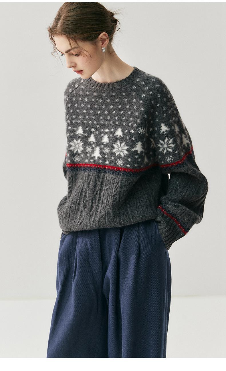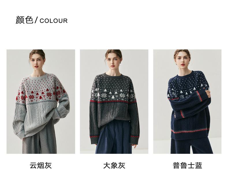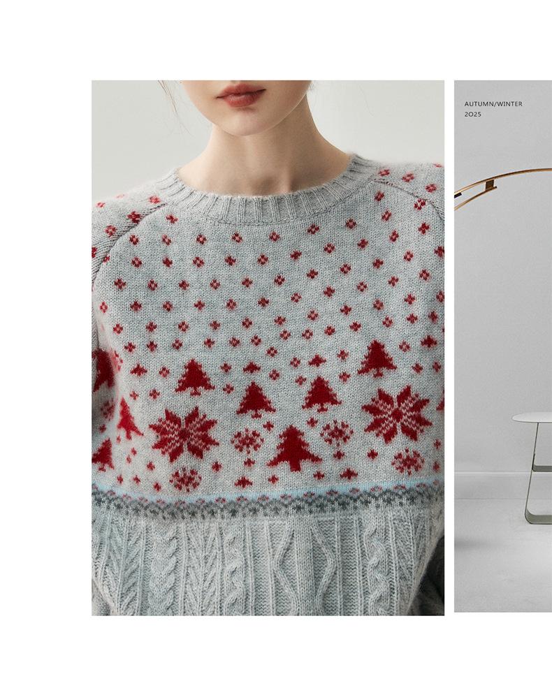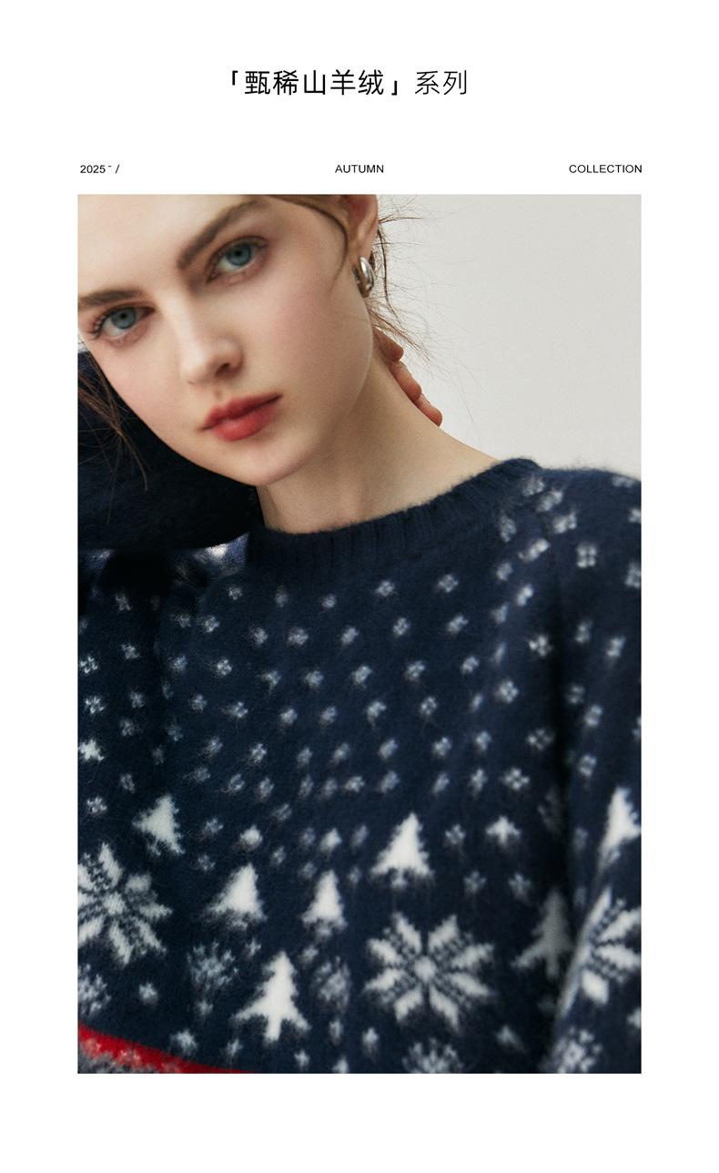 Suéter de Cachemira para Mujer Otoño/Invierno 2025 Temperamento Simple Bloque de Color Literario Cuello Redondo Manga Media Patrón de Copo de Nieve Hombro Caído
