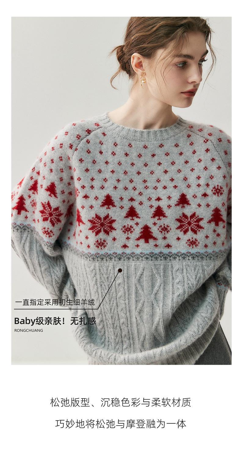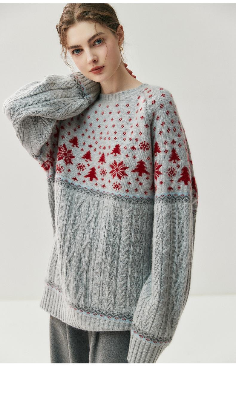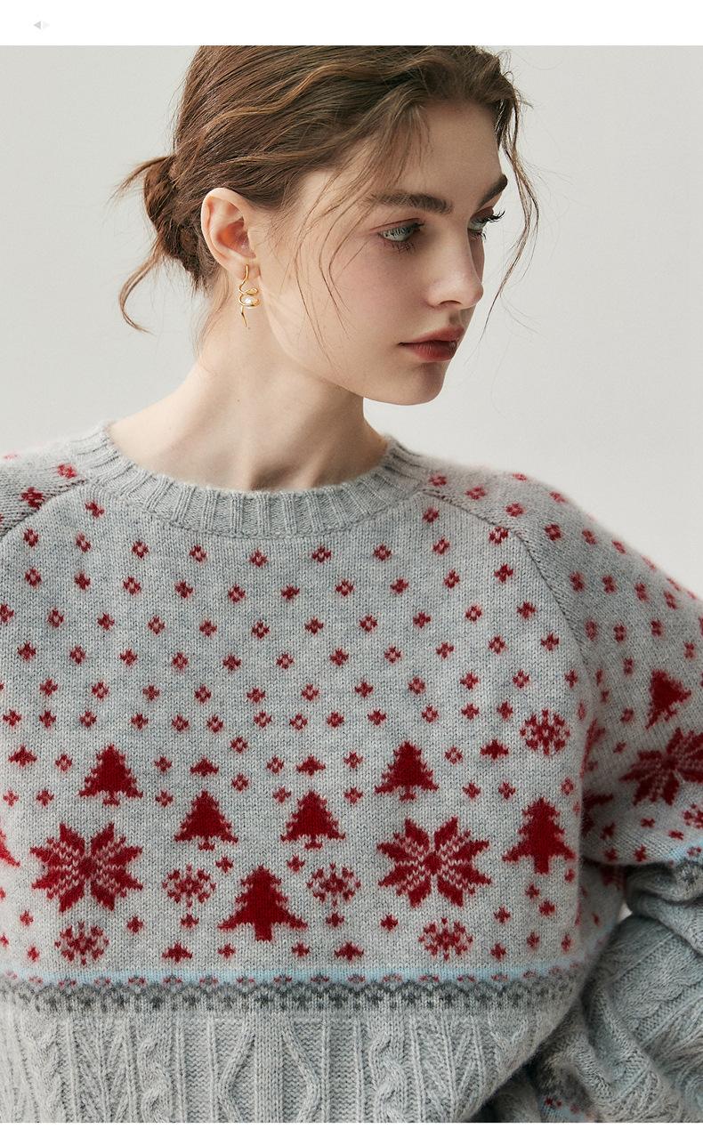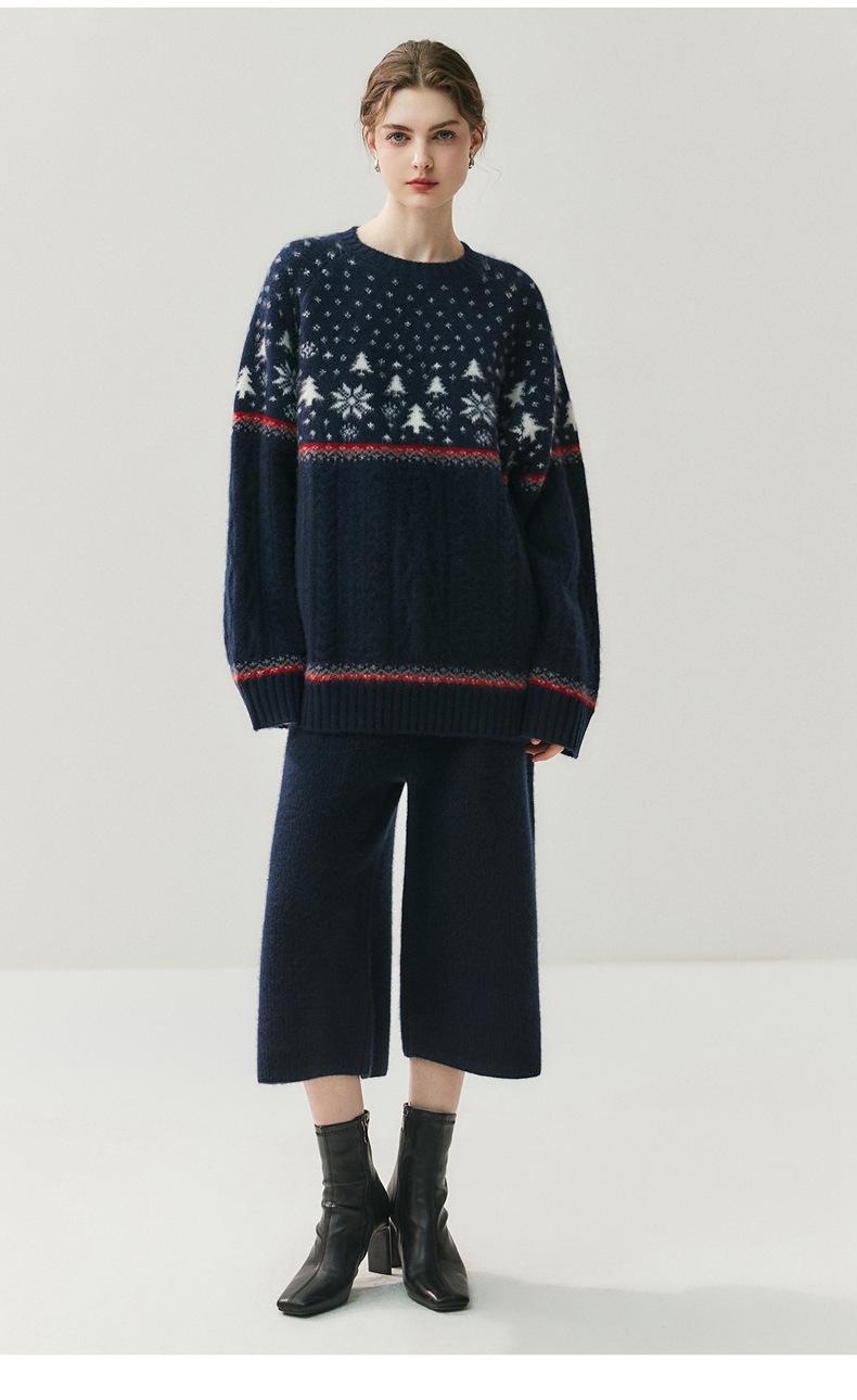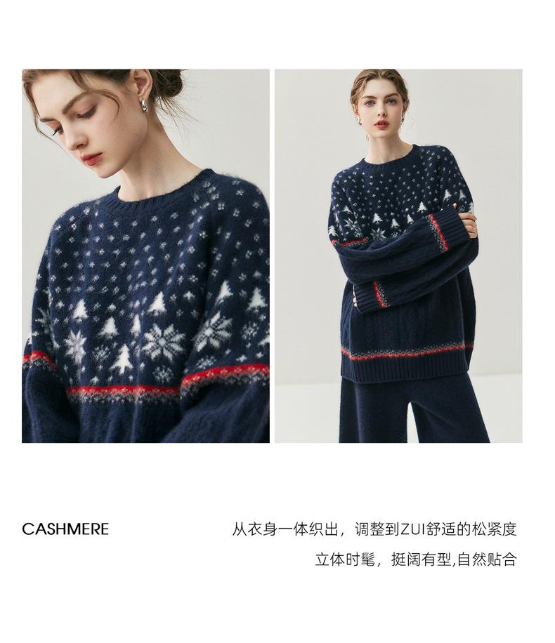 Suéter de Cachemira para Mujer Otoño/Invierno 2025 Temperamento Simple Bloque de Color Literario Cuello Redondo Manga Media Patrón de Copo de Nieve Hombro Caído