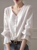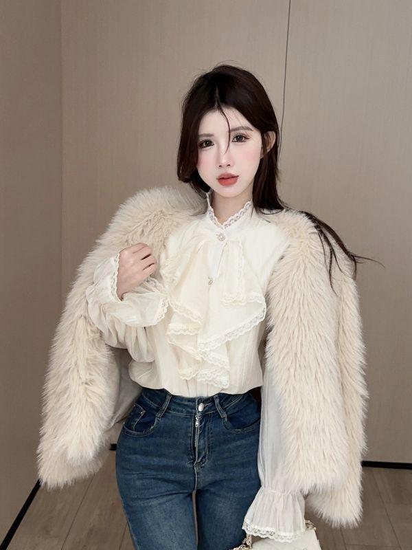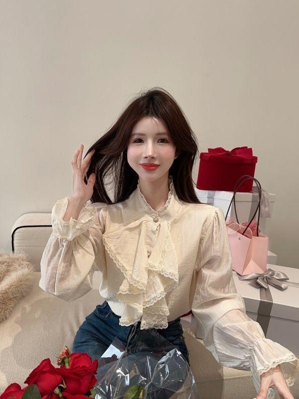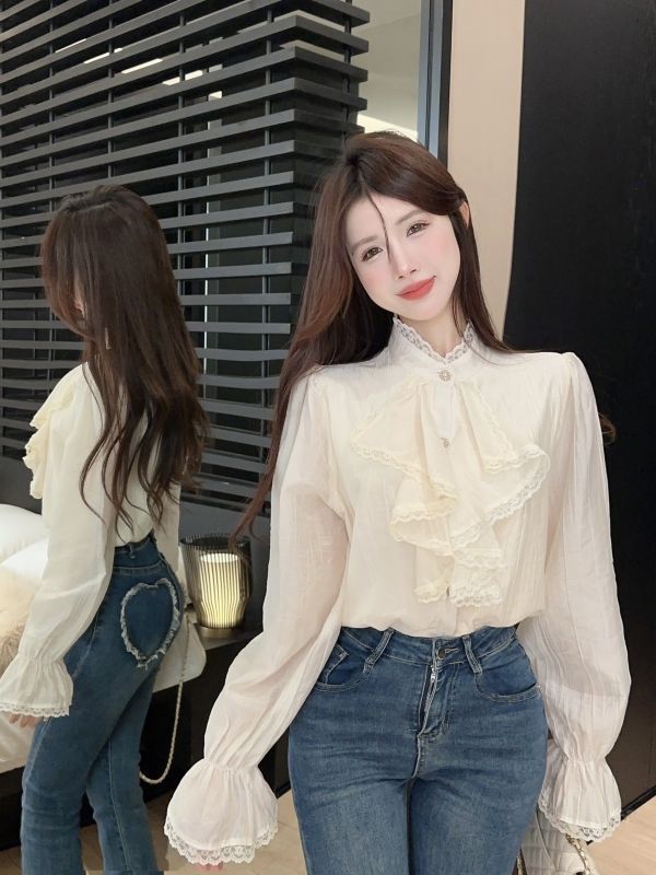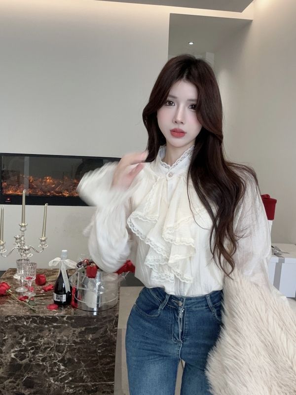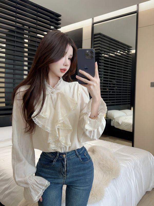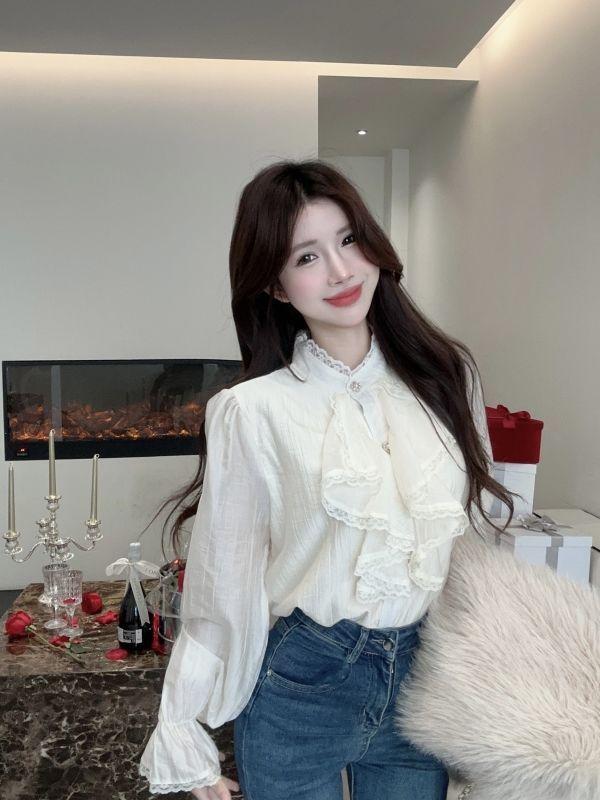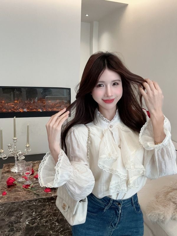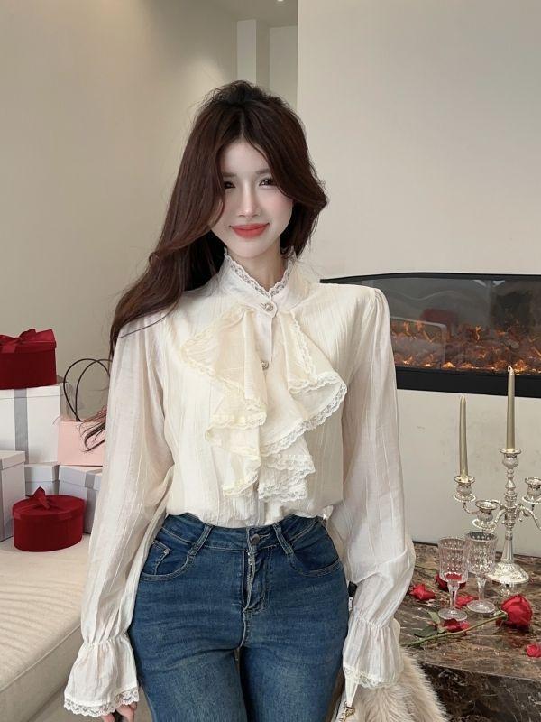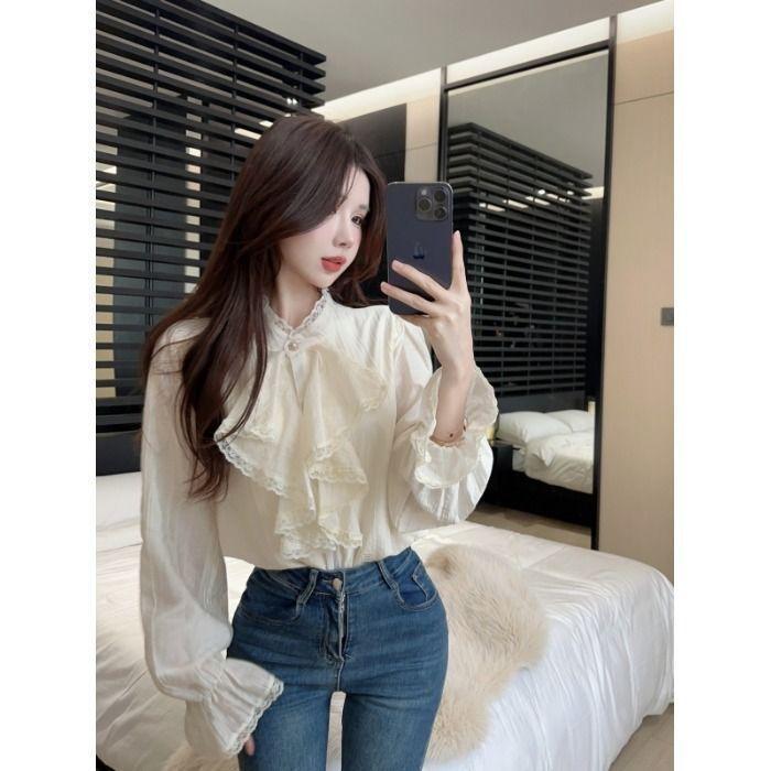 Camisa con Volantes Estilo Corte Francés Shanlida para Mujer Otoño Temprano Nueva Temperamento Encaje Empalmado Blusa Manga Larga