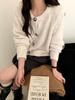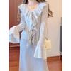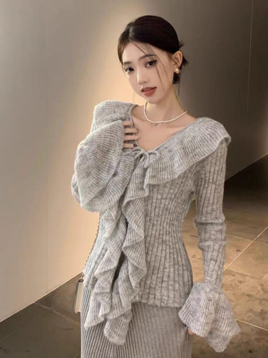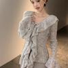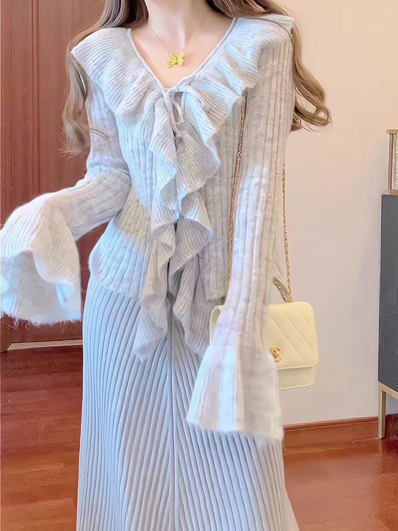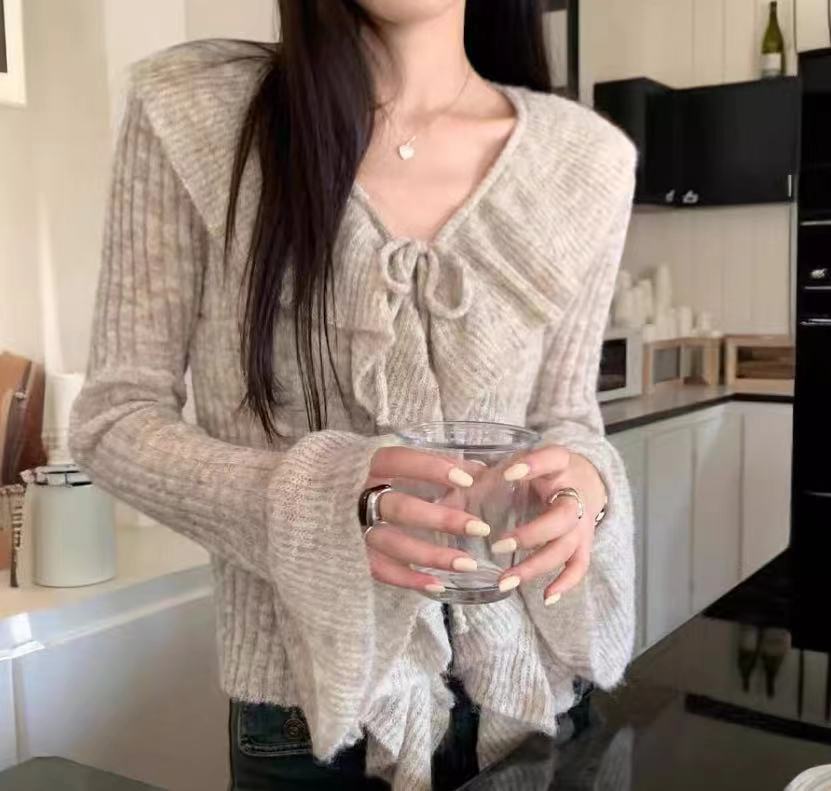 Cárdigan Top de Punto Estilo Coreano Temperamento Transfronterizo 2025 Temperamento Suave Adorno de Volantes Manga Acampanada Cuello en V