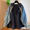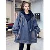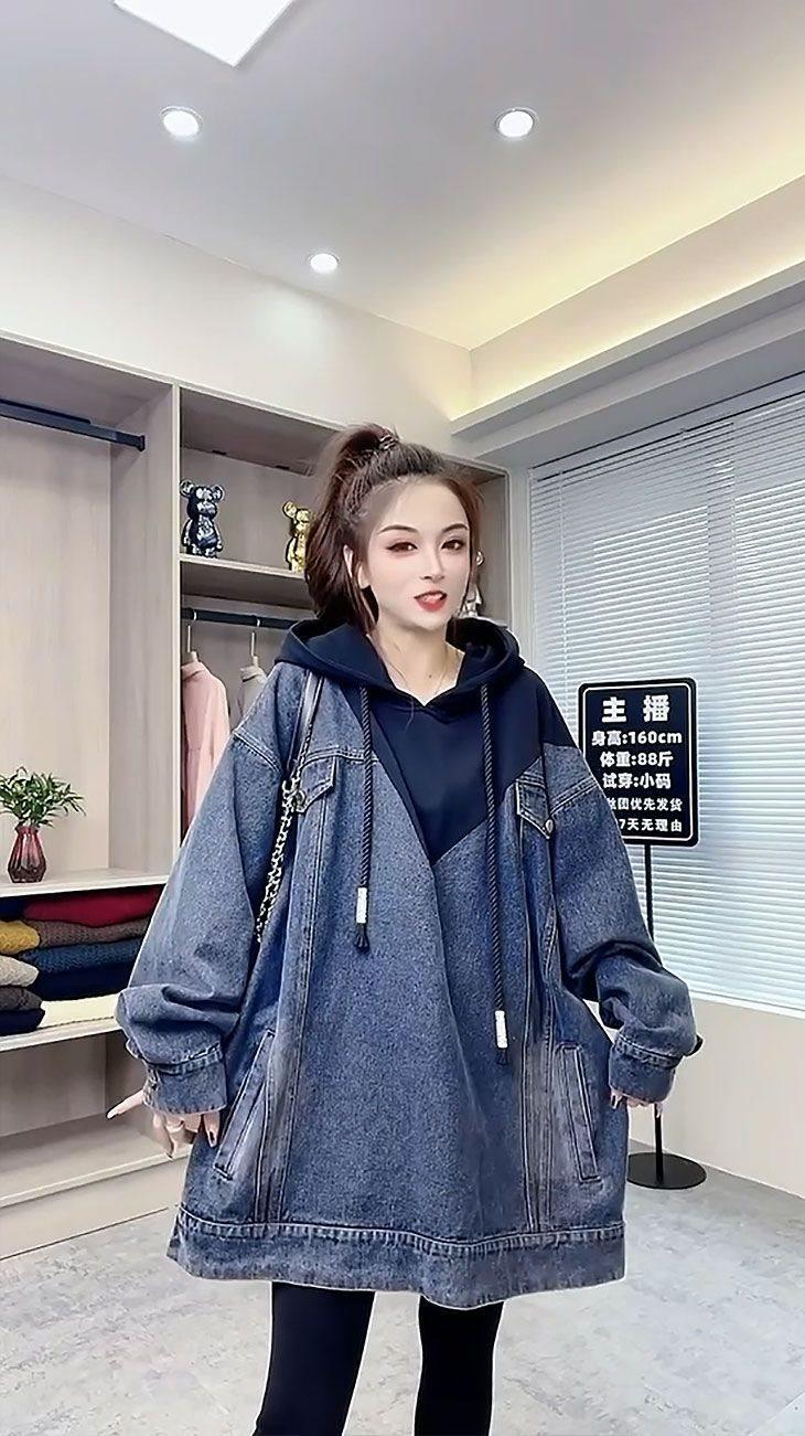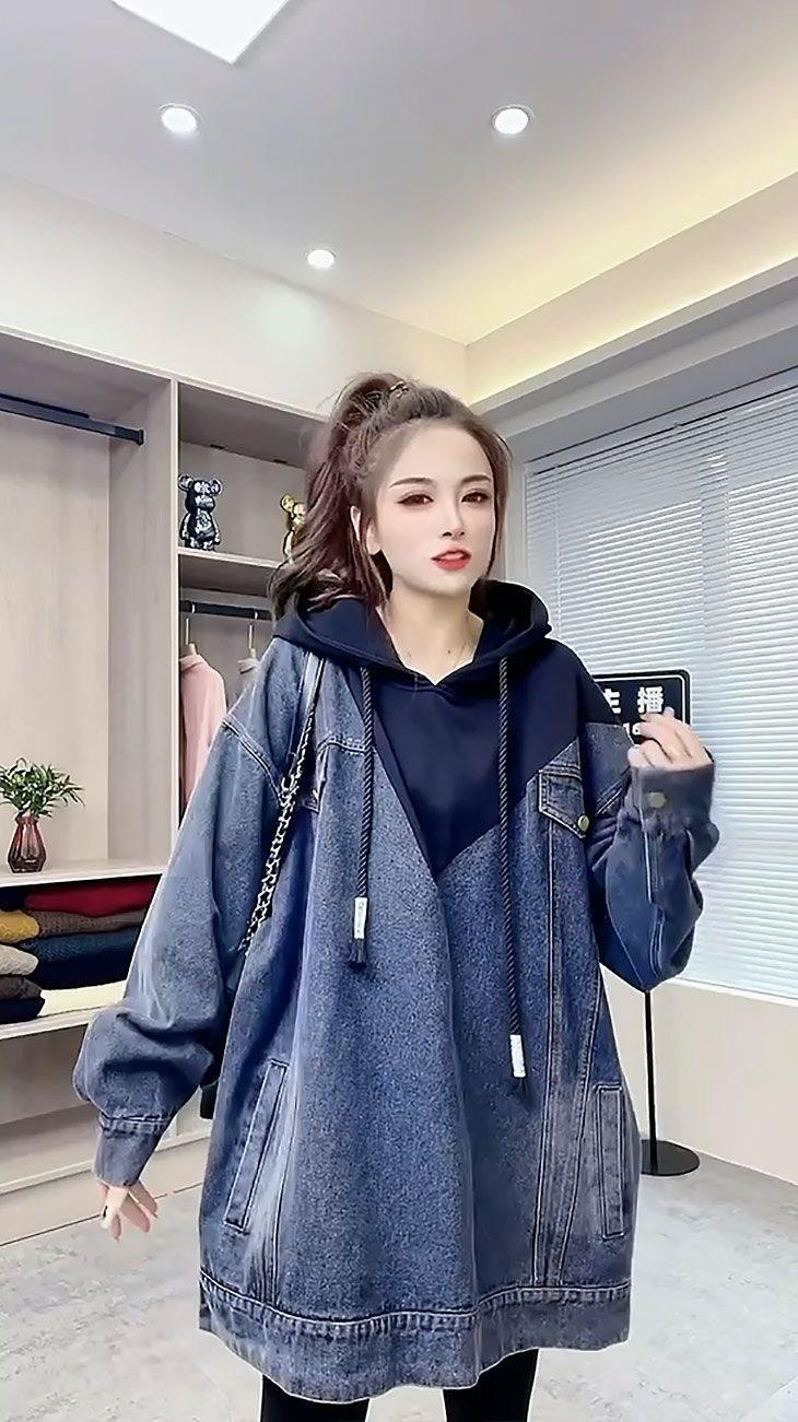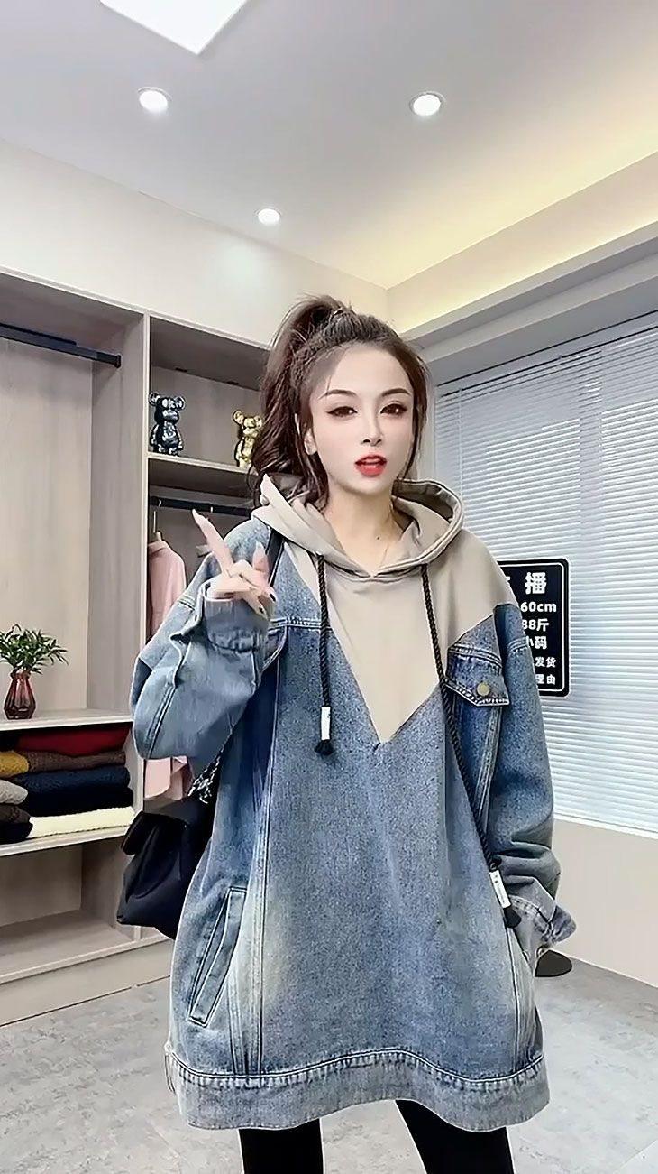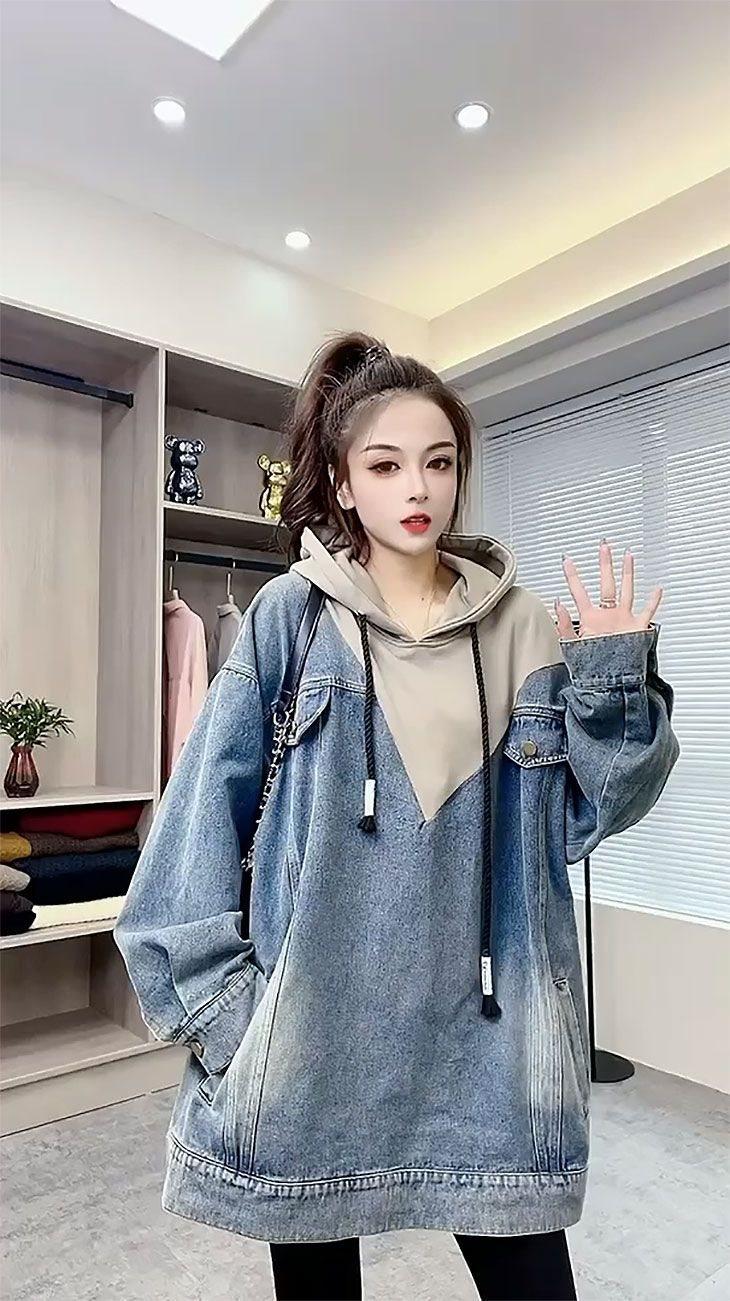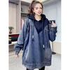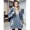 Sudadera con capucha de mezclilla patchwork de talla grande para mujer, estilo primavera y otoño, holgada, casual, a la moda, top de longitud media
