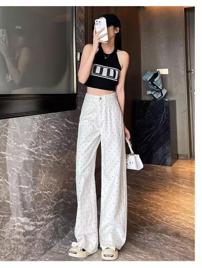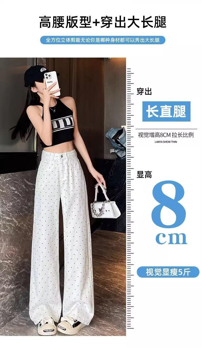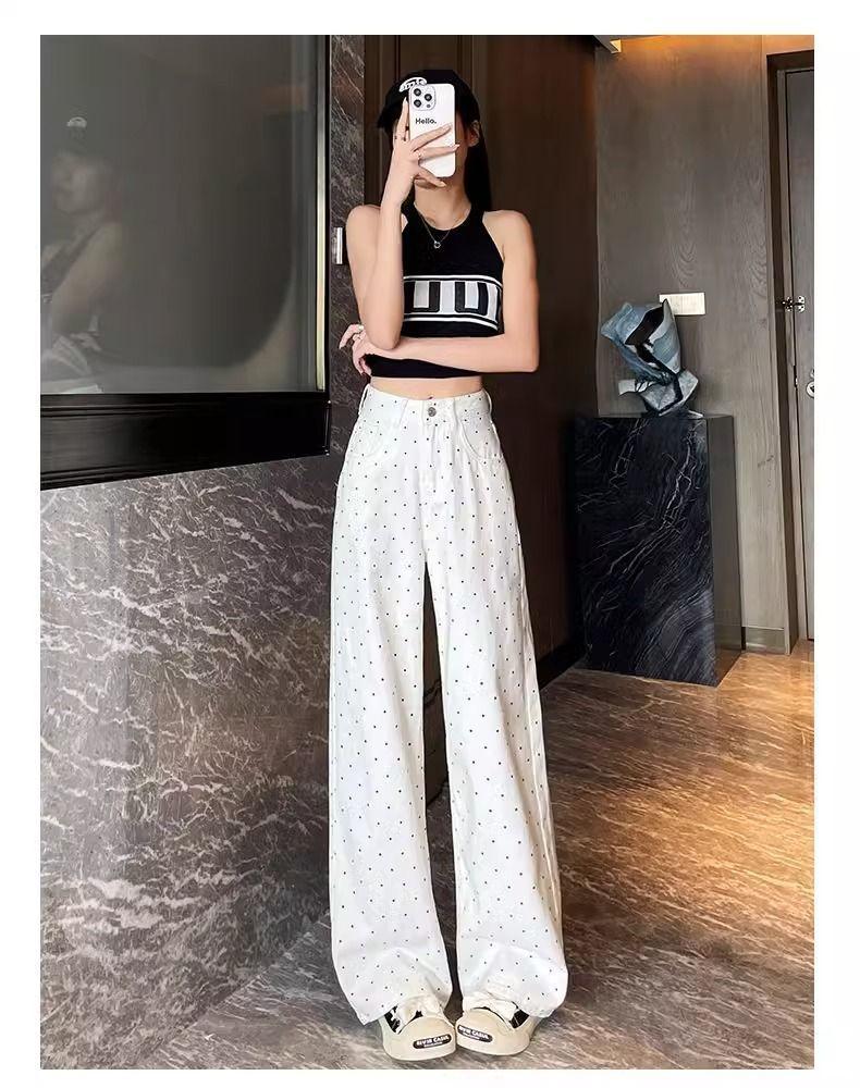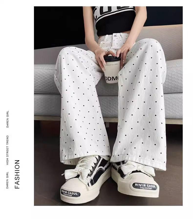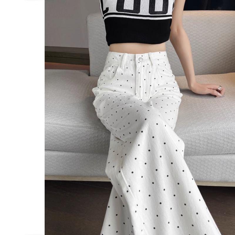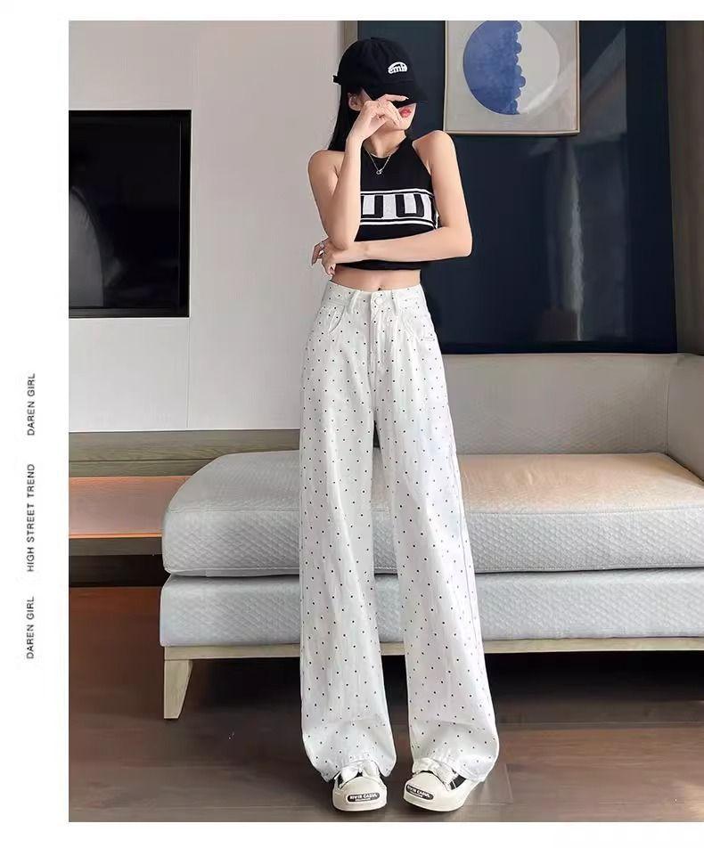 Jeans de pierna ancha florales de lunares para mujer verano delgados 2025 nuevos de cintura alta holgados blancos casuales de pierna recta pantalones largos
