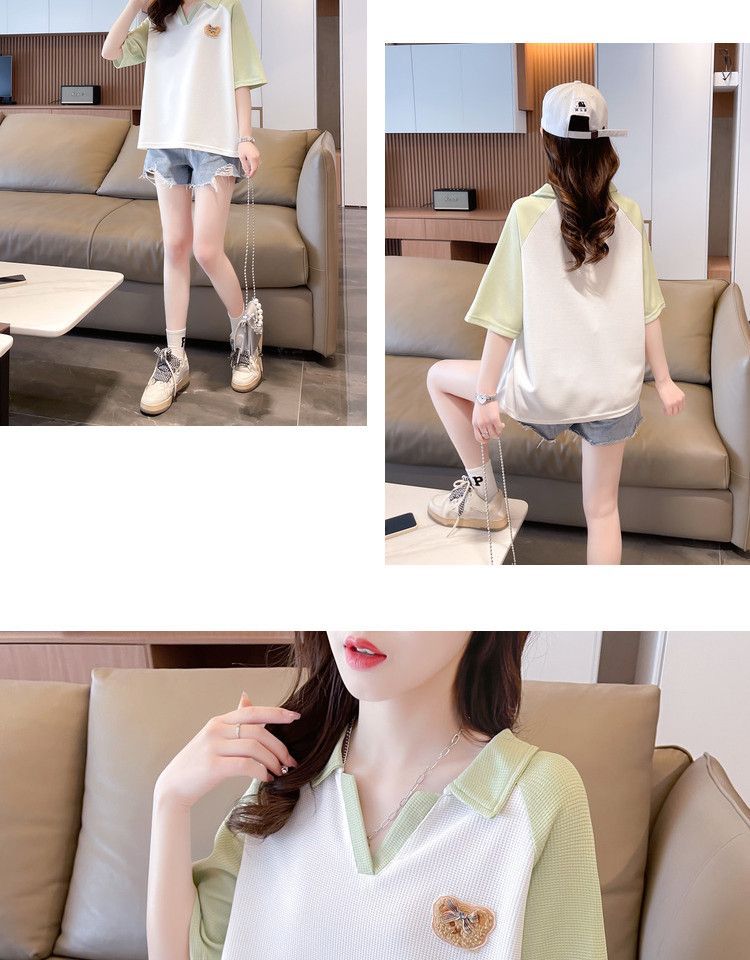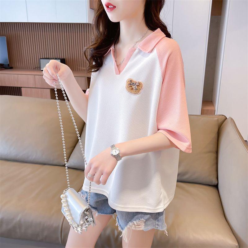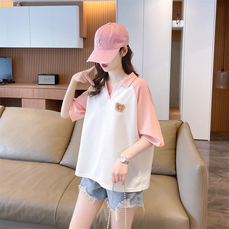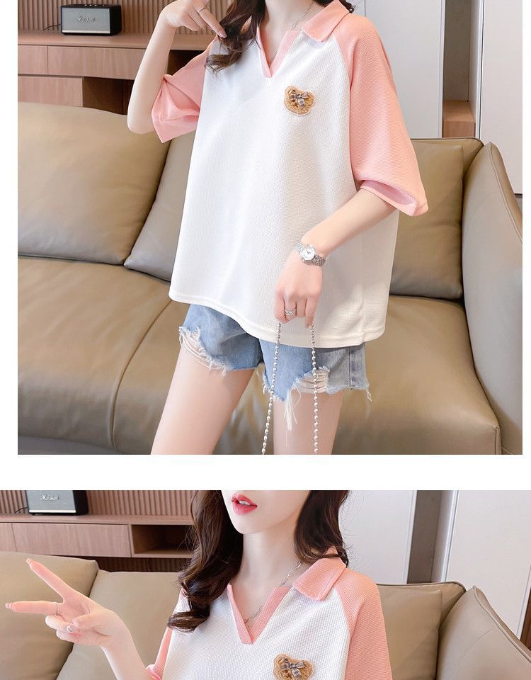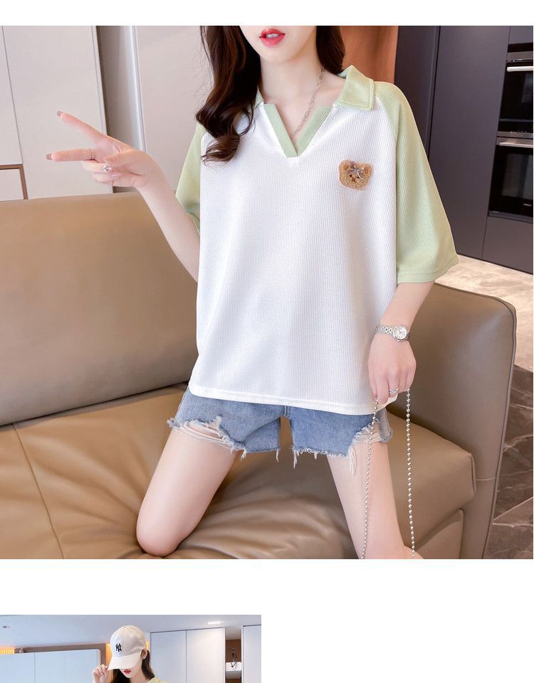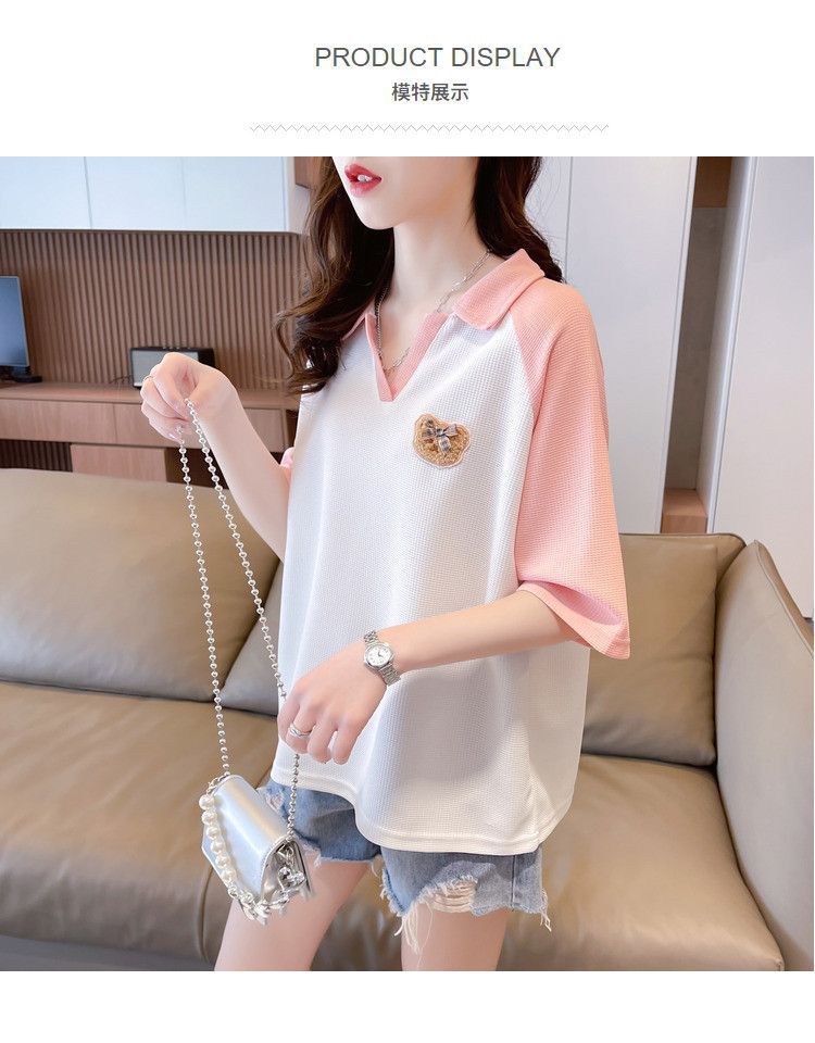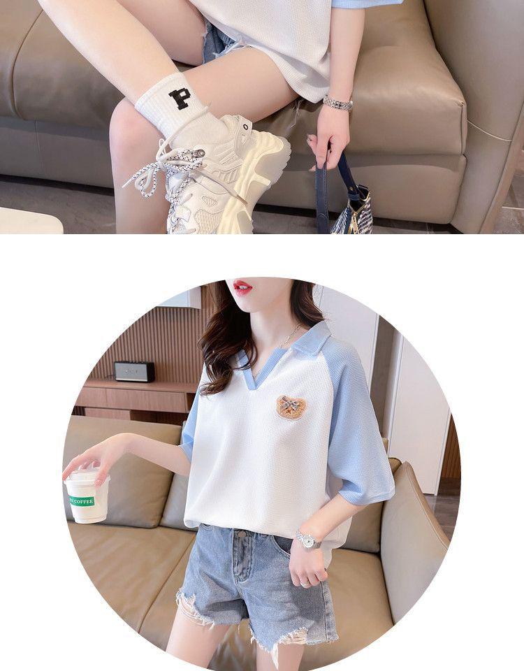 Camiseta de Manga Corta con Cuello Polo de Color Contrastante para Mujer Verano 2025 Diseño Oso Lazo Bordado Suelta Top Corto