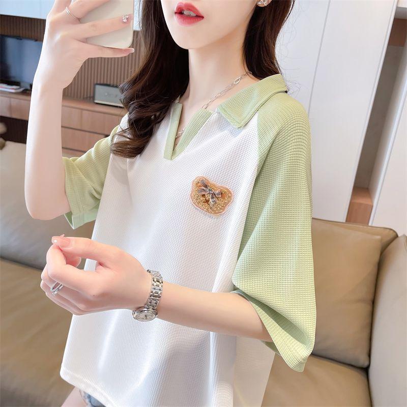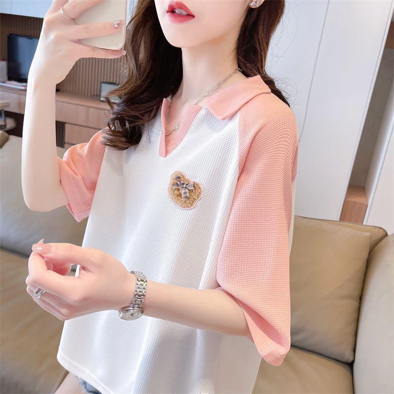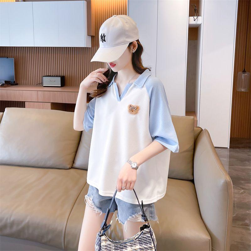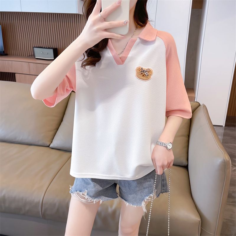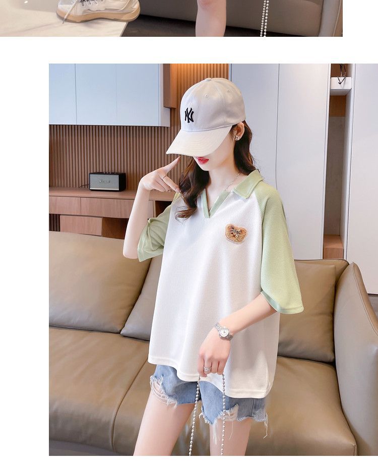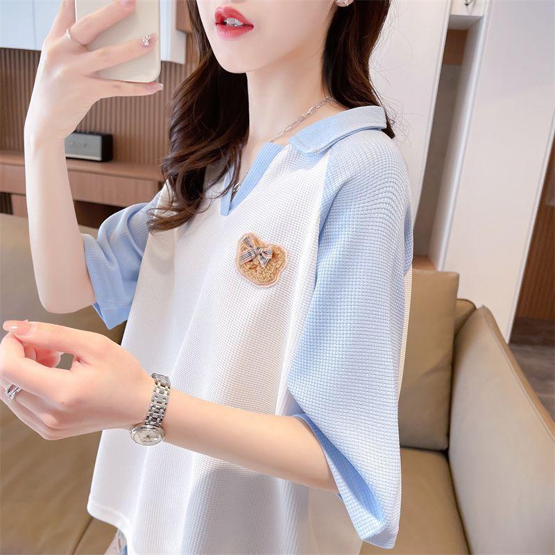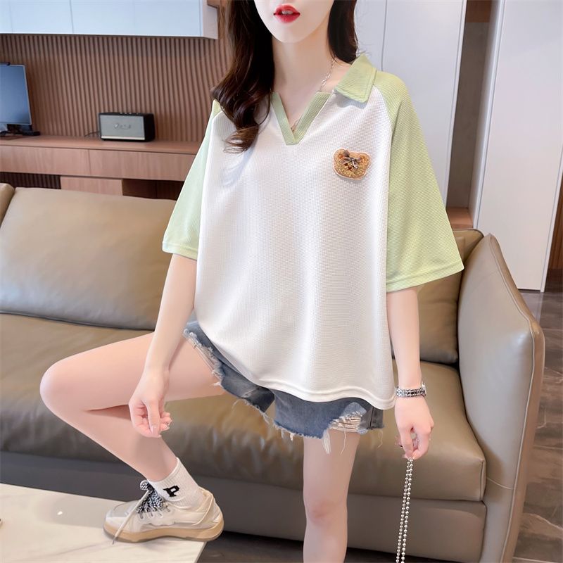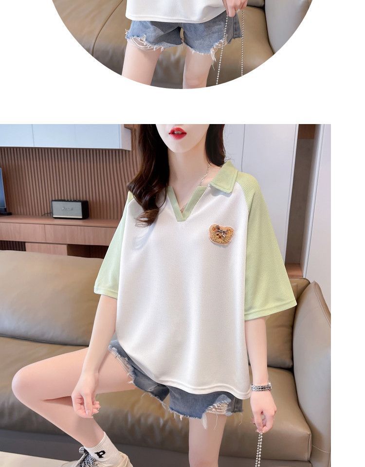 Camiseta de Manga Corta con Cuello Polo de Color Contrastante para Mujer Verano 2025 Diseño Oso Lazo Bordado Suelta Top Corto