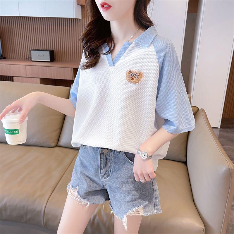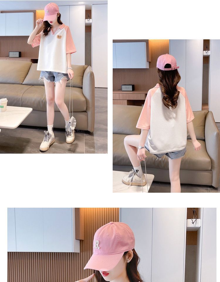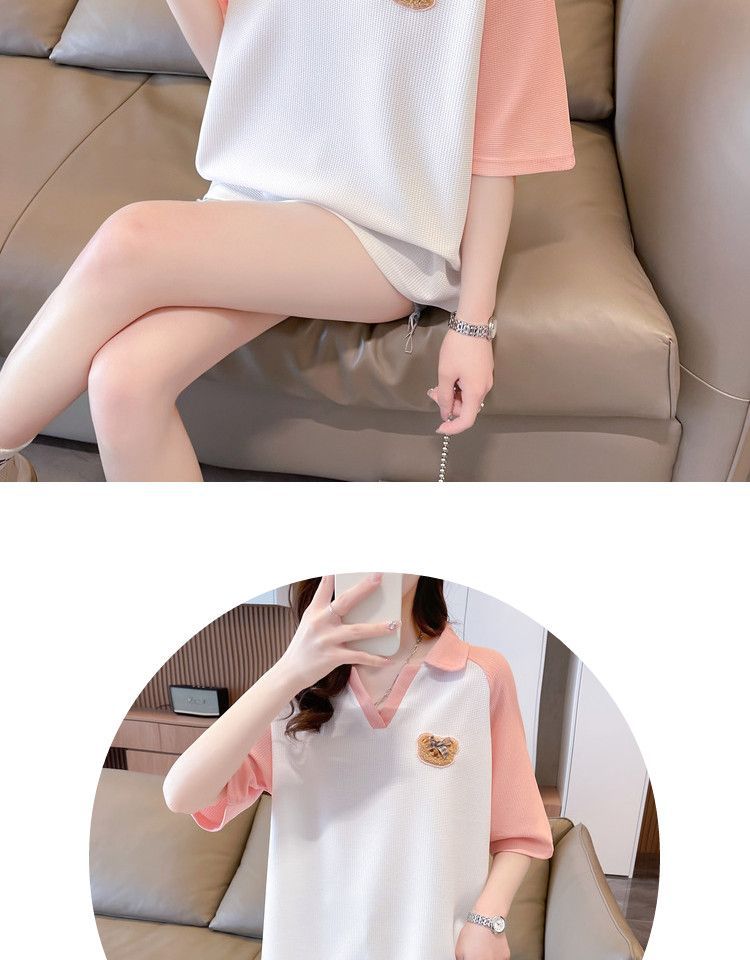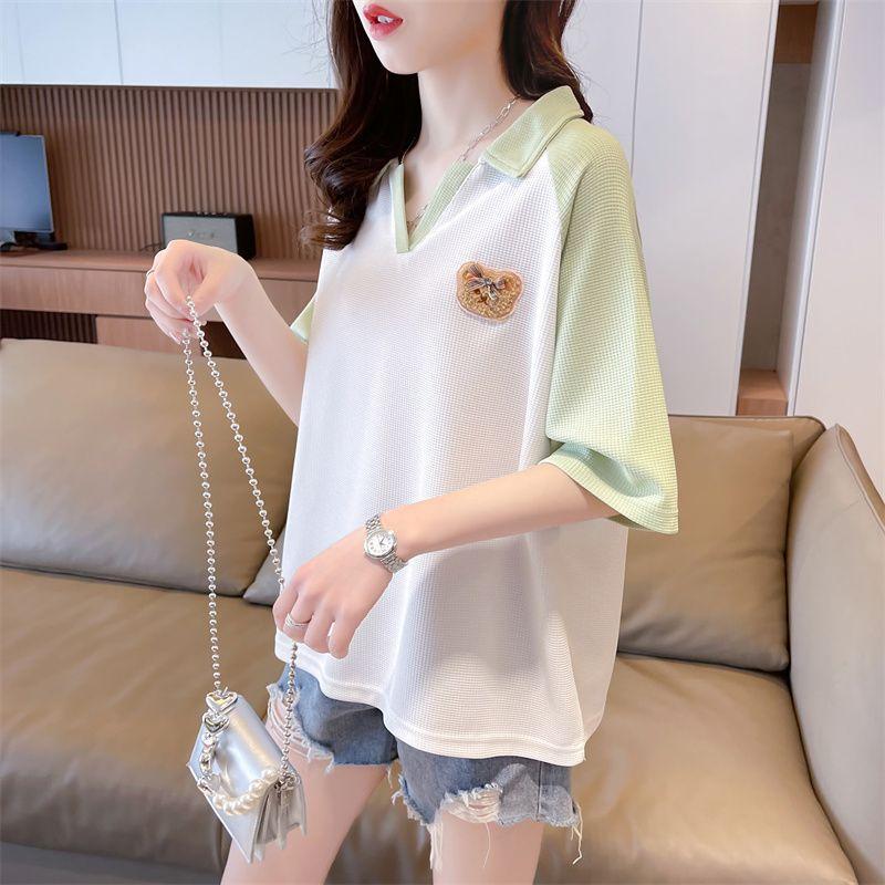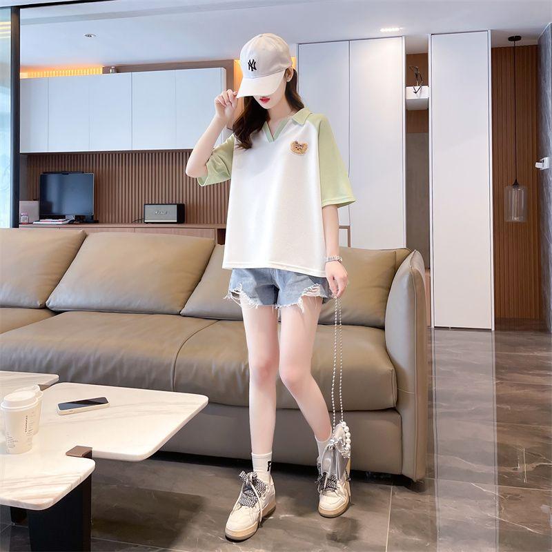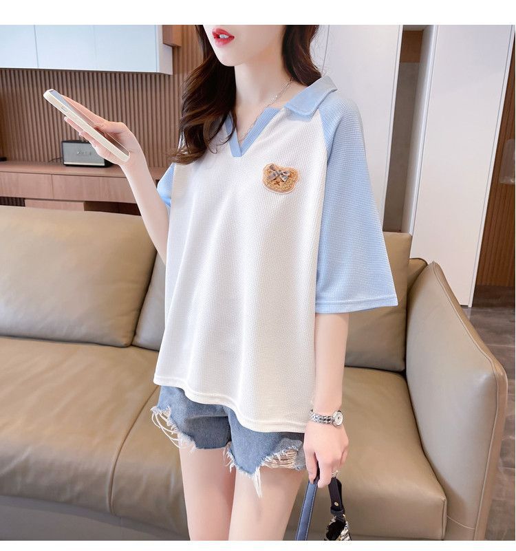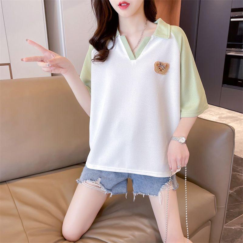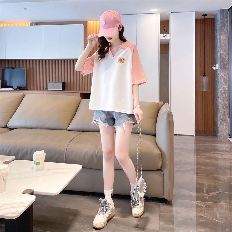 Camiseta de Manga Corta con Cuello Polo de Color Contrastante para Mujer Verano 2025 Diseño Oso Lazo Bordado Suelta Top Corto