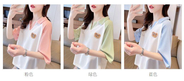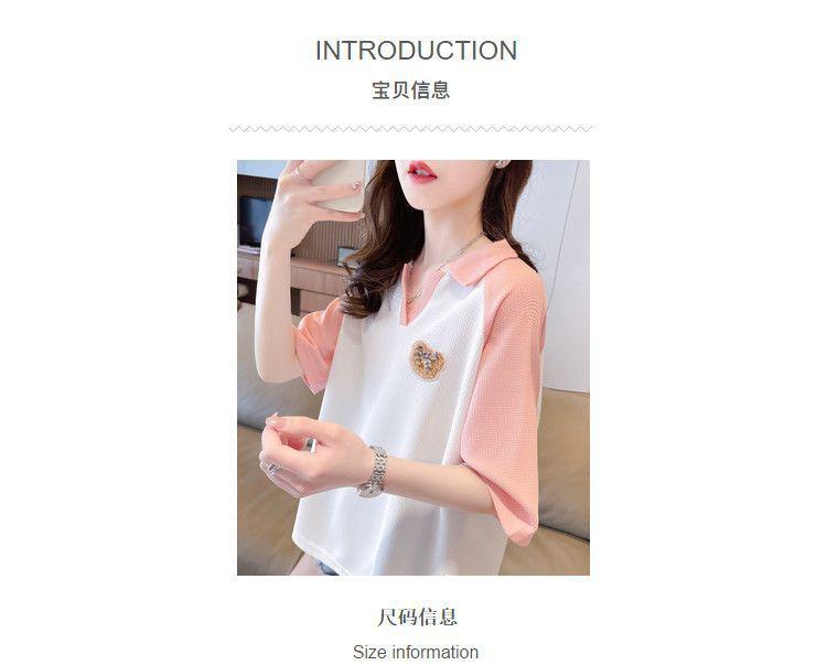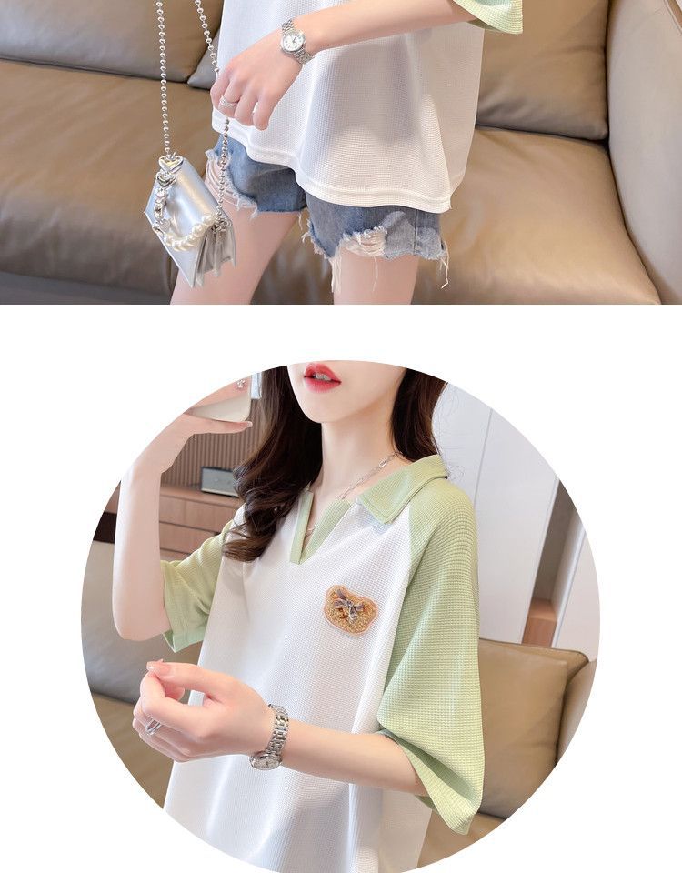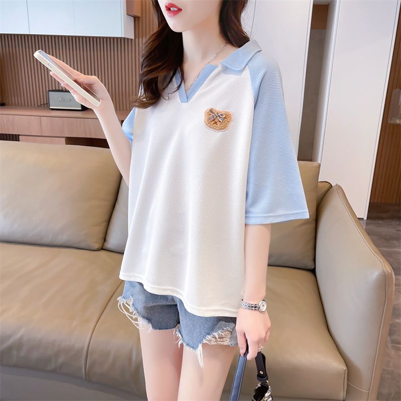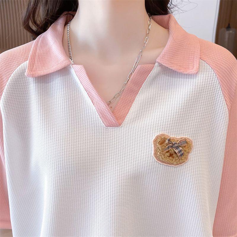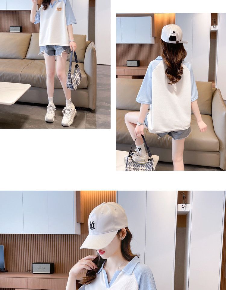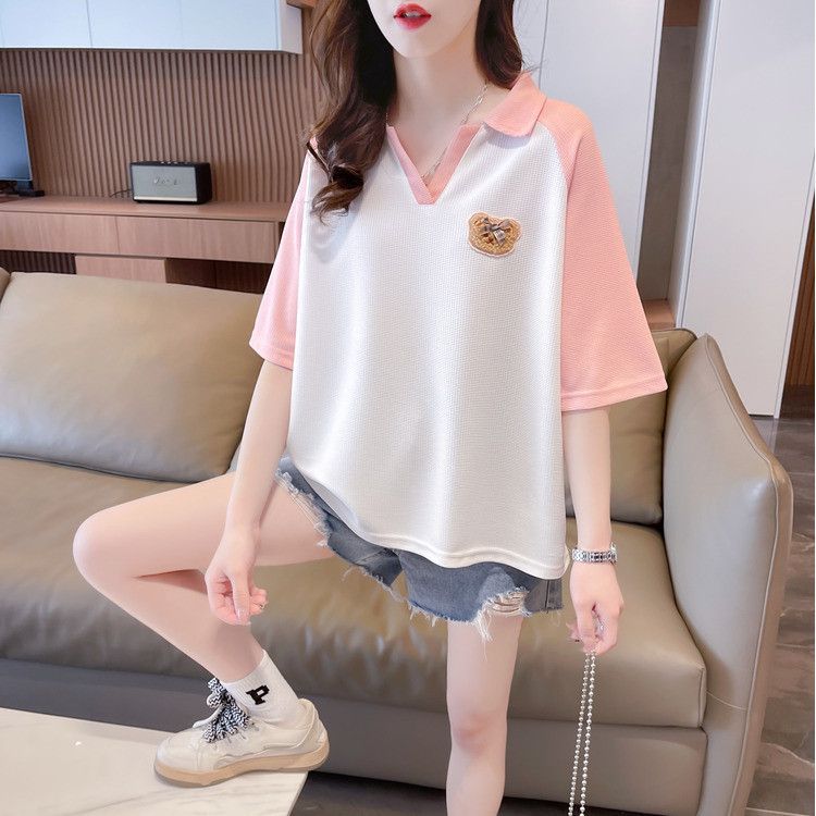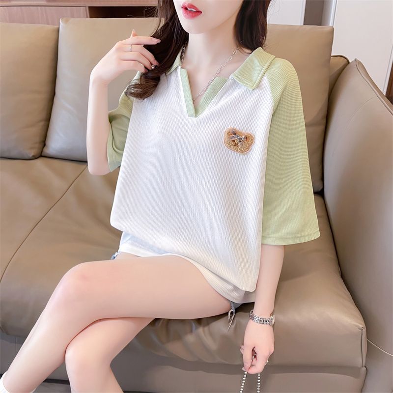 Camiseta de Manga Corta con Cuello Polo de Color Contrastante para Mujer Verano 2025 Diseño Oso Lazo Bordado Suelta Top Corto