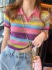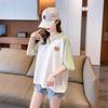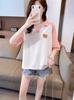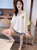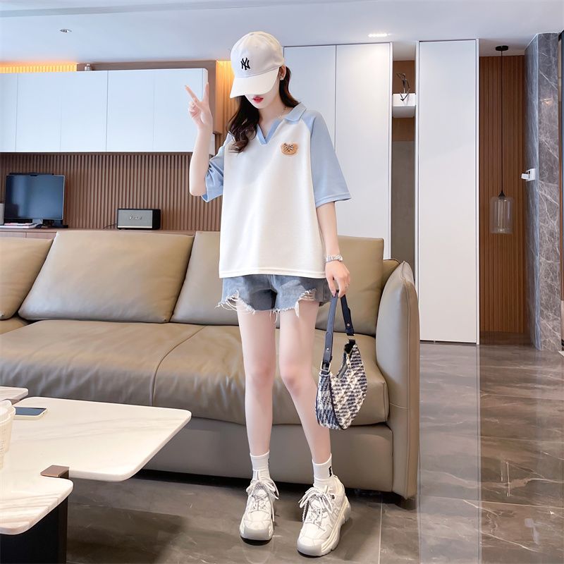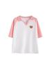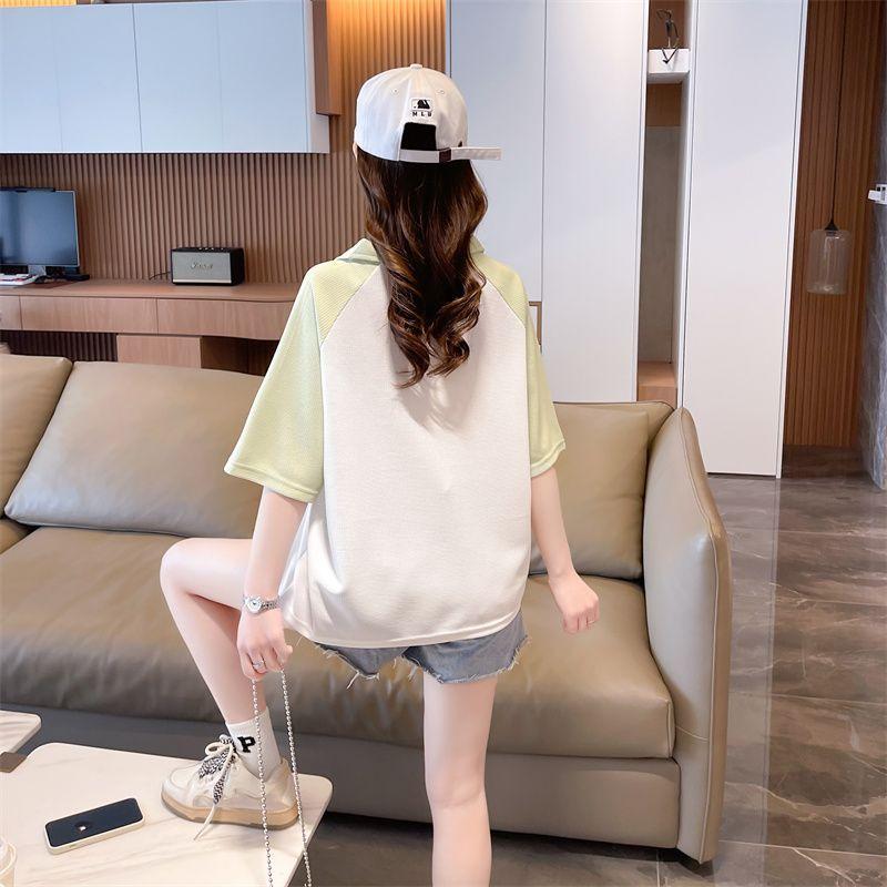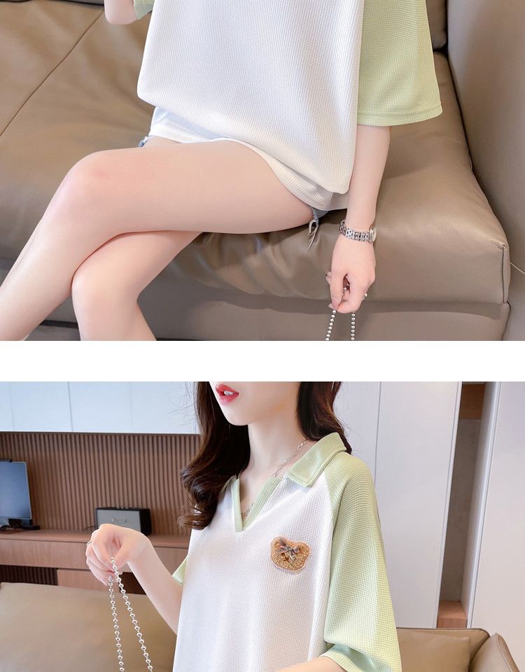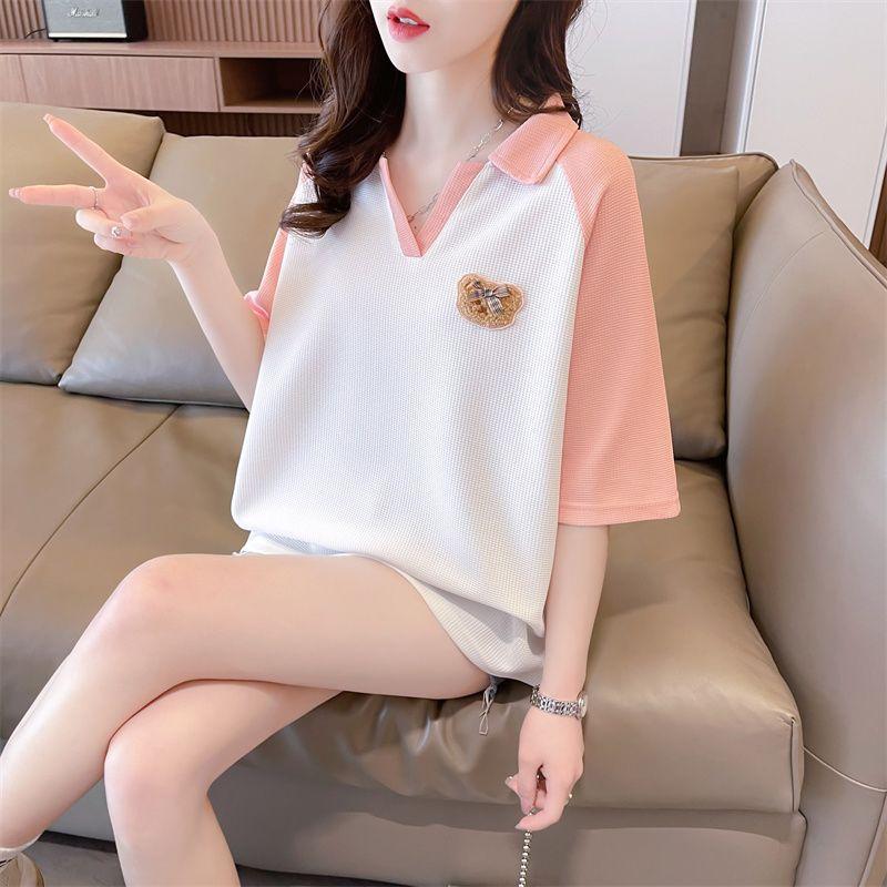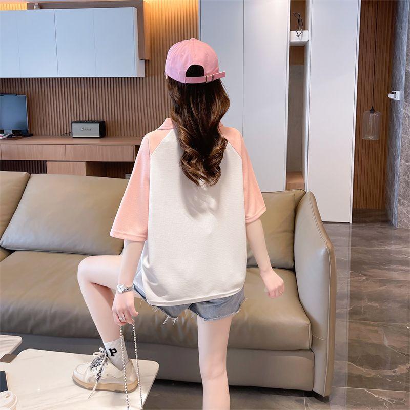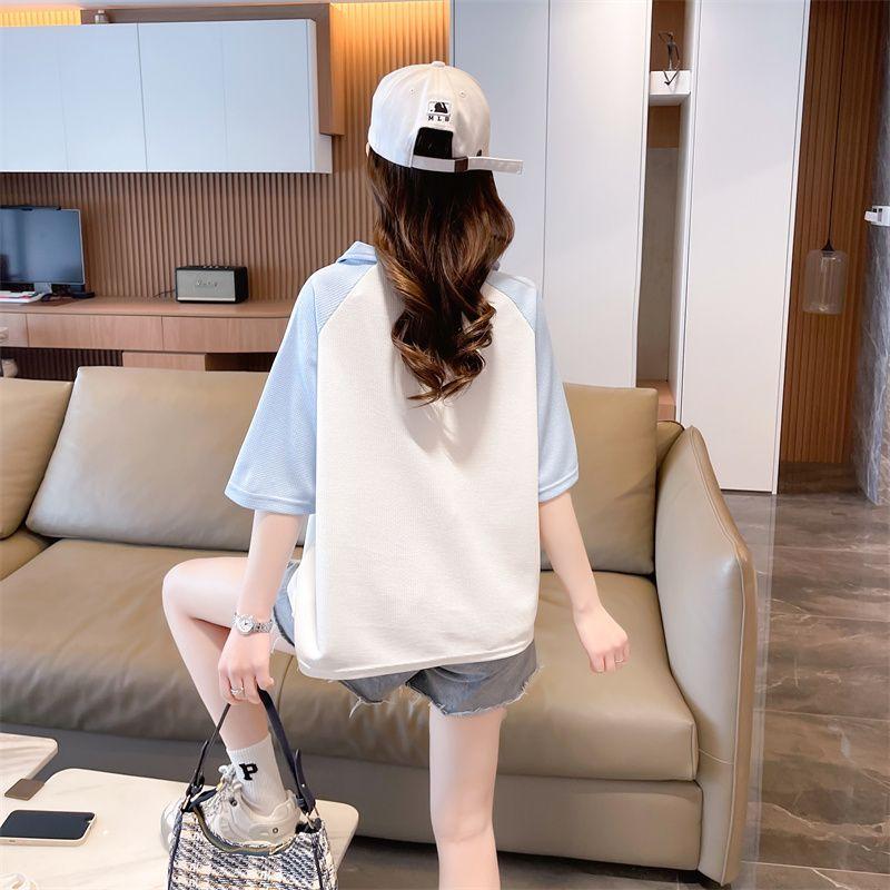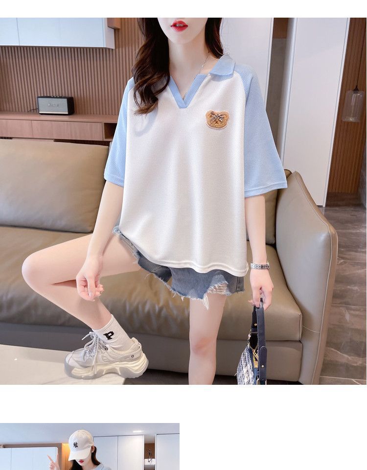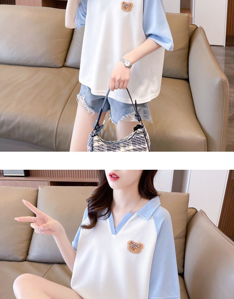 Camiseta de Manga Corta con Cuello Polo de Color Contrastante para Mujer Verano 2025 Diseño Oso Lazo Bordado Suelta Top Corto