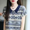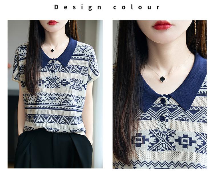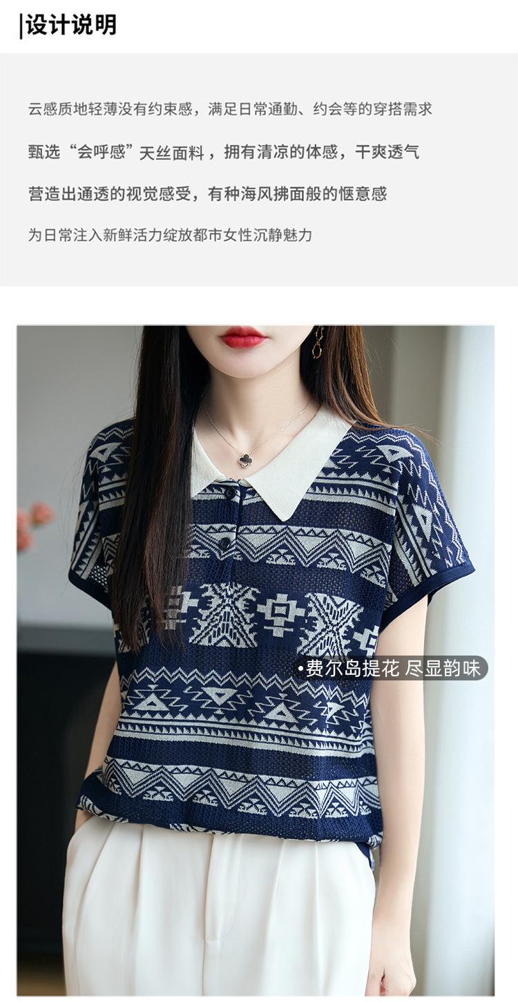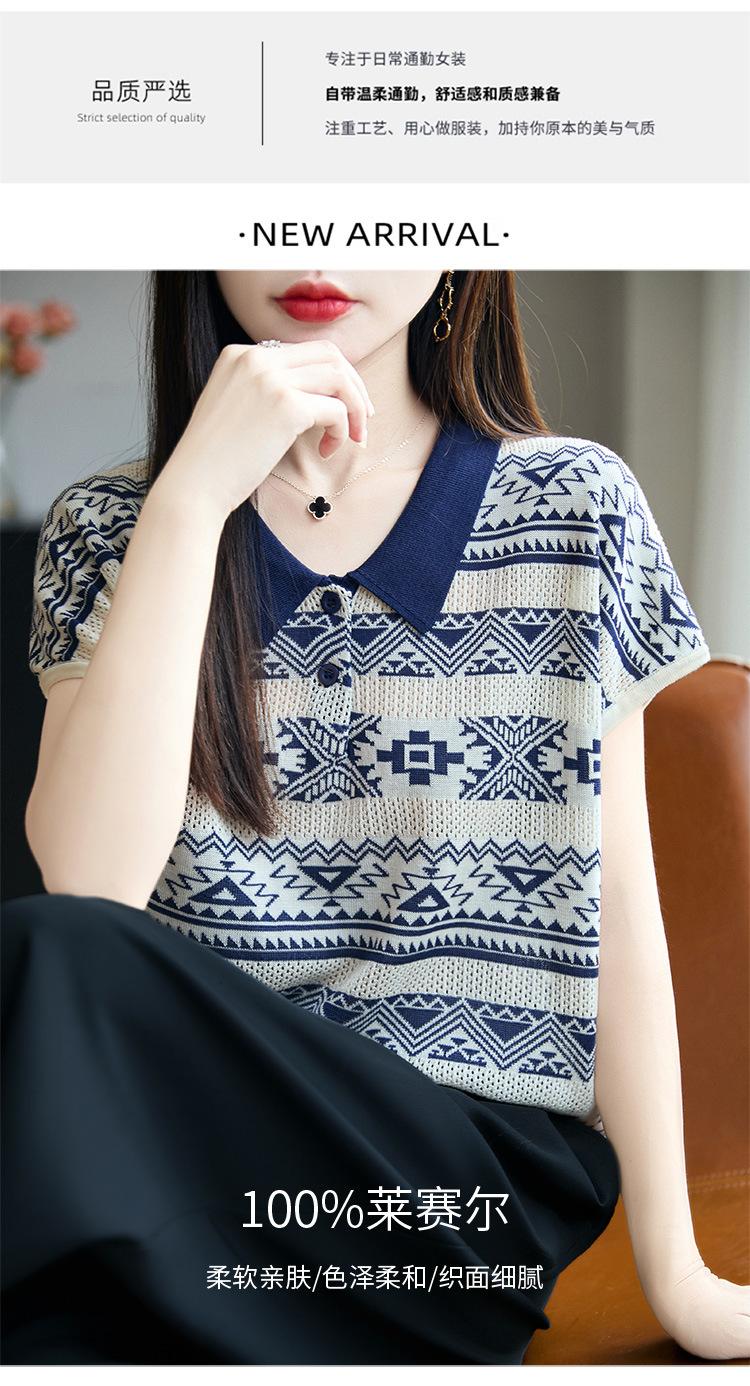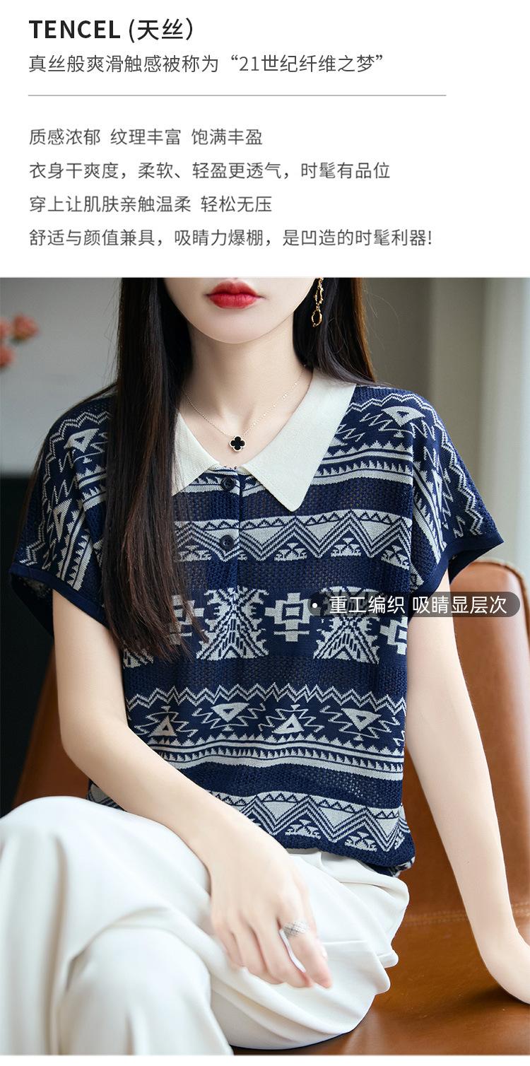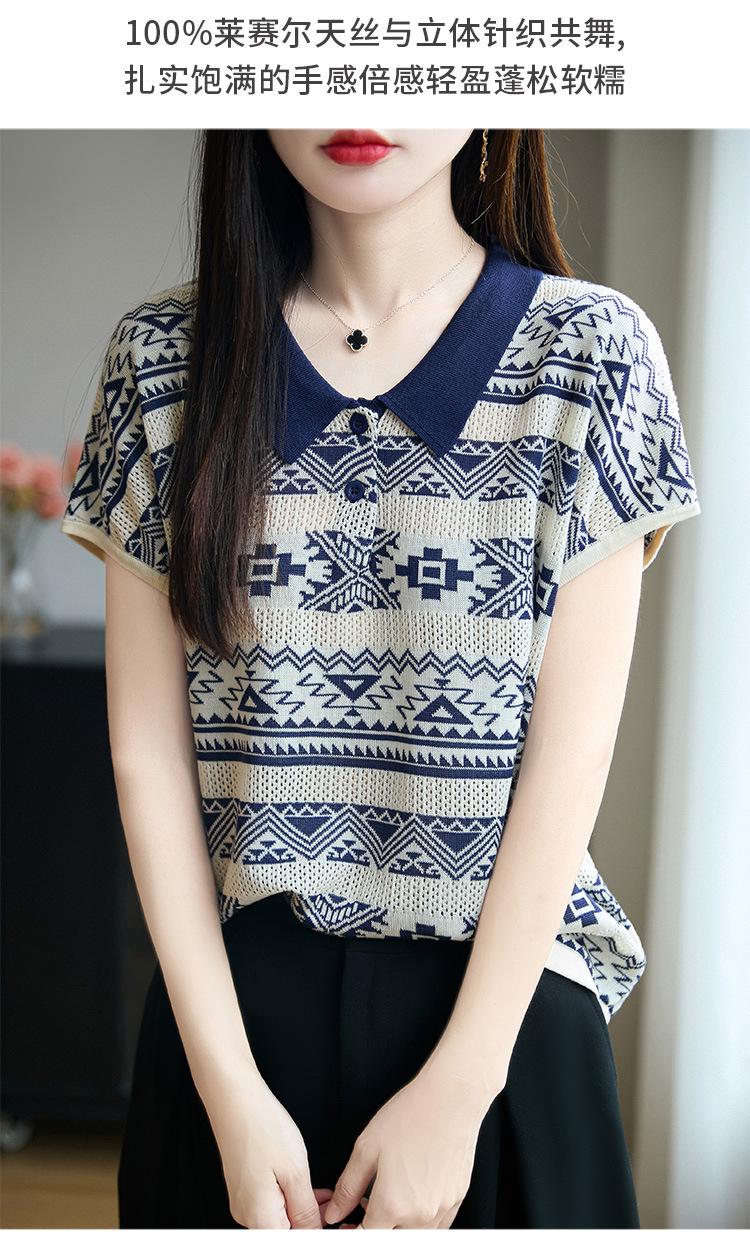 Verano 2025 Nuevo Polo de Tencel Lyocell Tejido de Manga Corta para Mujer Calado Bloque de Color Camiseta Base