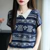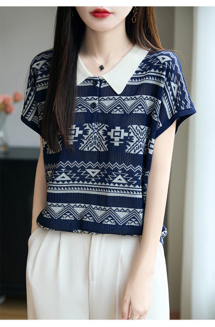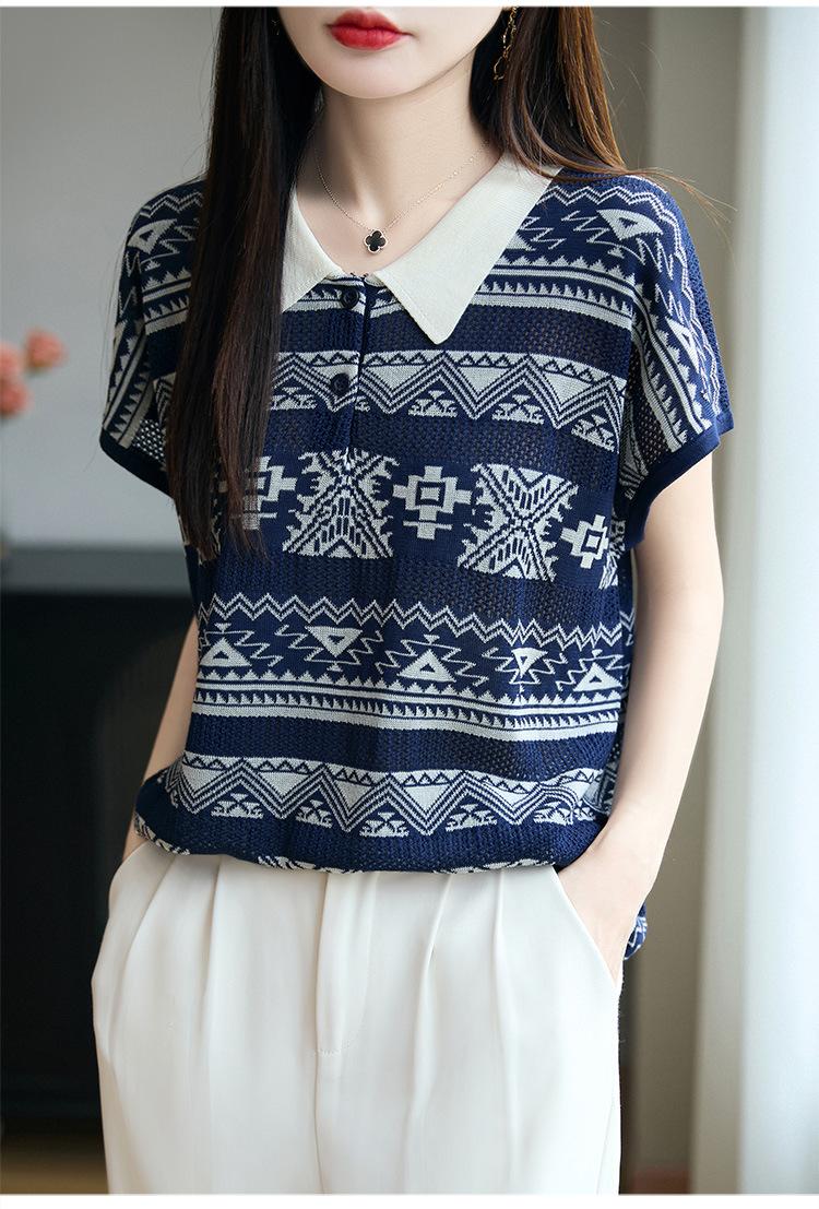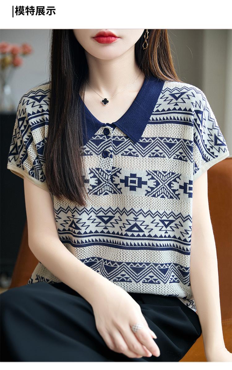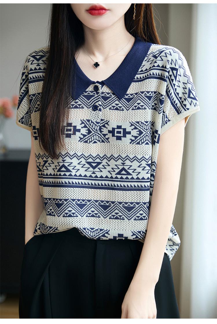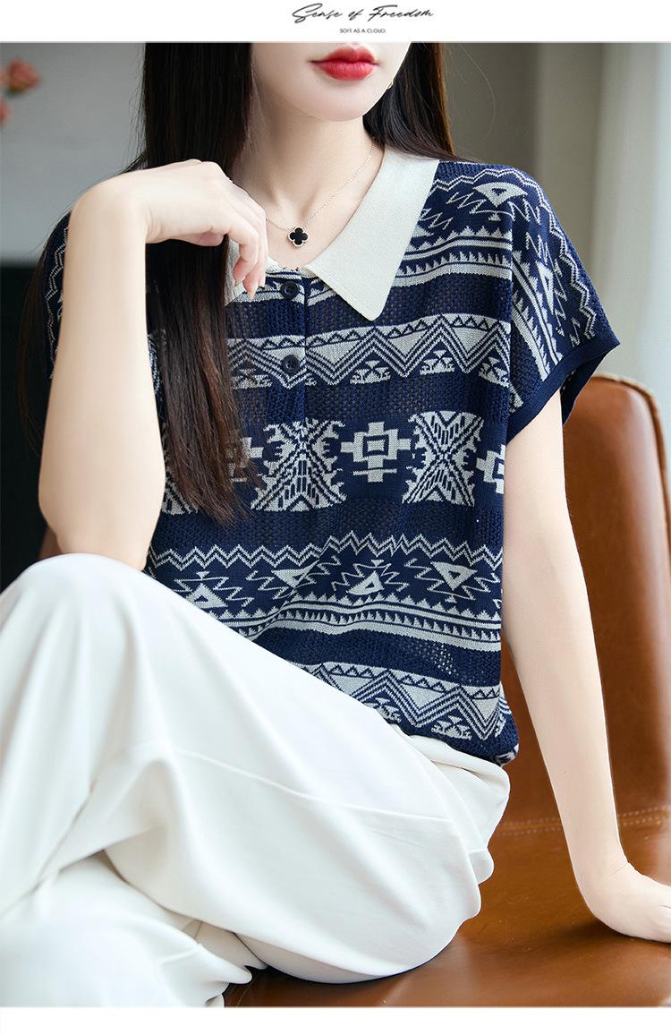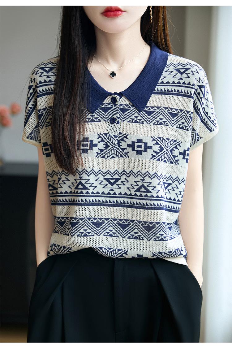 Verano 2025 Nuevo Polo de Tencel Lyocell Tejido de Manga Corta para Mujer Calado Bloque de Color Camiseta Base