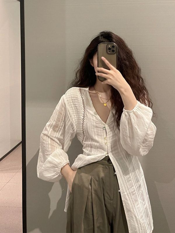 Camisa blanca de estilo francés para mujer, chaqueta fina de nicho para protección solar de verano, camisa de manga larga, top outerwear de longitud media