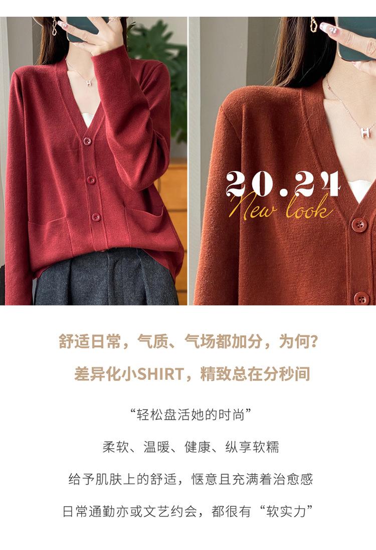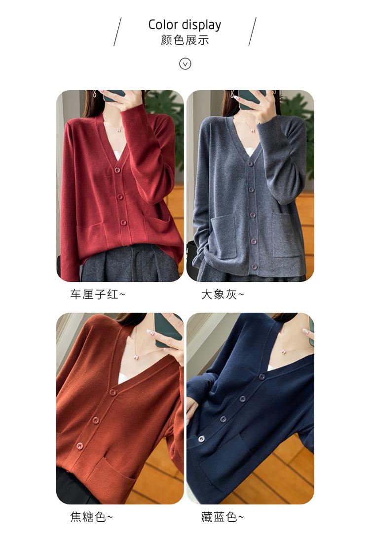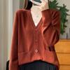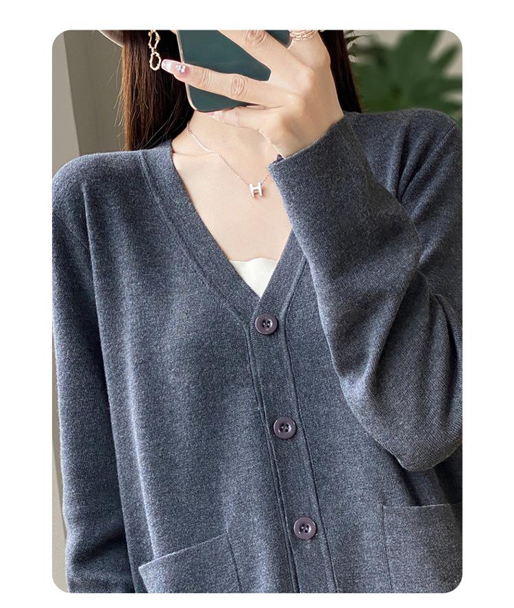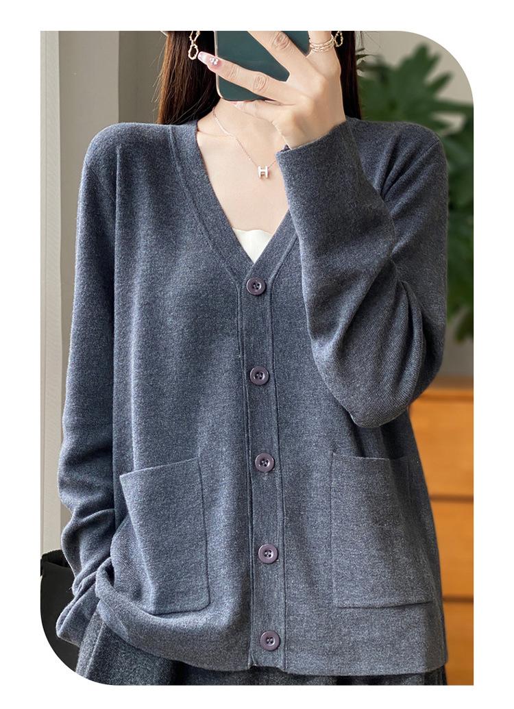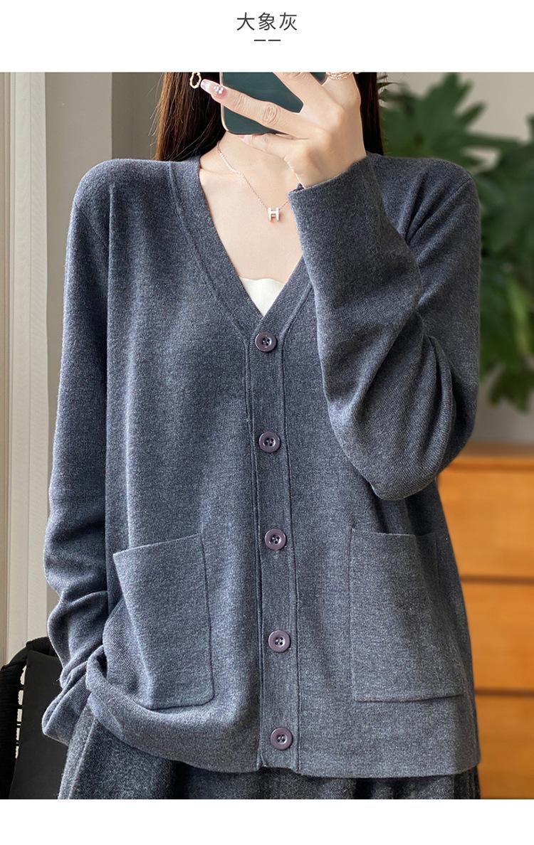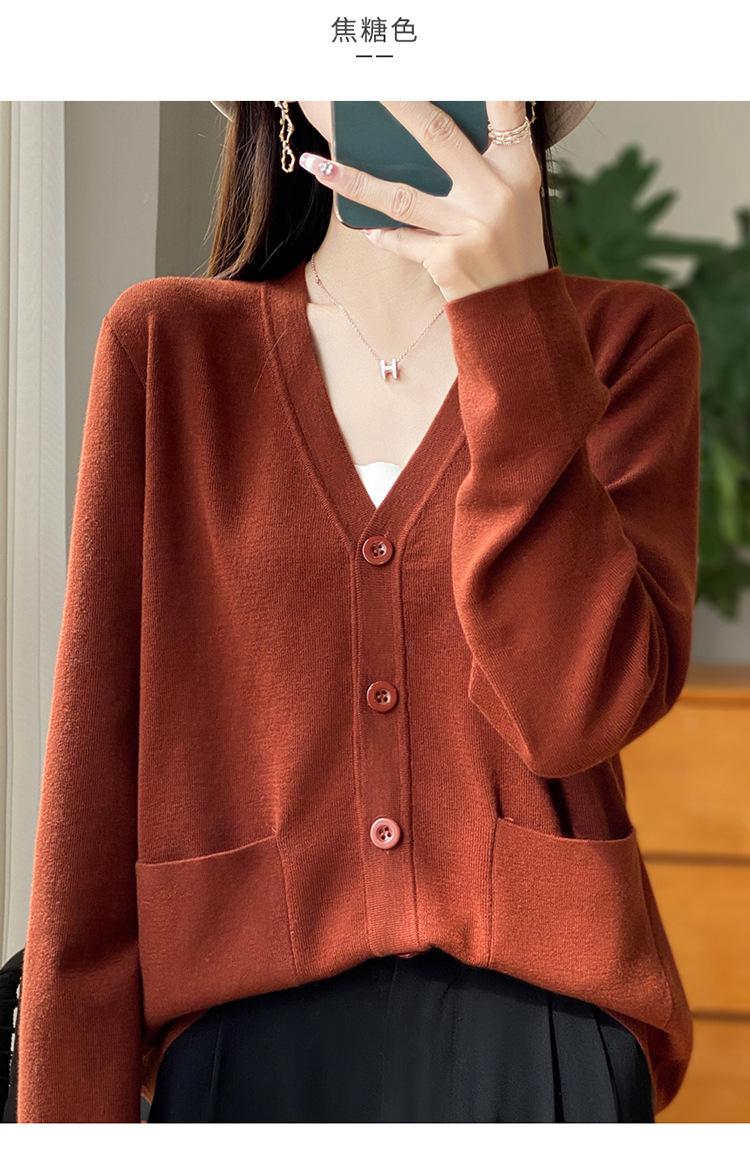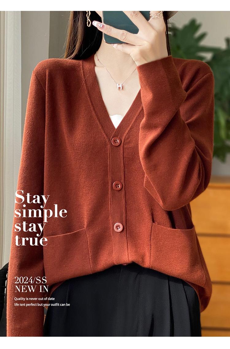 Otoño/Invierno 24 Nuevo Cárdigan de Punto de Lana Peinada Simple con Cuello en V y Bolsillo Chaqueta de Manga Larga Suelta de Color Sólido