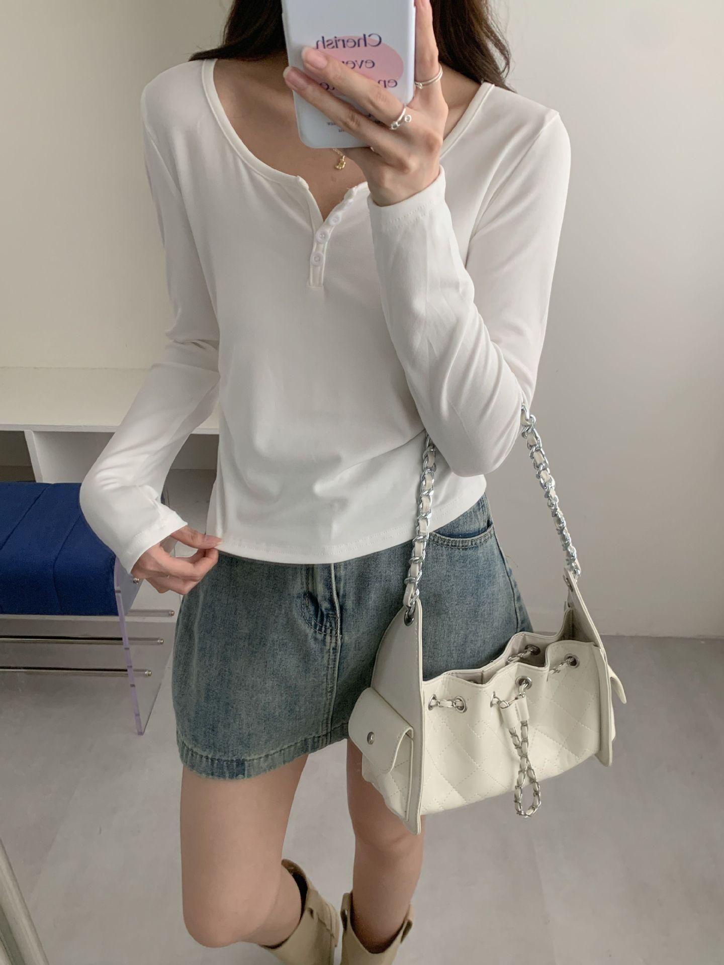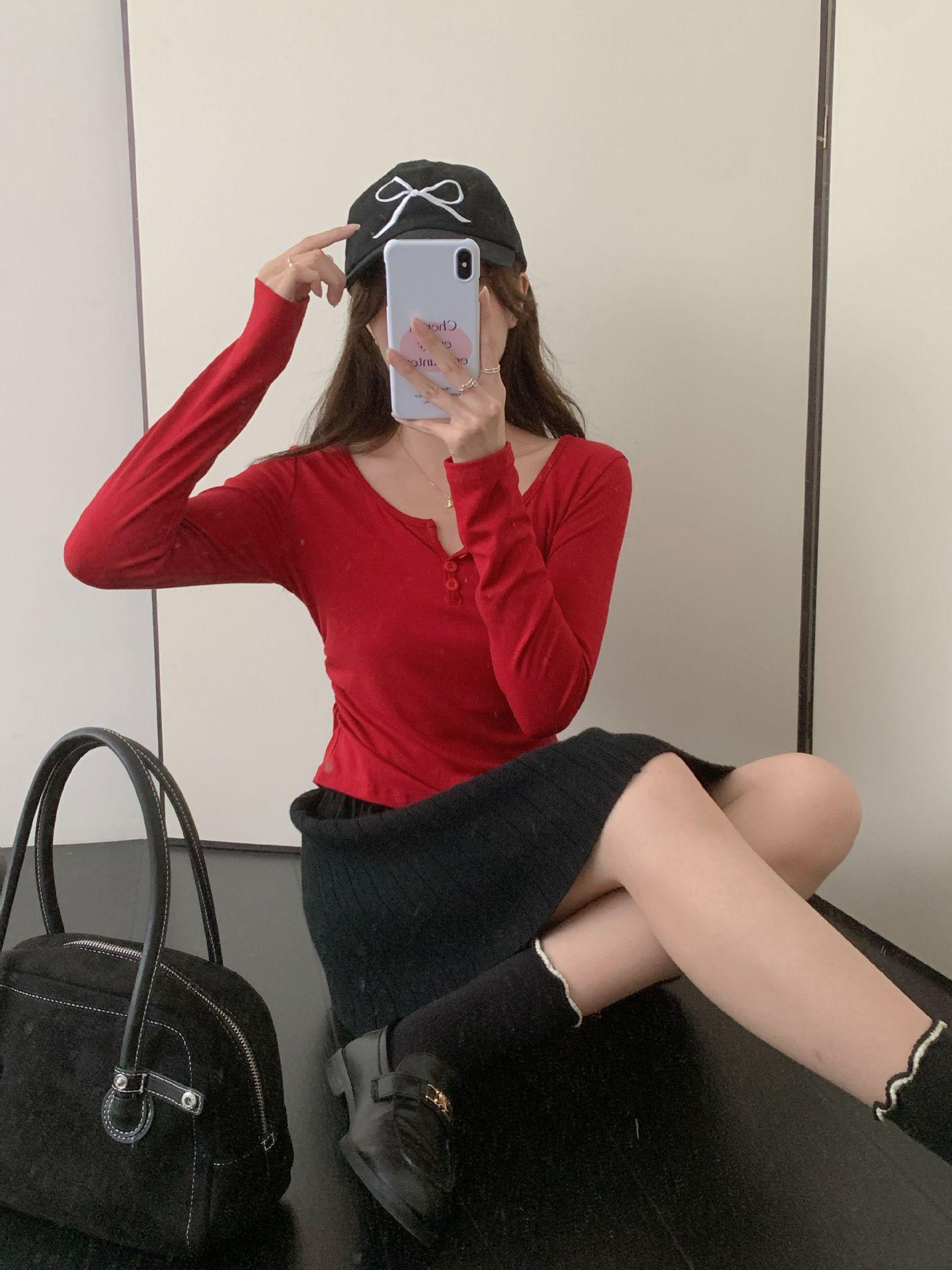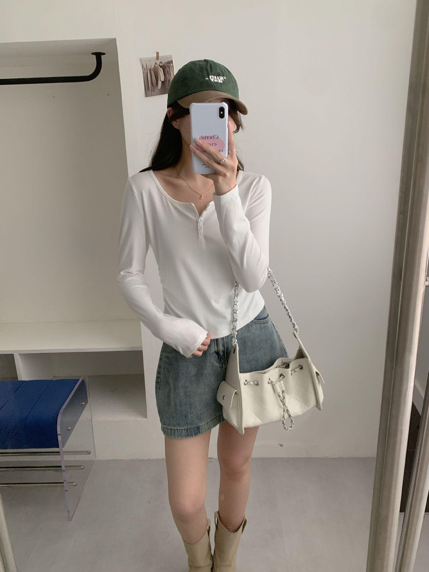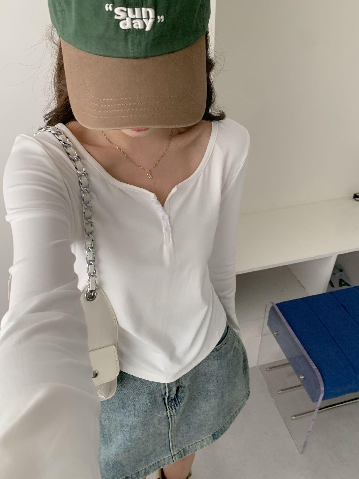 Nueva Camiseta de Manga Larga para Primavera y Otoño para Mujer con Cuello Medio Abierto y Diseño de Botones, Camiseta Base Adelgazante y para Afinar para Chica Hot, Top para Ropa Interior