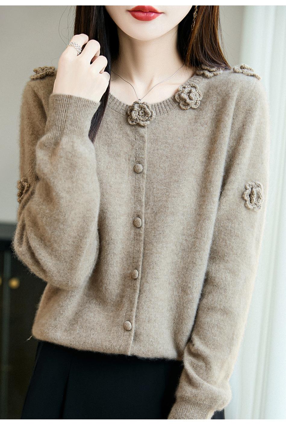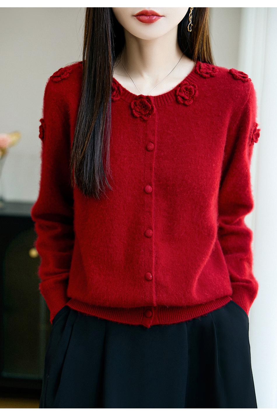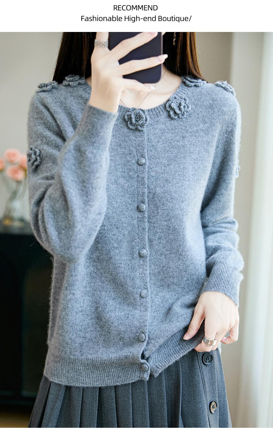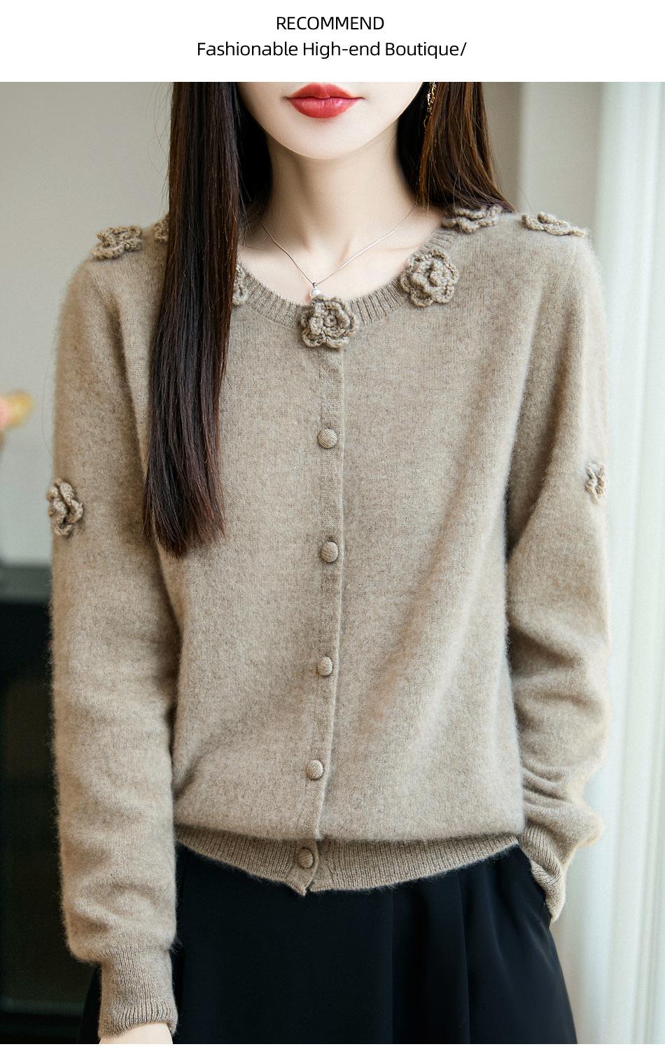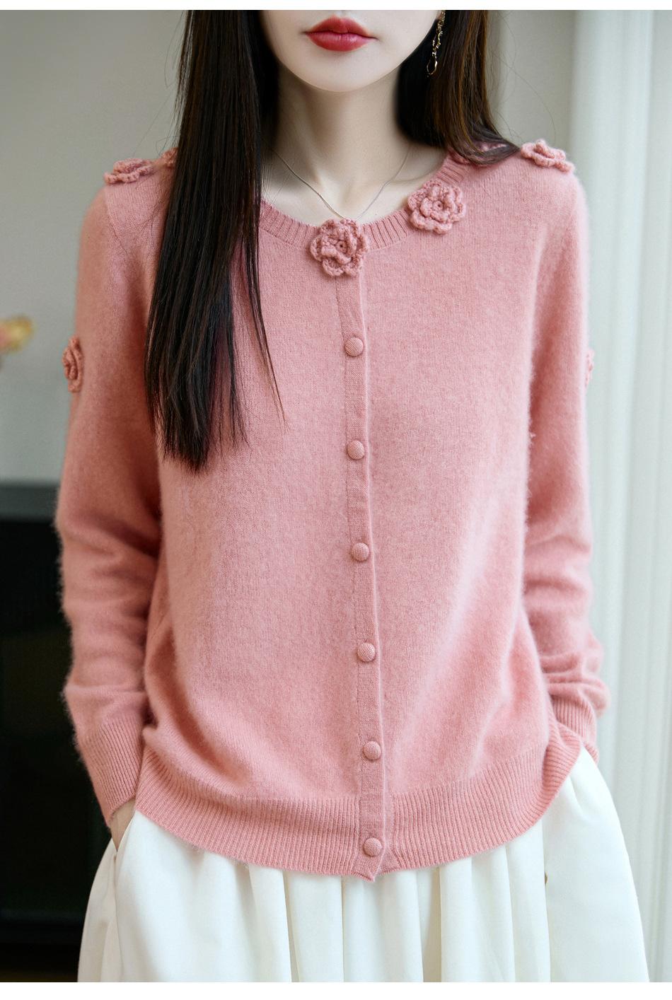 Suéter 100% Lana Pura Cuello Redondo Tejido Cárdigan para Mujer Nueve Rosas Hecho a Mano Crochet Suéter Abrigo Otoño e Invierno Nuevo