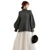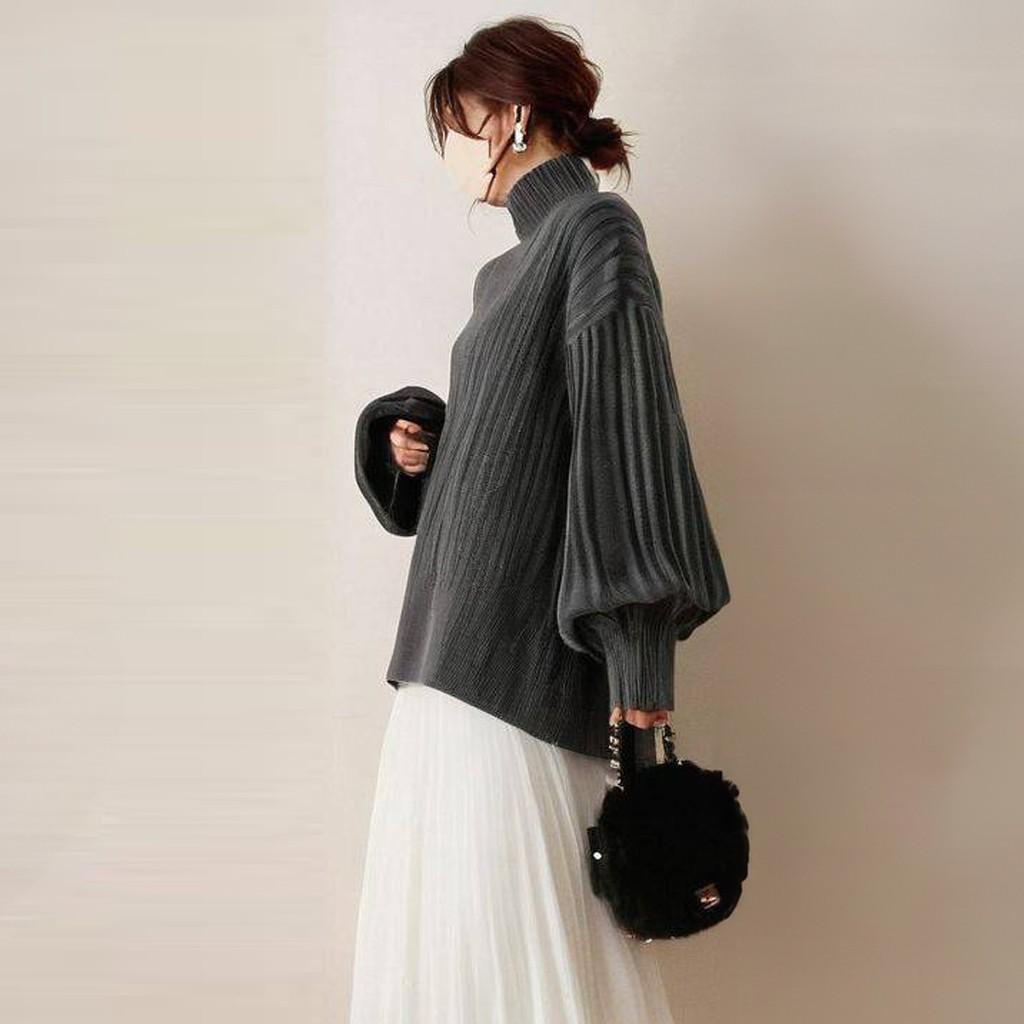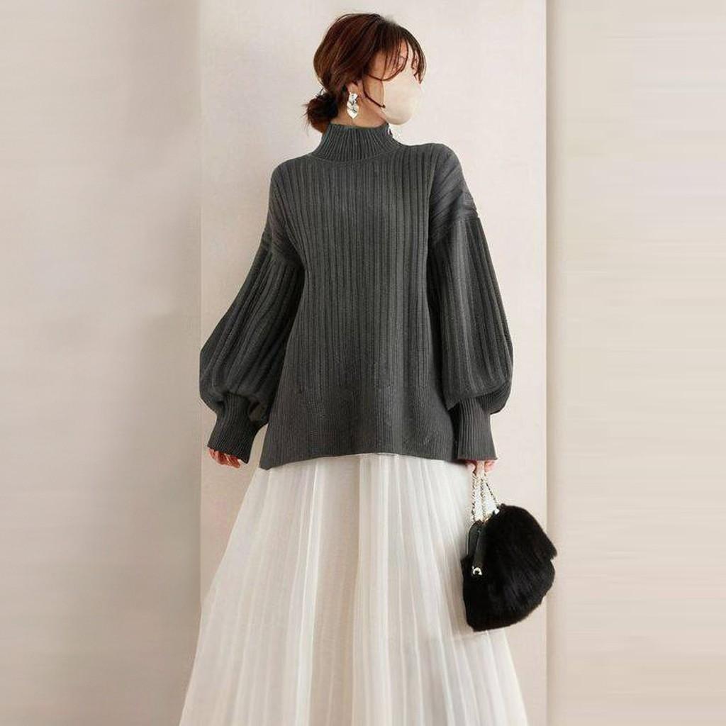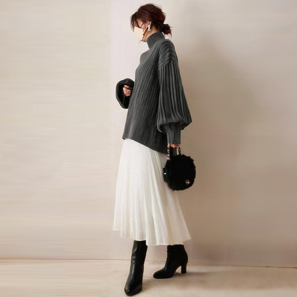 Conjunto de dos piezas de suéter y falda plisada con mangas abullonadas y cuello alto suelto japonés de otoño 2024