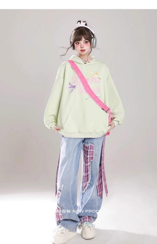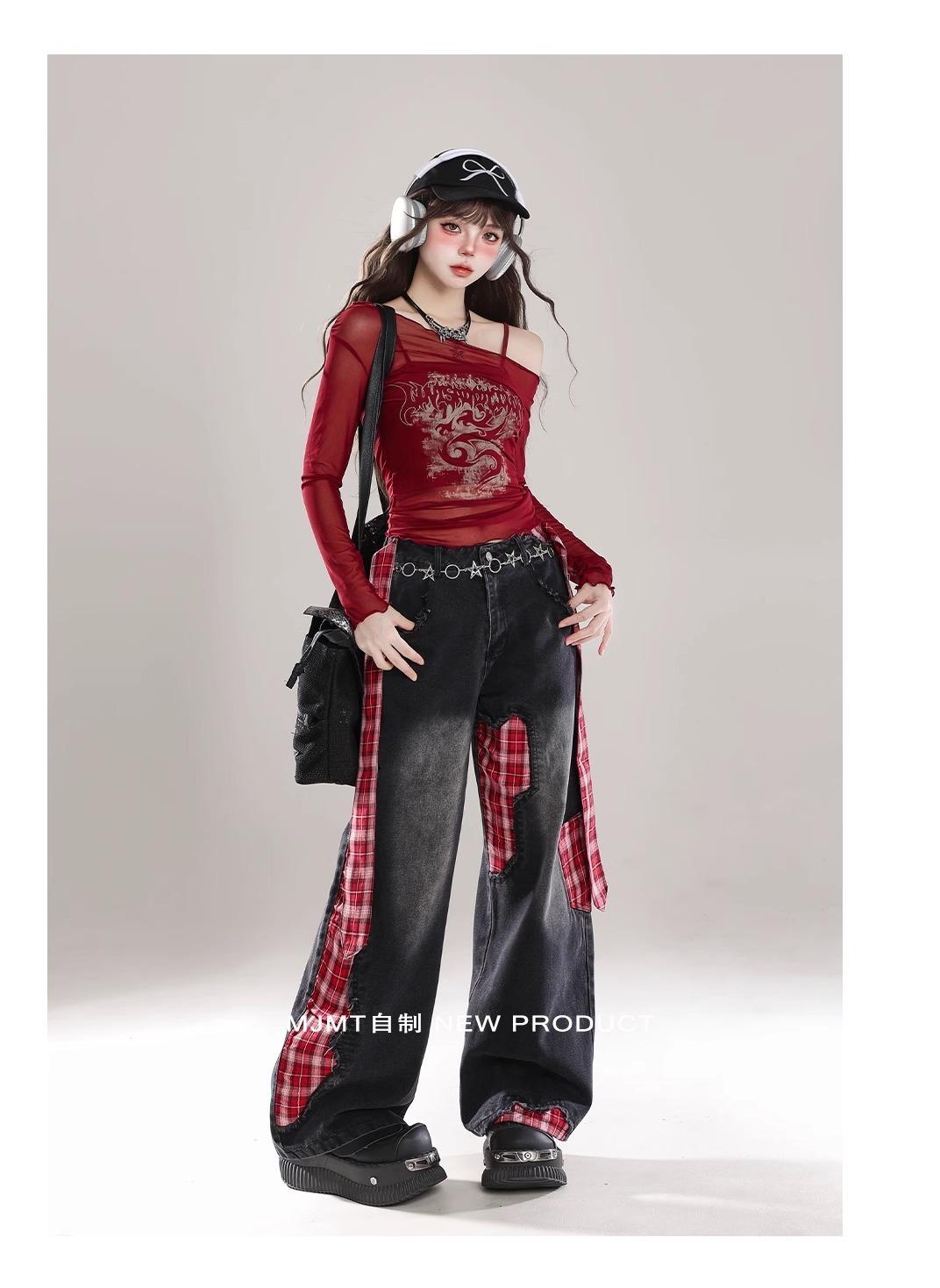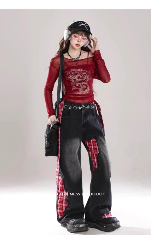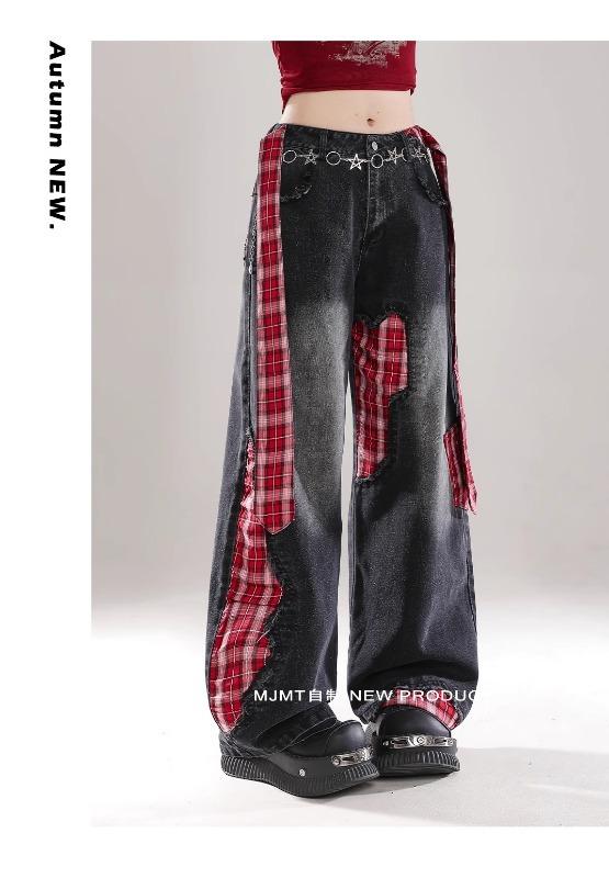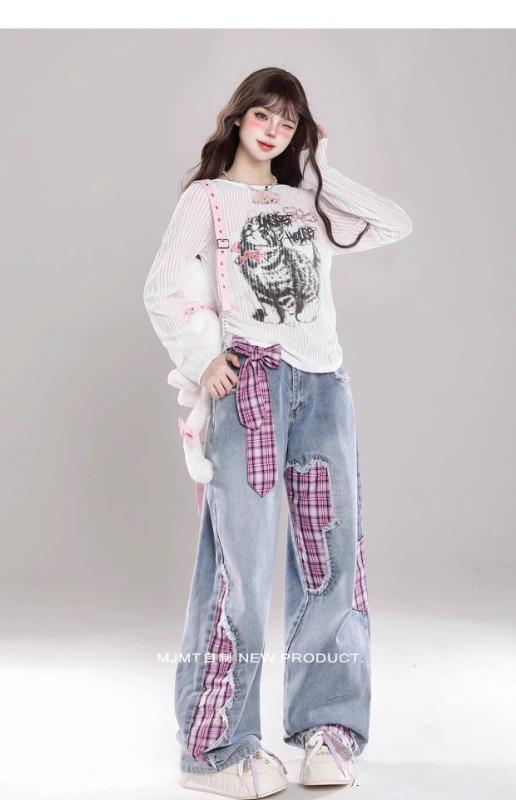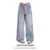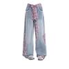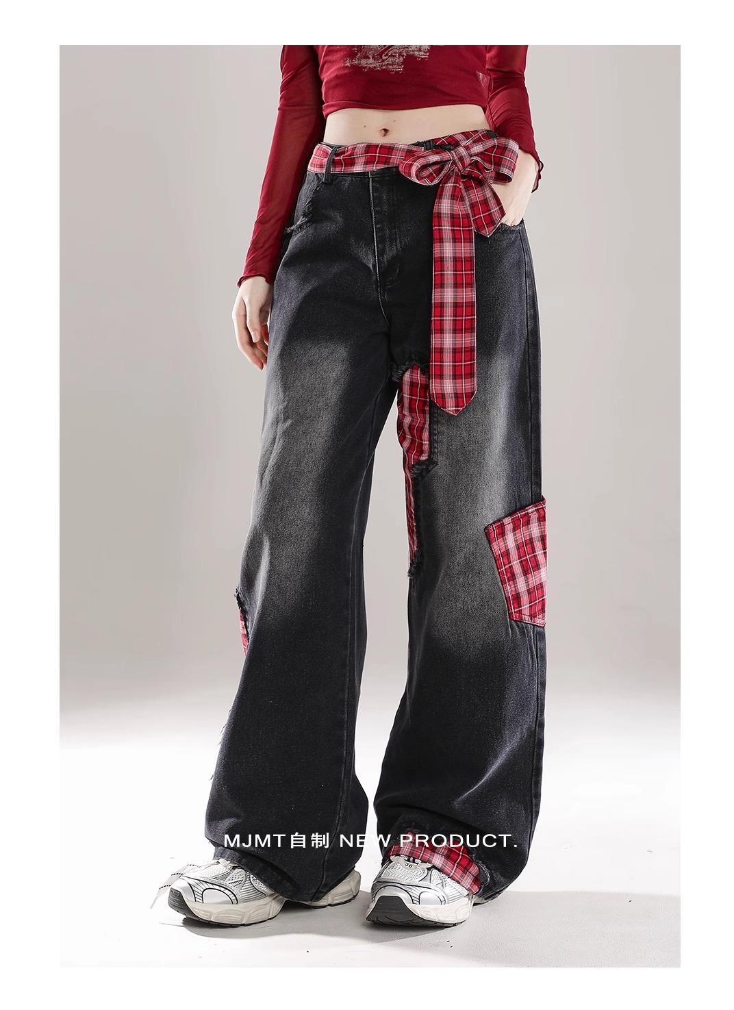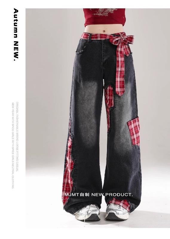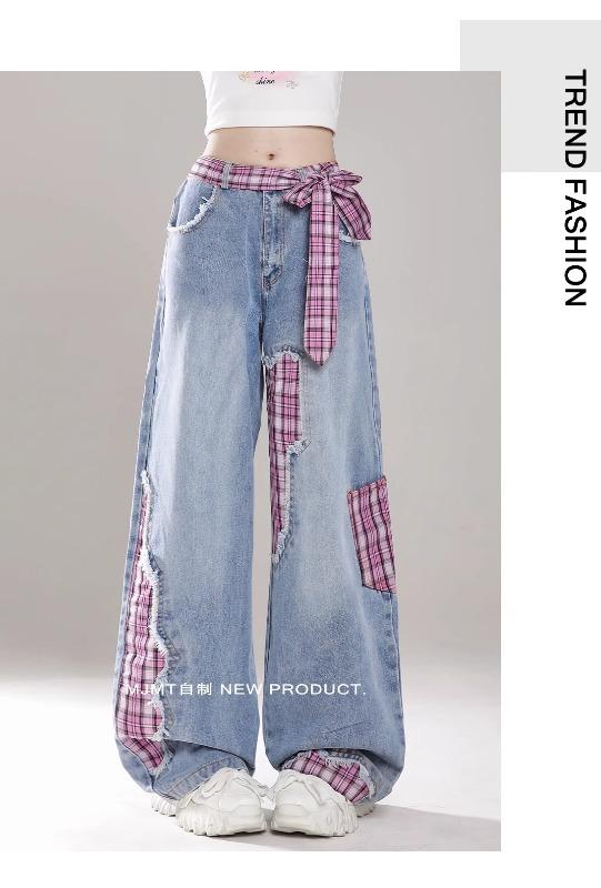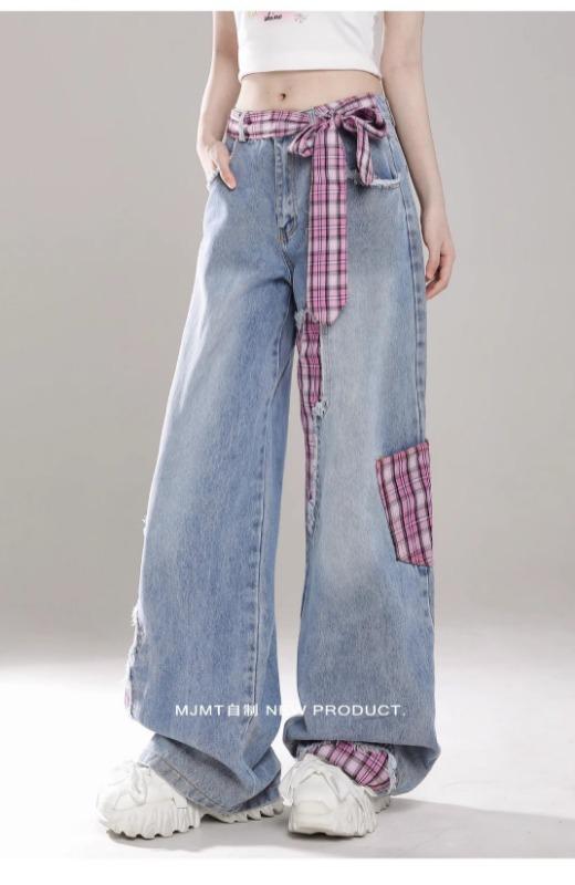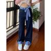 Jeans de Pierna Recta Empalmados con Lazo de Diseño con Sentido de Talla Grande para Mujer Primavera Americano Cintura Alta Pierna Ancha Pantalones Largos Modernos