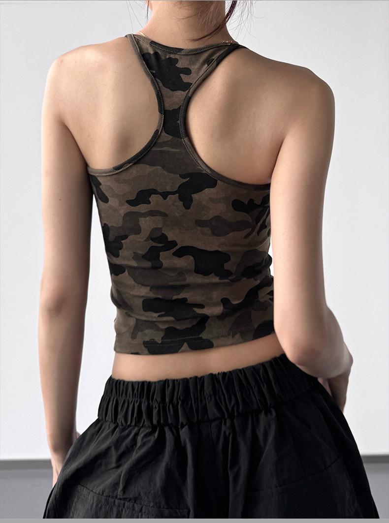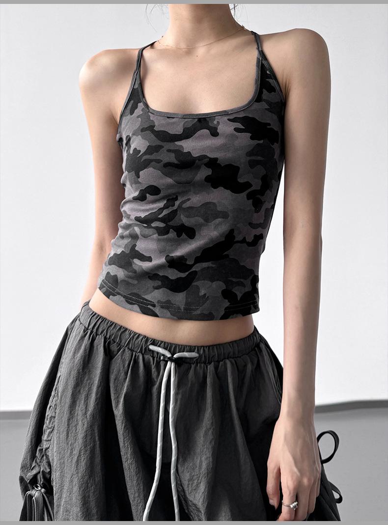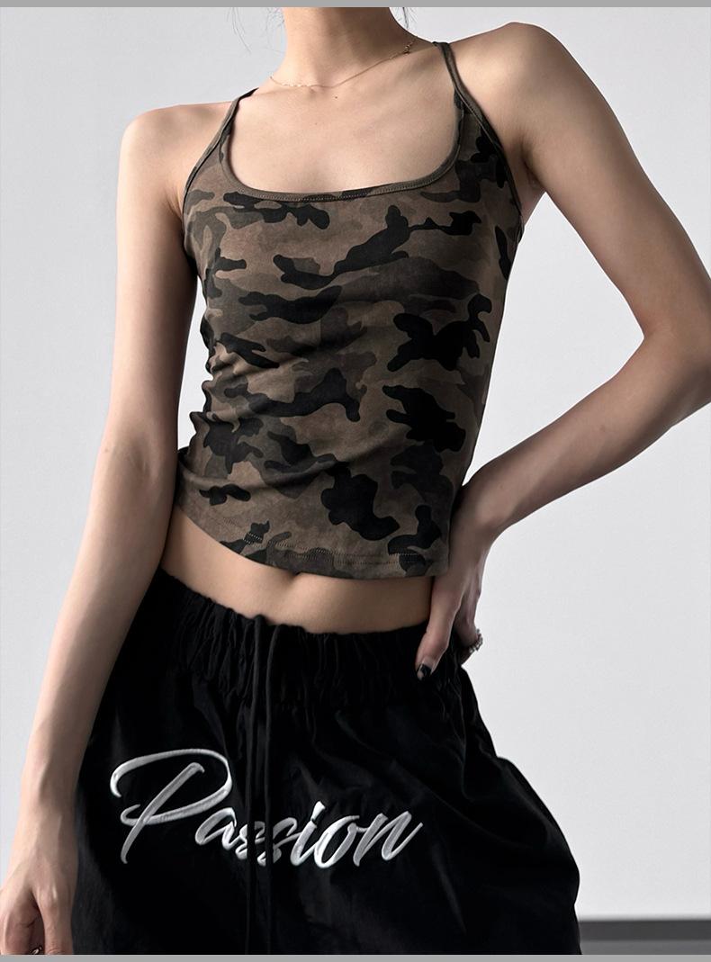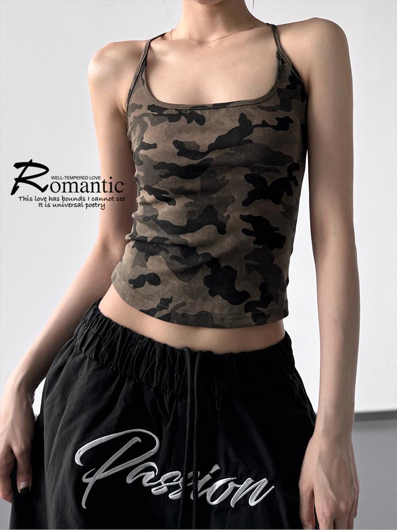 Chaleco Camuflaje Estilo Spice Girl Americano con Tirantes en I para Mujer 2025 Verano Nuevo Estilo Top Corto sin Mangas