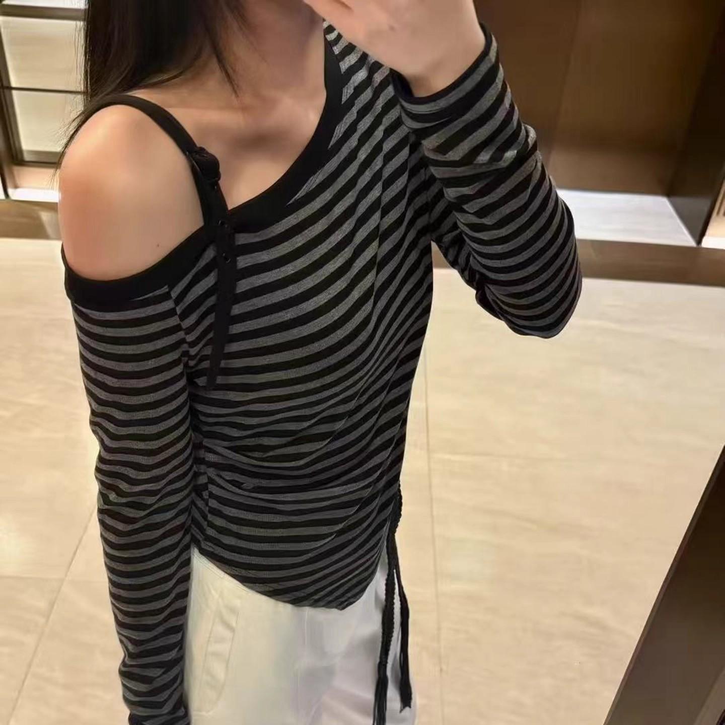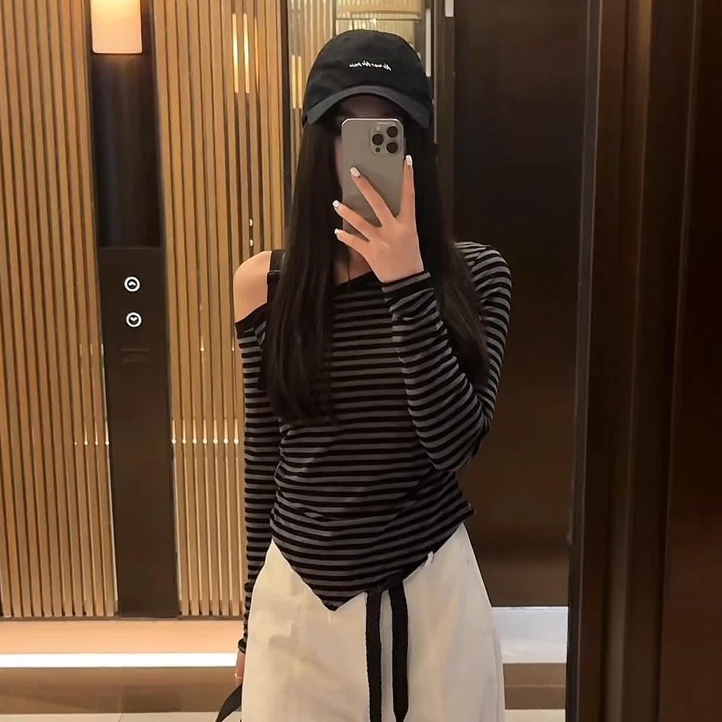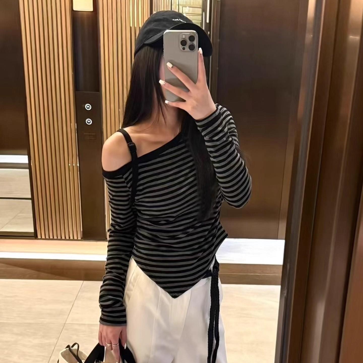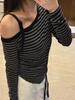 Playera Irregular con Hombro Descubierto a Rayas de Manga Larga para Mujer Otoño 2025 Nuevo Top Adelgazante de Chica Picante Americana