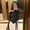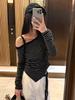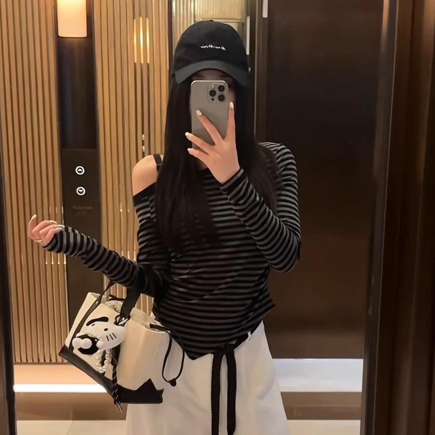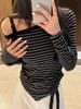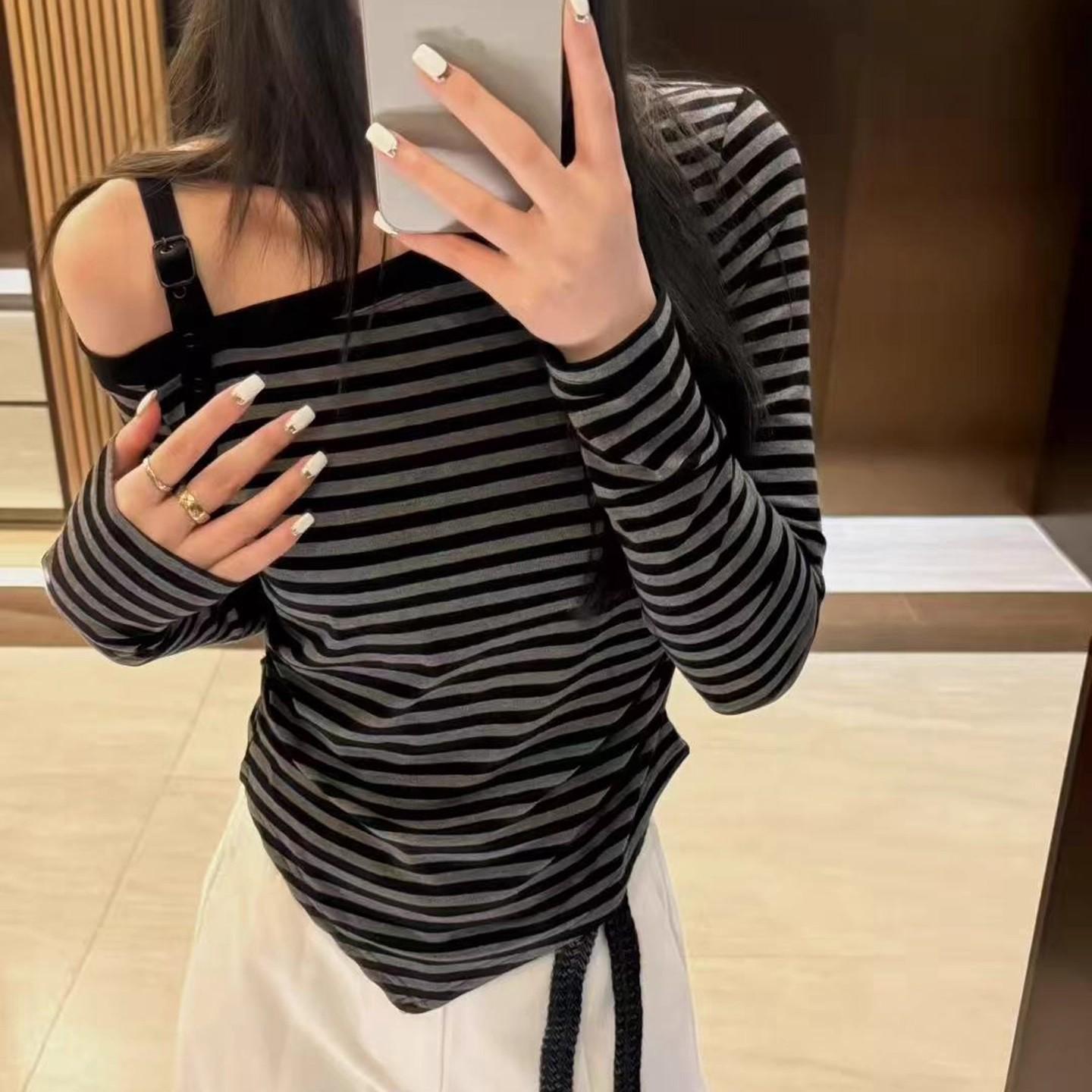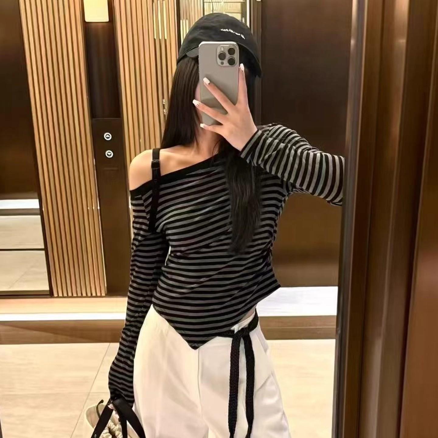 Playera Irregular con Hombro Descubierto a Rayas de Manga Larga para Mujer Otoño 2025 Nuevo Top Adelgazante de Chica Picante Americana
