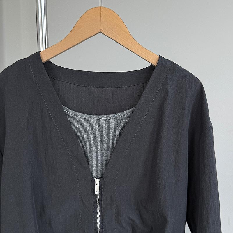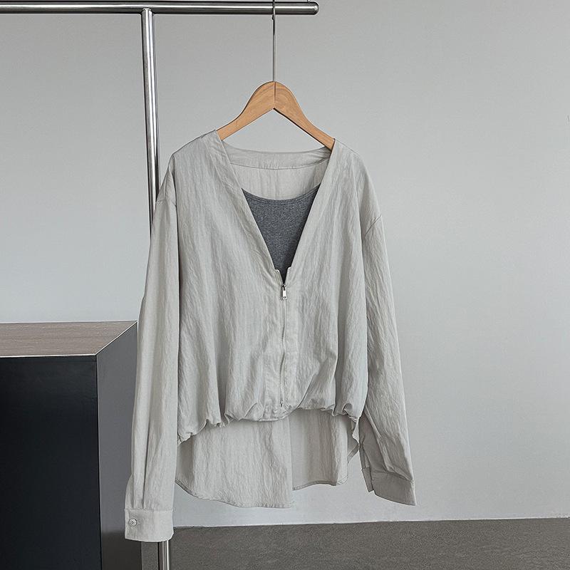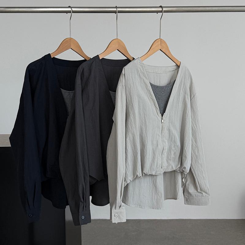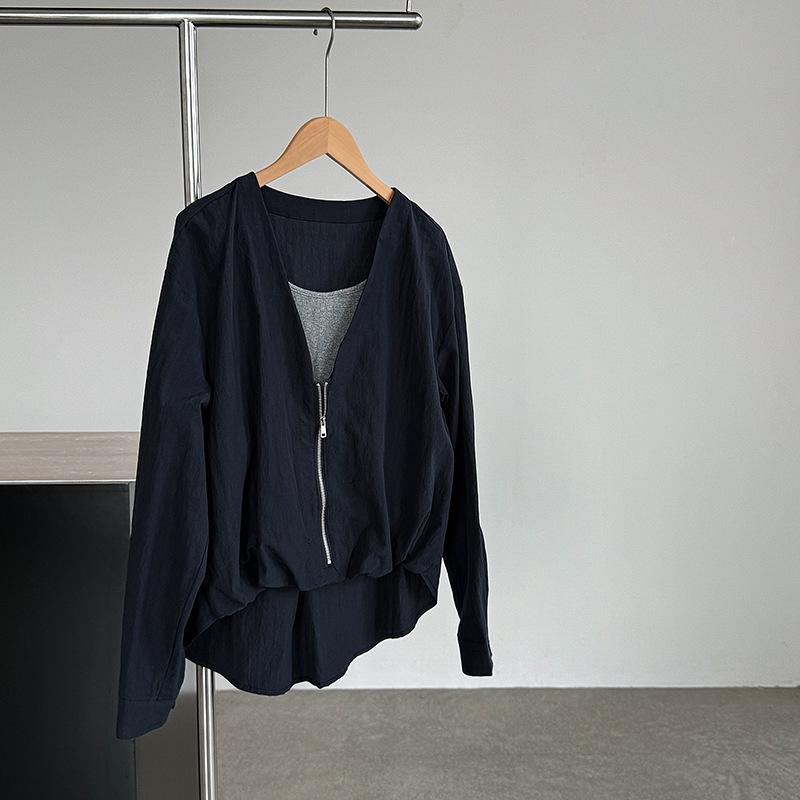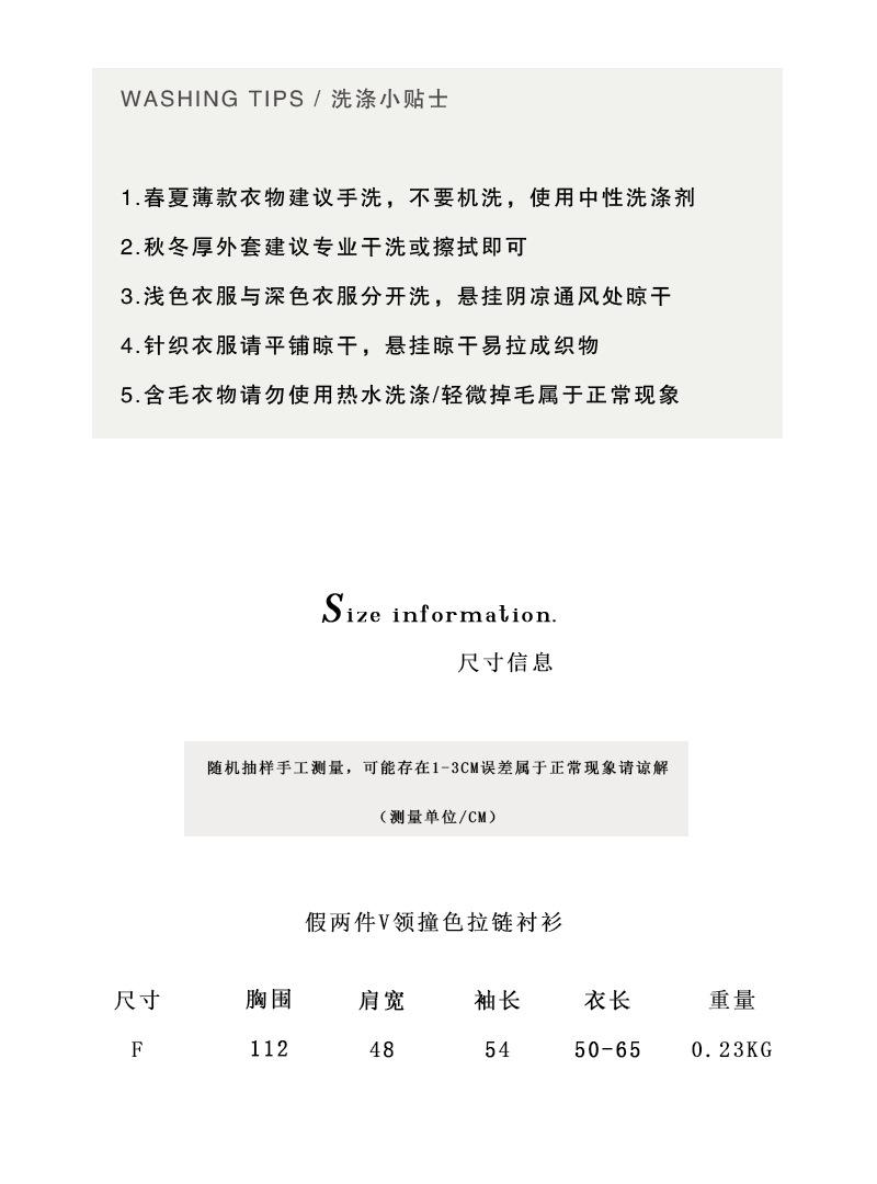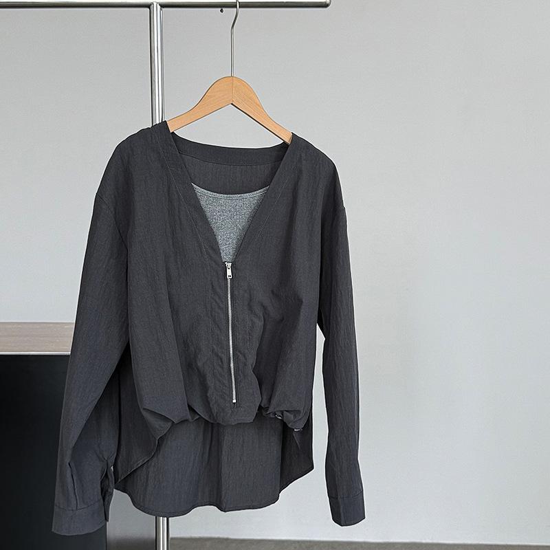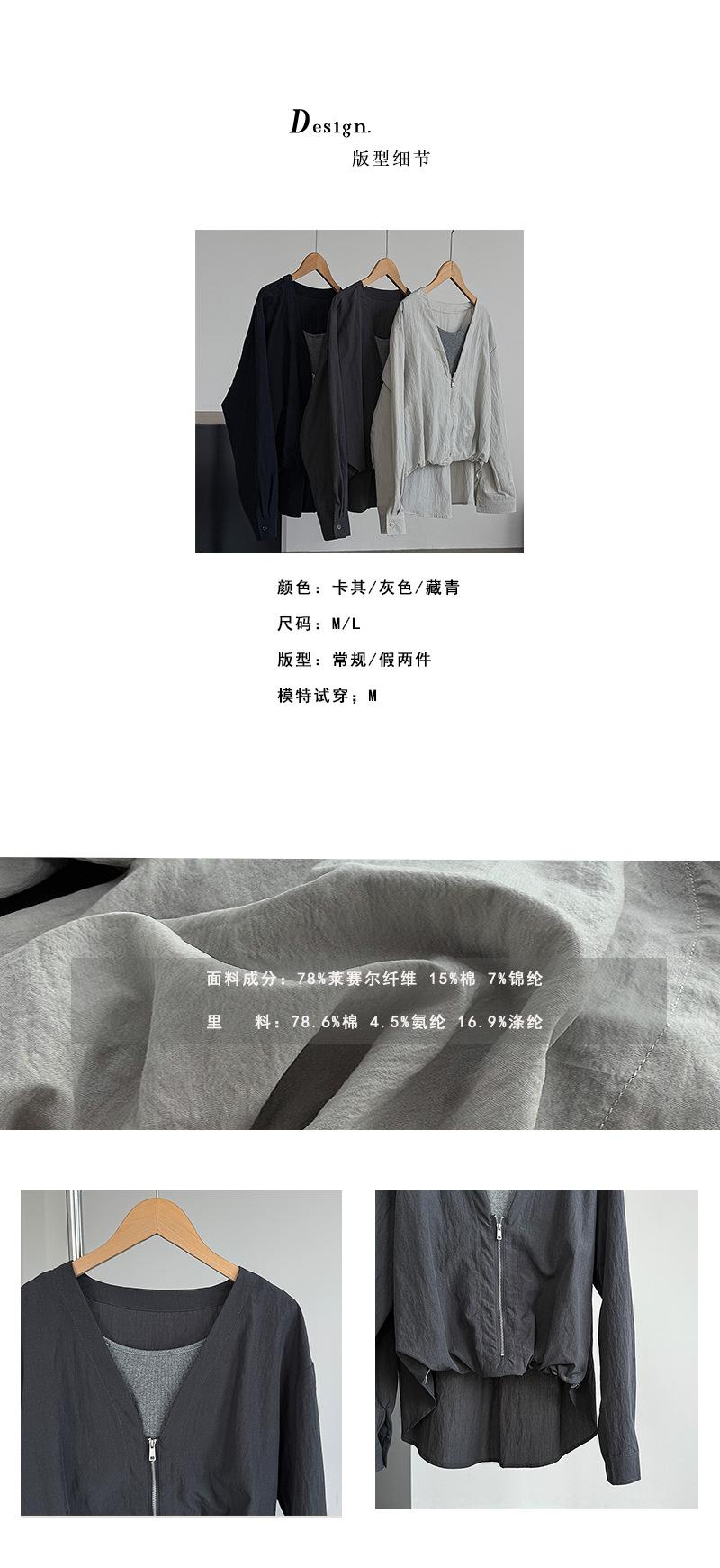 Taochuan Camisa coreana de estilo falso de dos piezas con cuello en V y bloques de color con cremallera para mujer 25 otoño nicho sentido de alta gama top 2807
