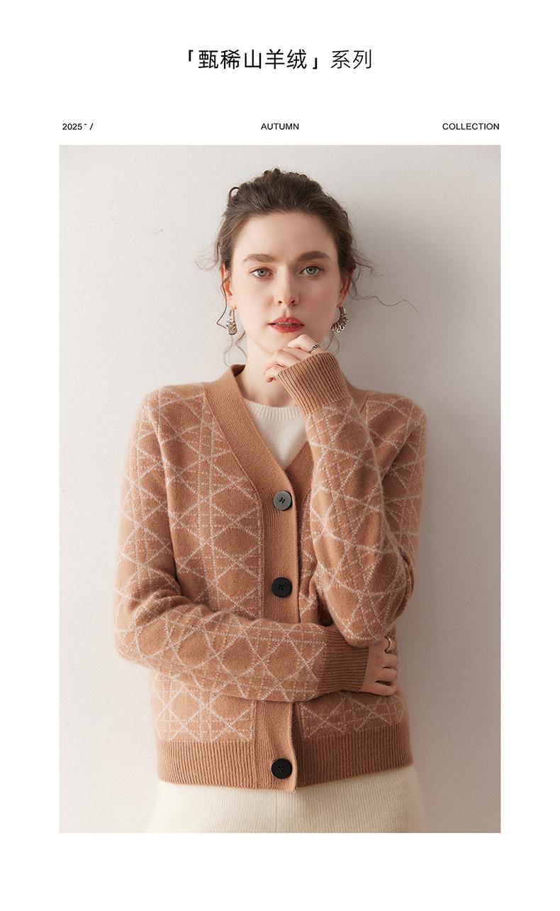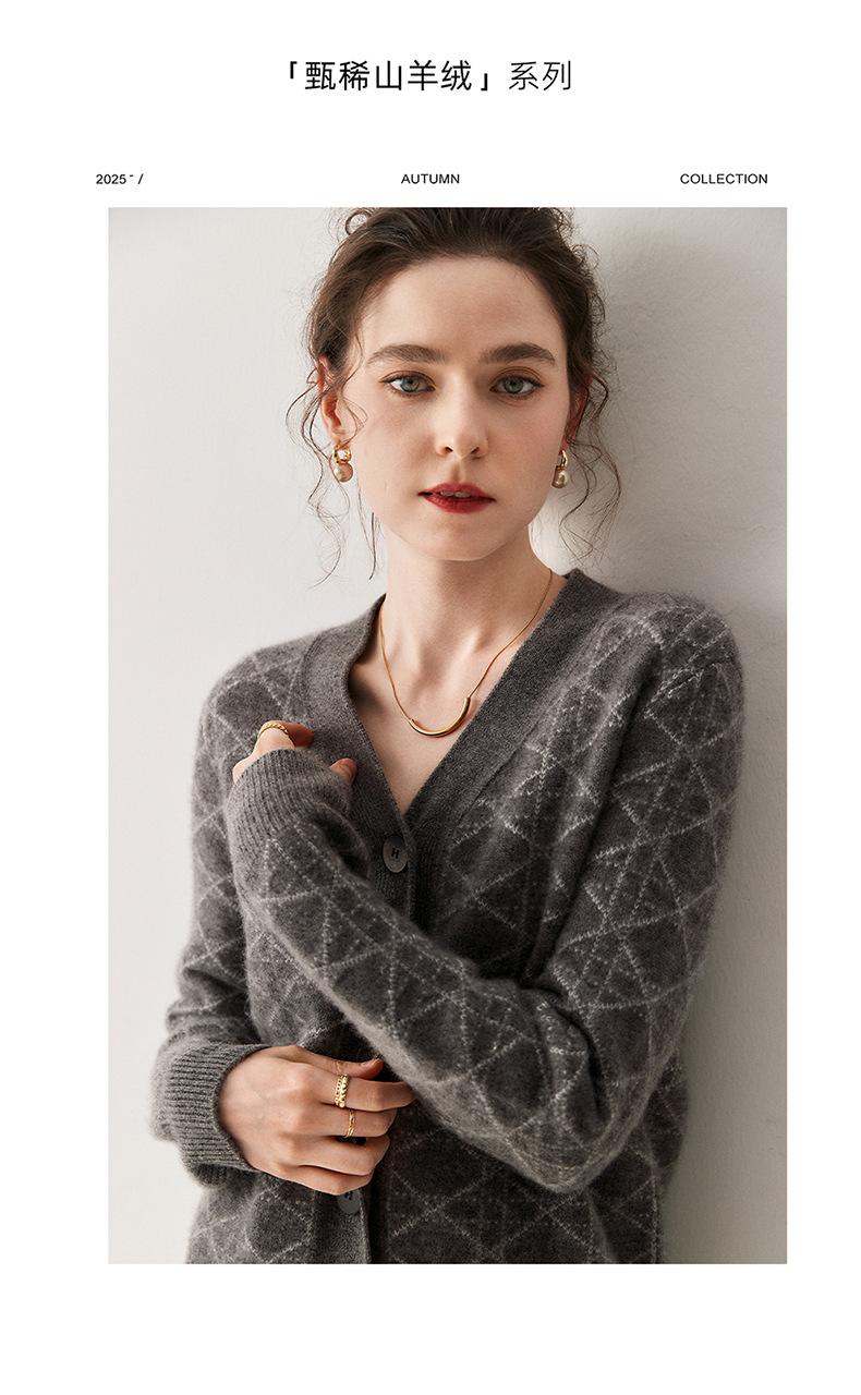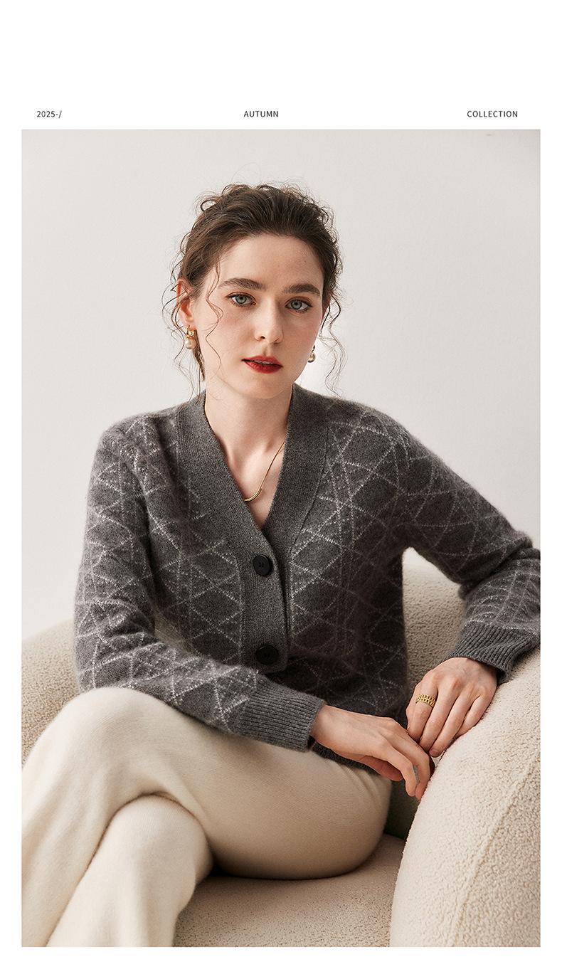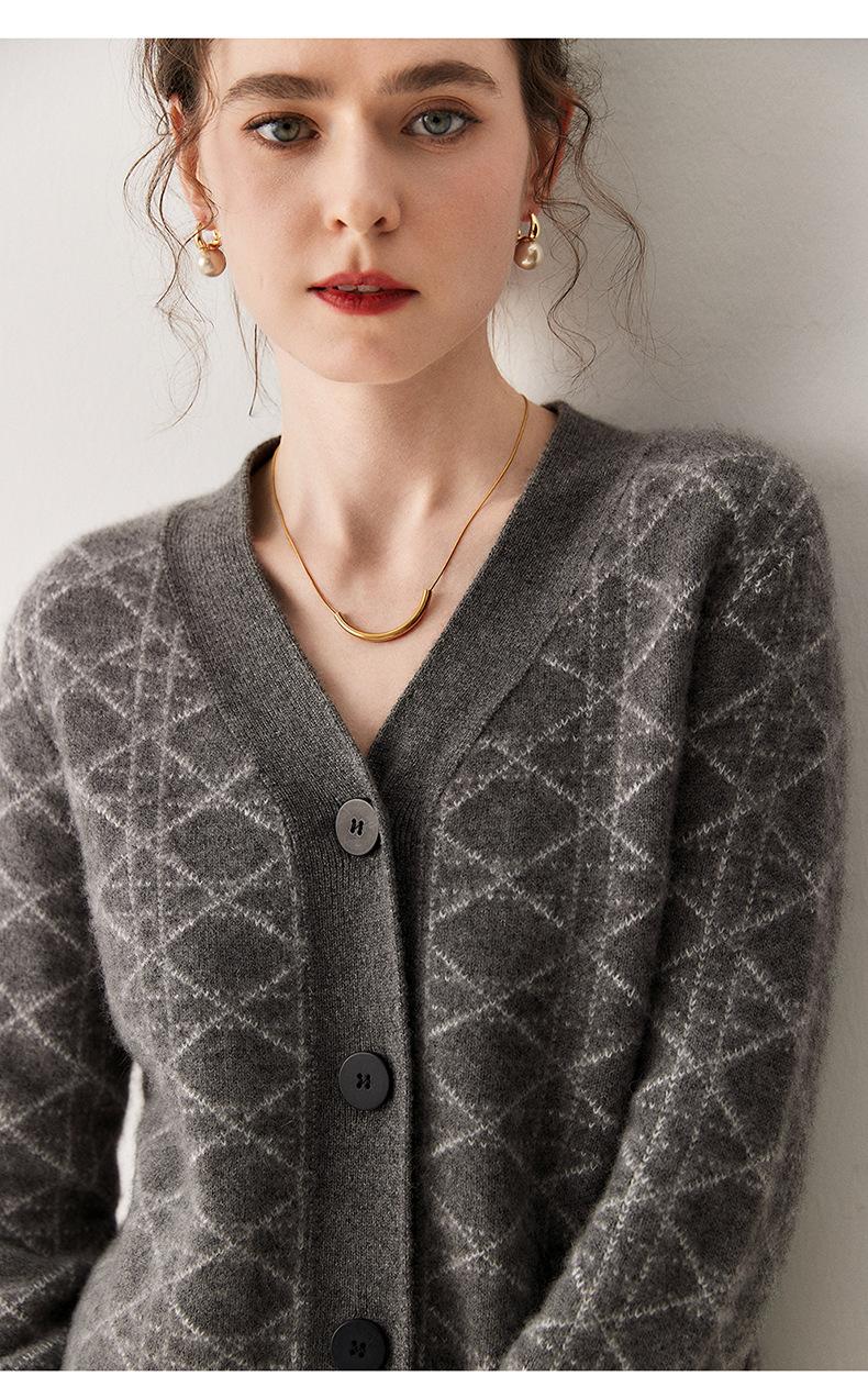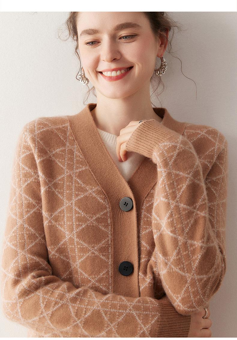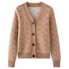 Cárdigan de Punto con Cuello en V Nuevo Otoño/Invierno 2025 Versátil para Mujer Casual Suelto Estampado de Diamantes Abrigo Cárdigan de Punto