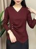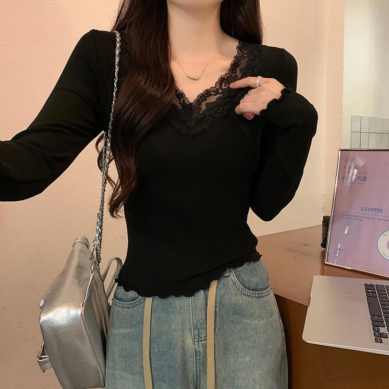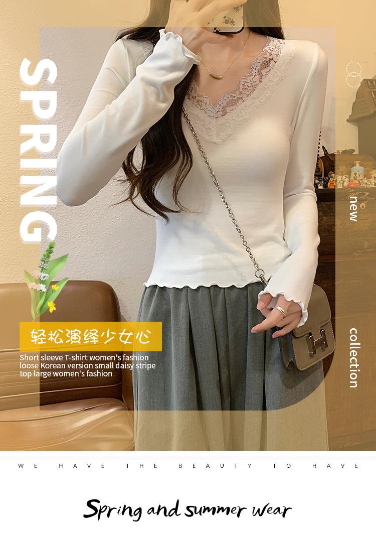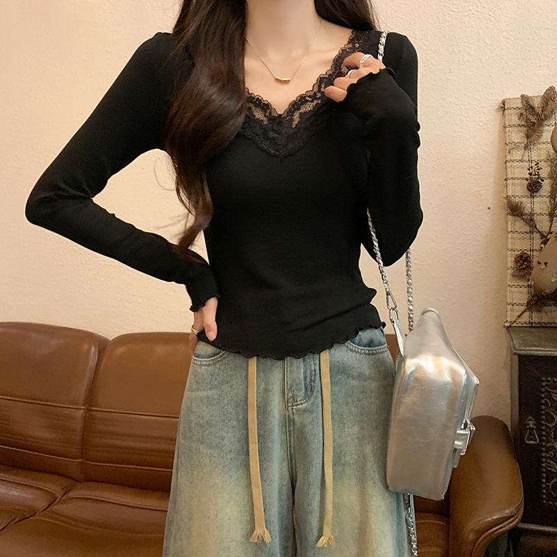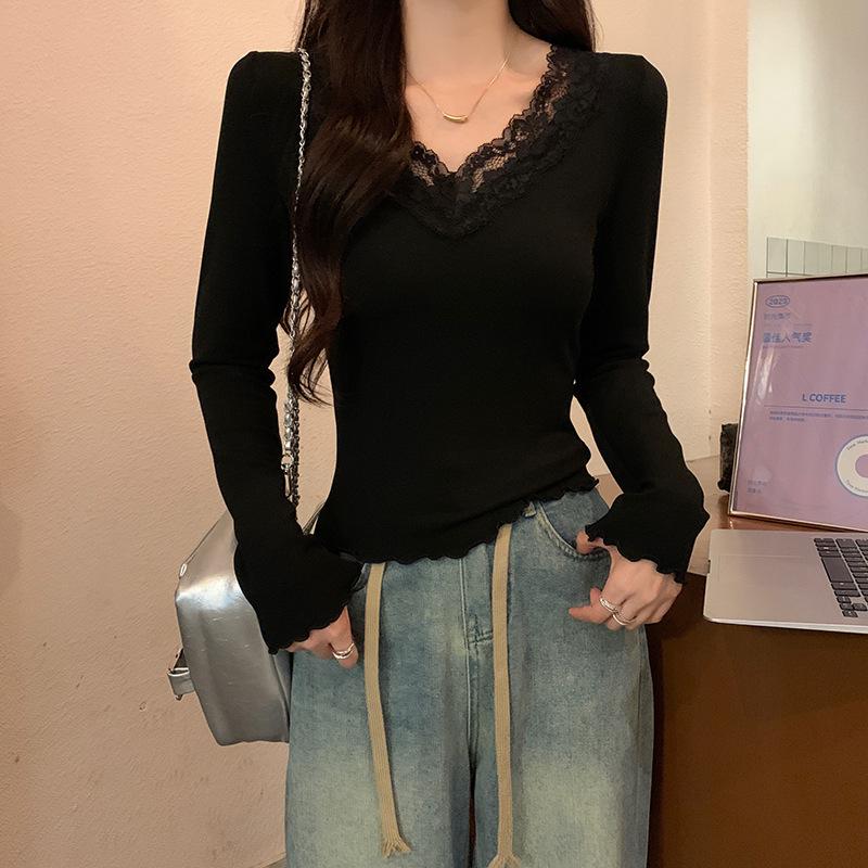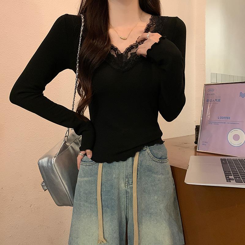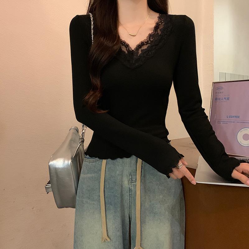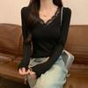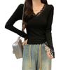 Playera de Encaje Puro y Sexy con Parches de Encaje, Cuello en V, Manga Larga para Mujer, Nueva Primavera 2025, Ajuste Entallado, Ropa Interior, Top Básico Dulce y Picante
