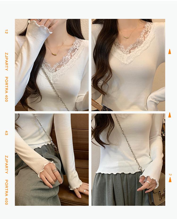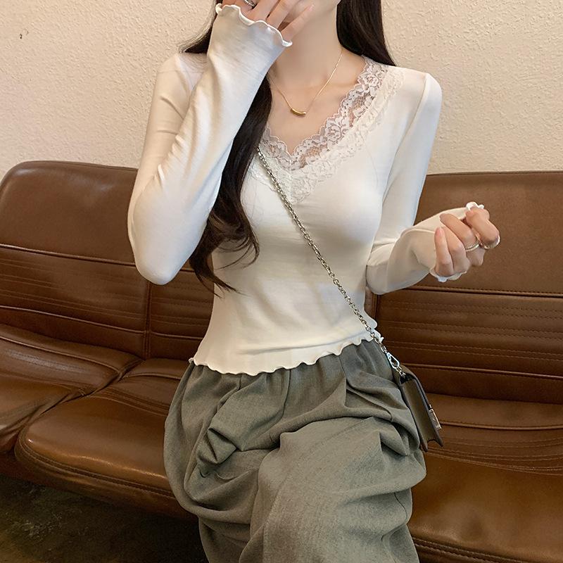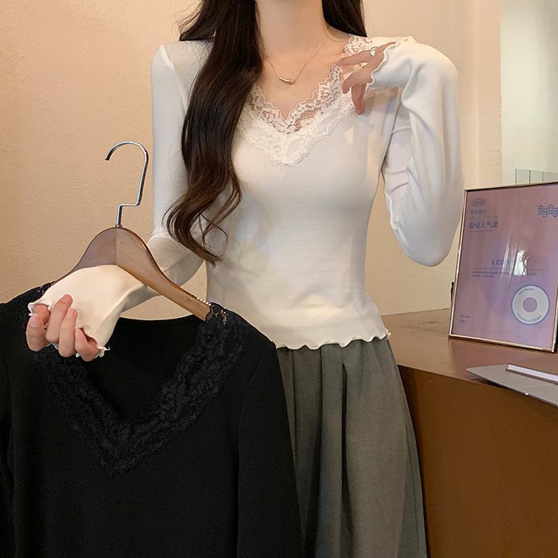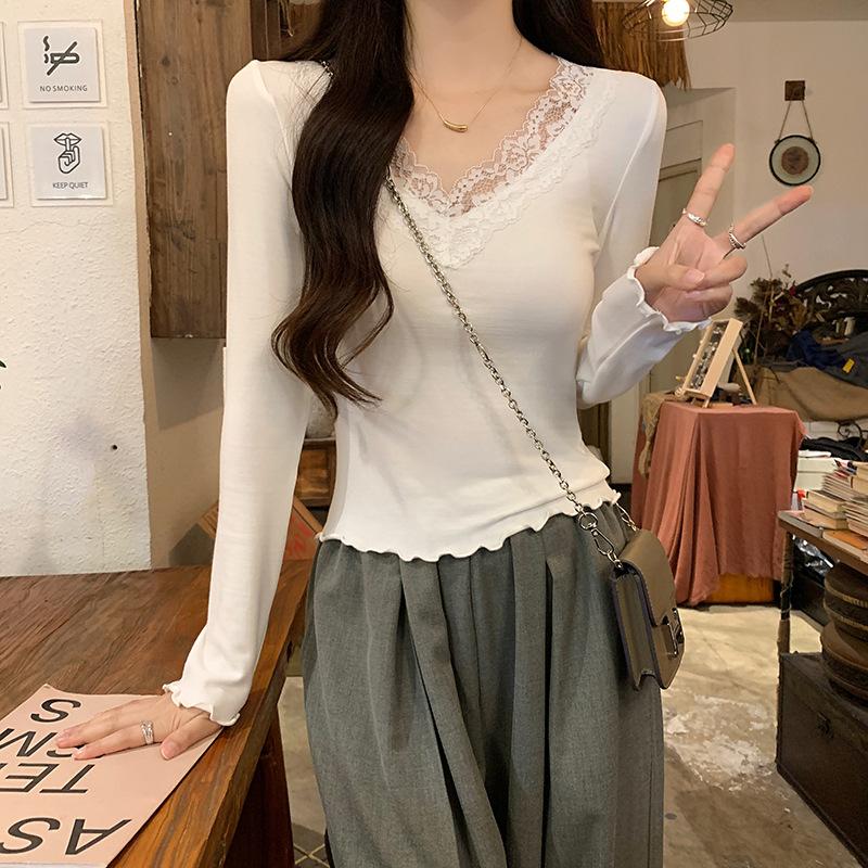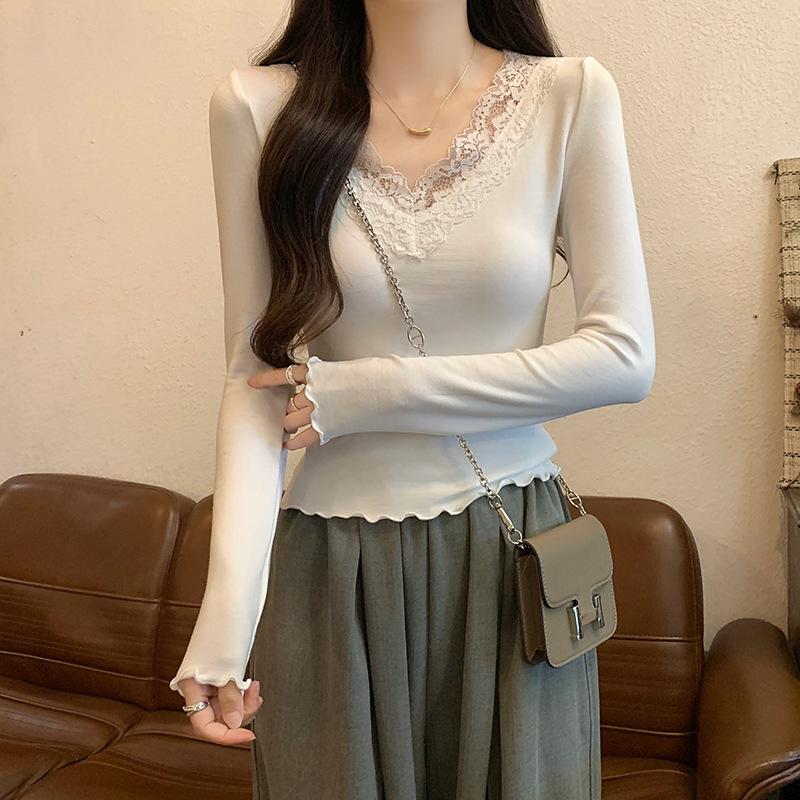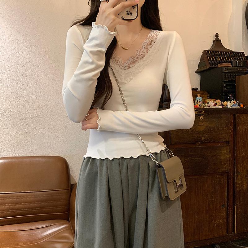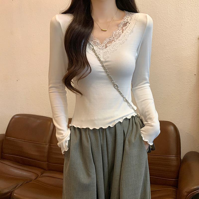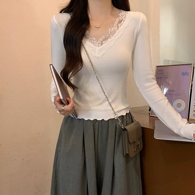 Camiseta Base Temperamental de Encaje con Cuello en V Ajustada Top Interior para Mujer Otoño Manga Larga Hombro Recto Camiseta Blanca Mujer Delgada