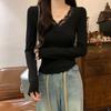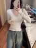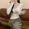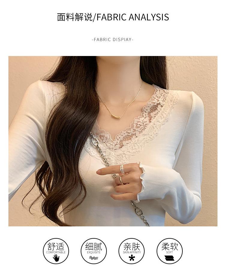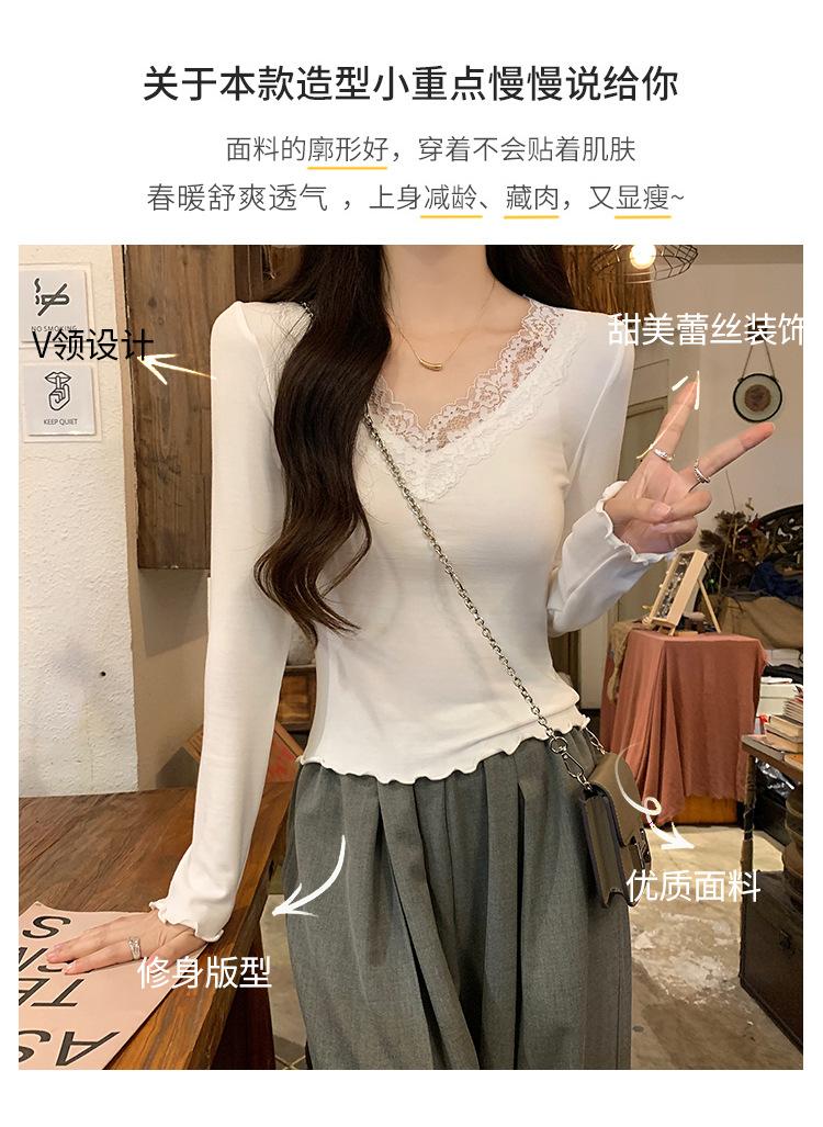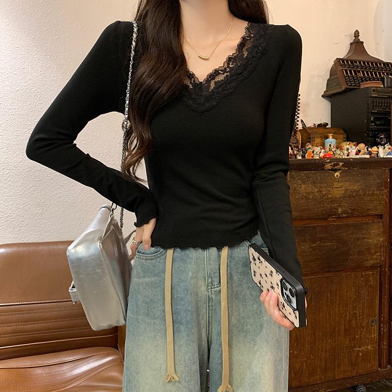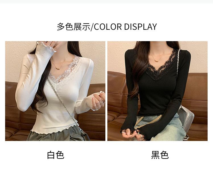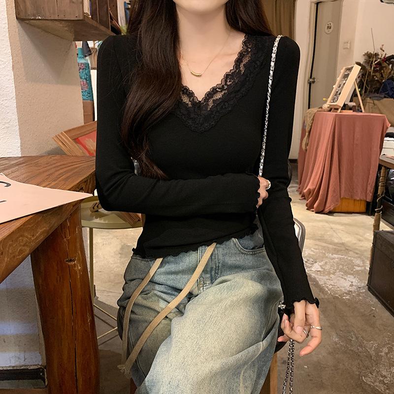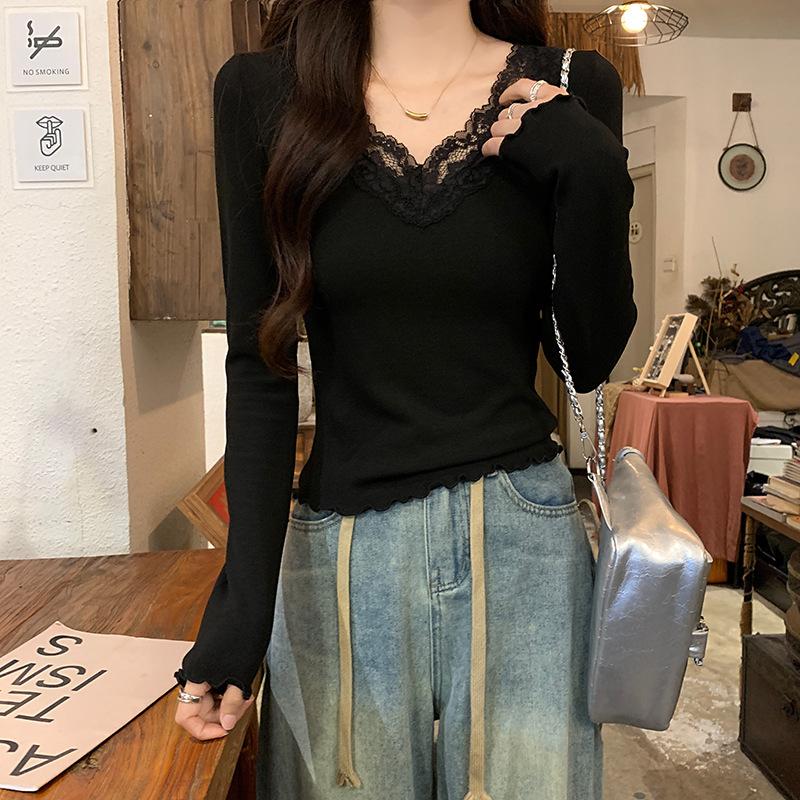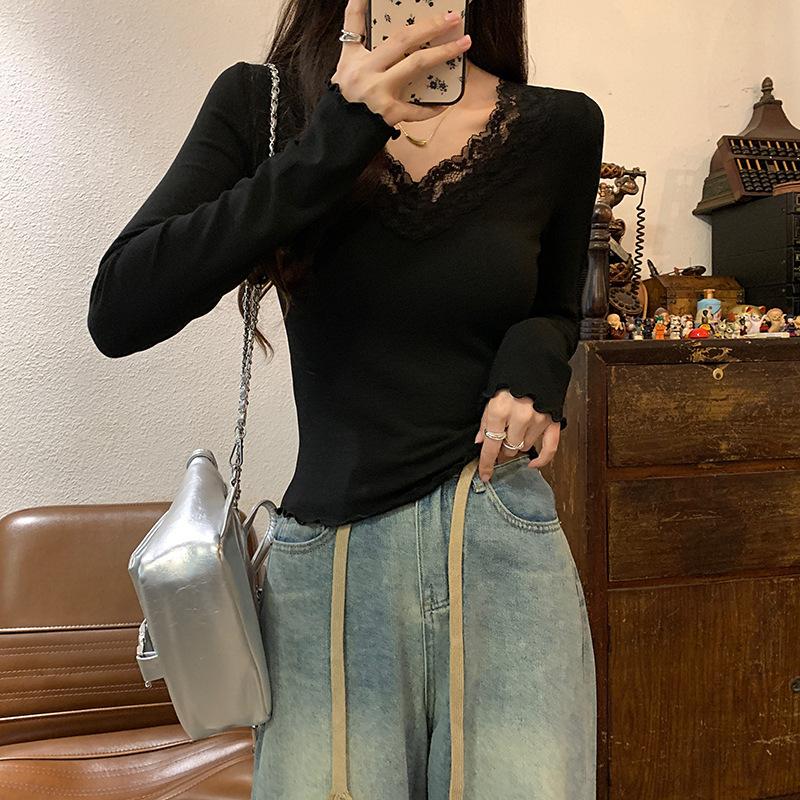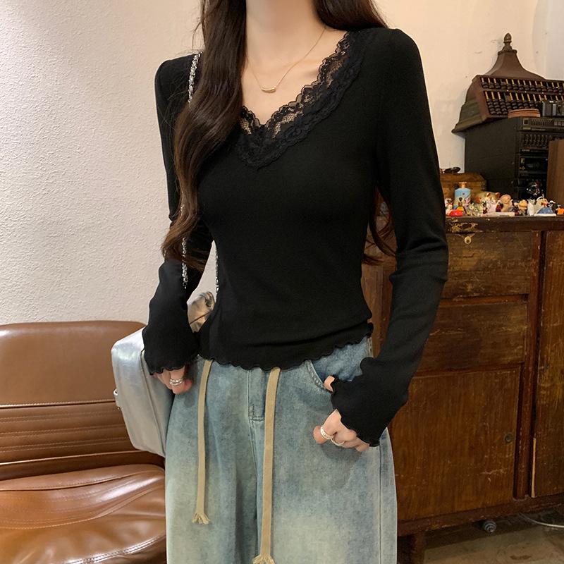Camiseta Base Temperamental de Encaje con Cuello en V Ajustada Top Interior para Mujer Otoño Manga Larga Hombro Recto Camiseta Blanca Mujer Delgada
