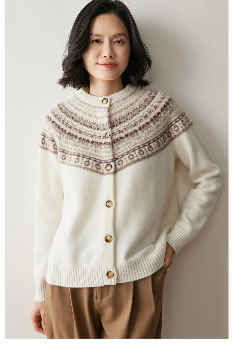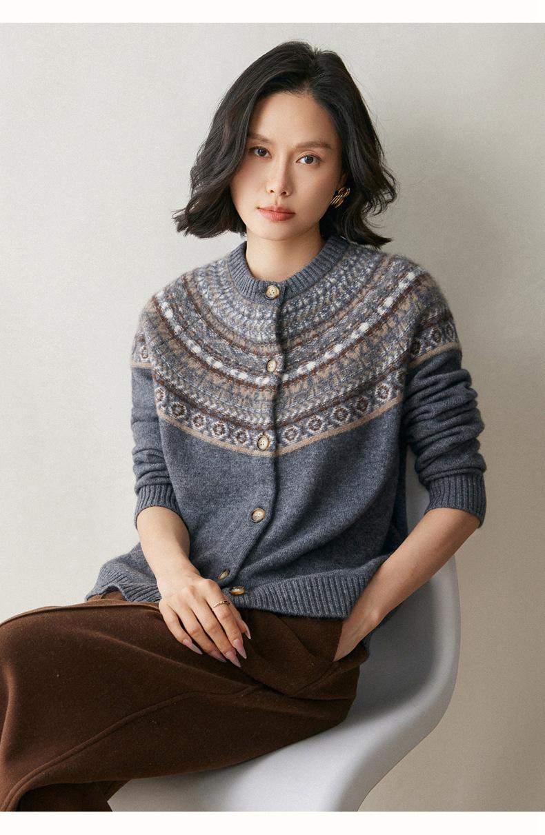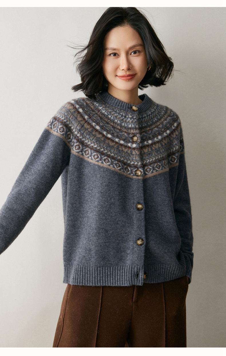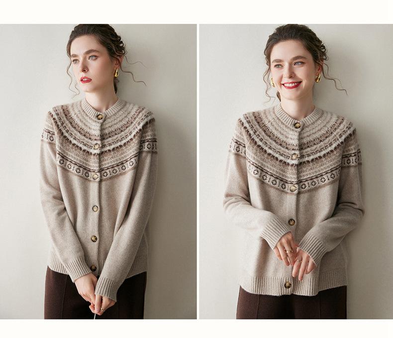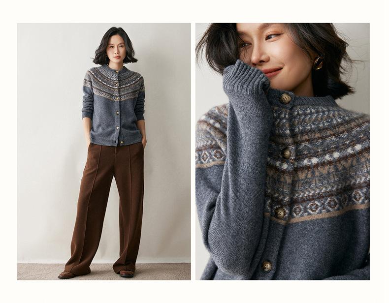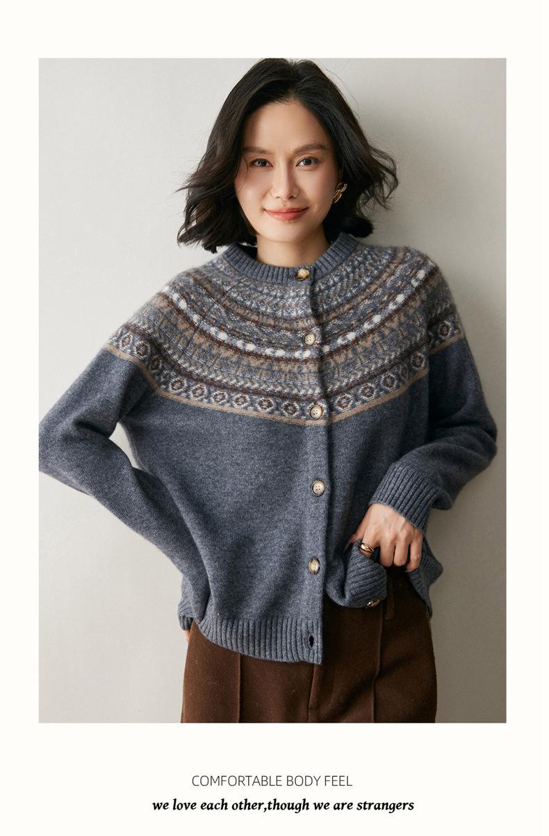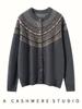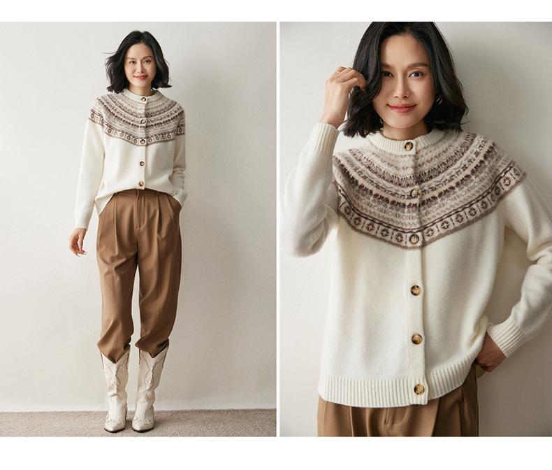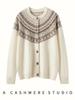 Cárdigan de Cachemira de Cuello Redondo Fair Isle para Mujer, Tejido Grueso Jacquard, Ropa Exterior Otoño Invierno, Suéter Holgado de Manga Larga