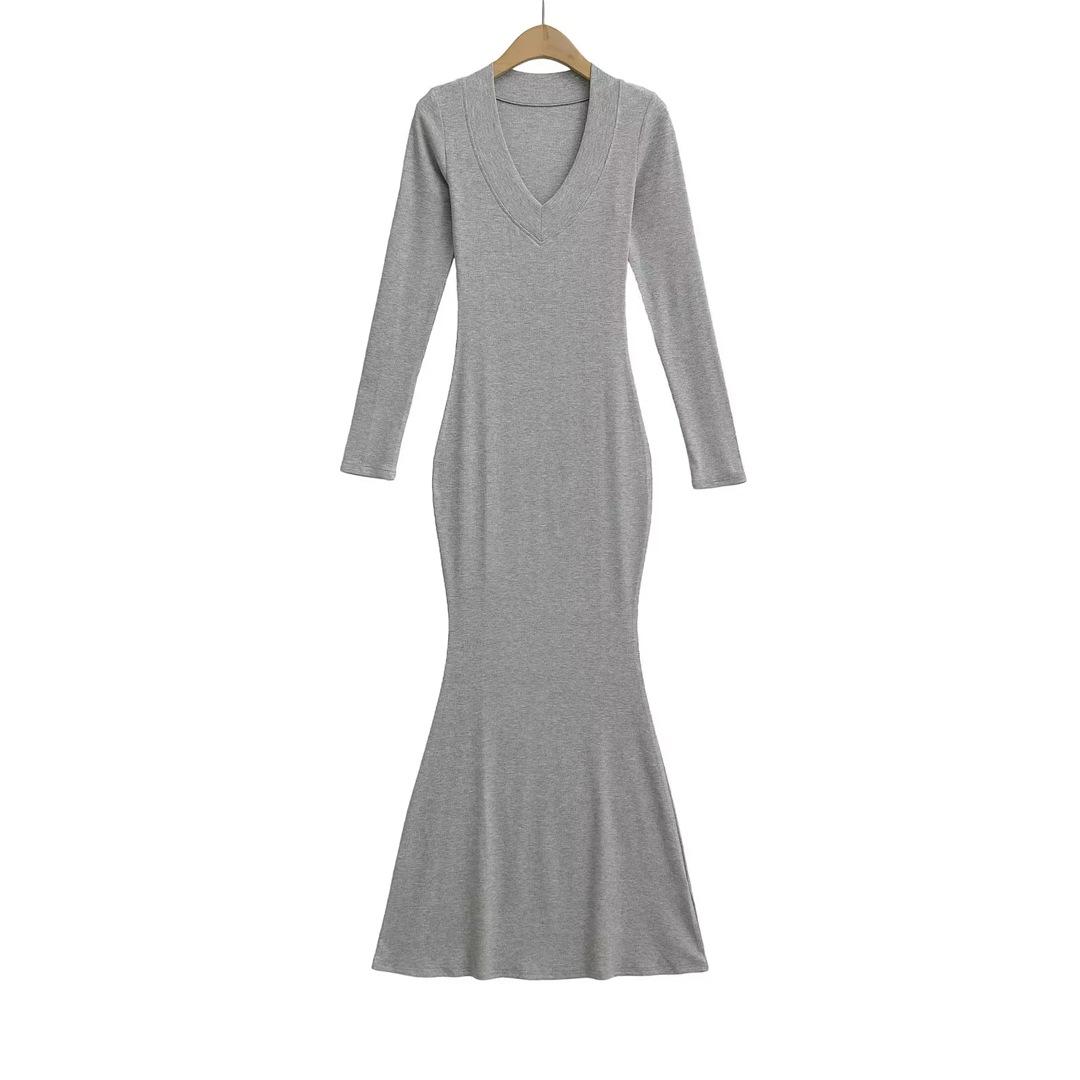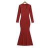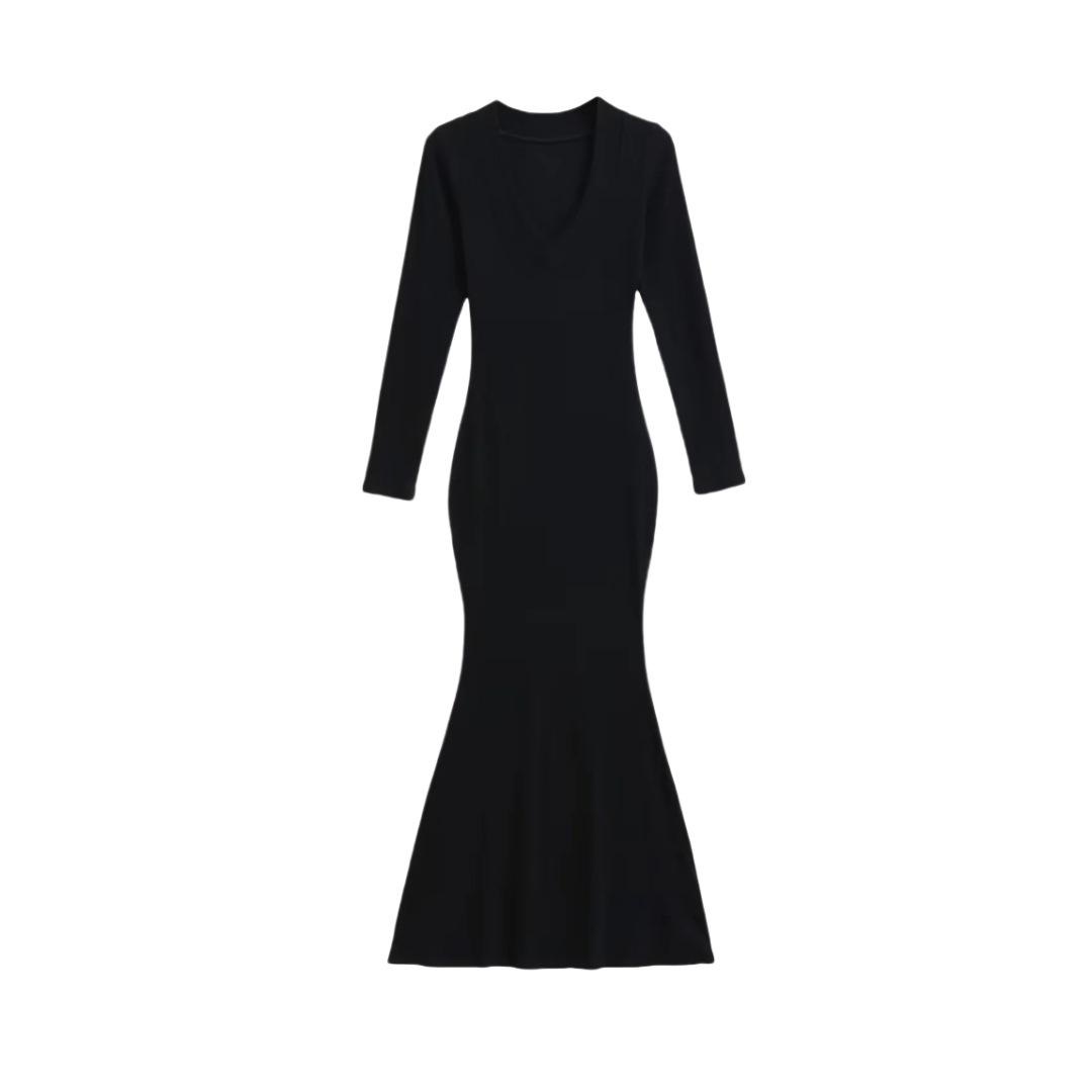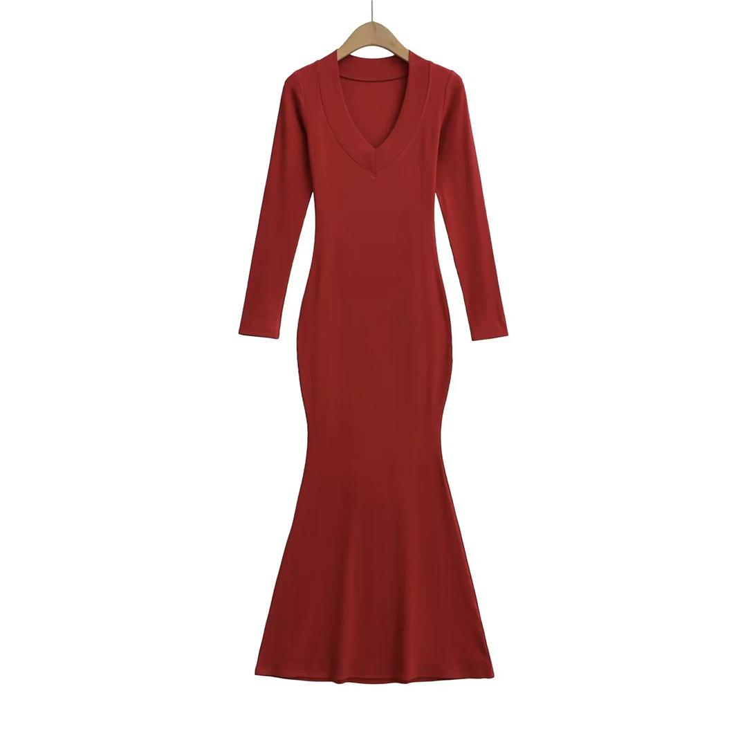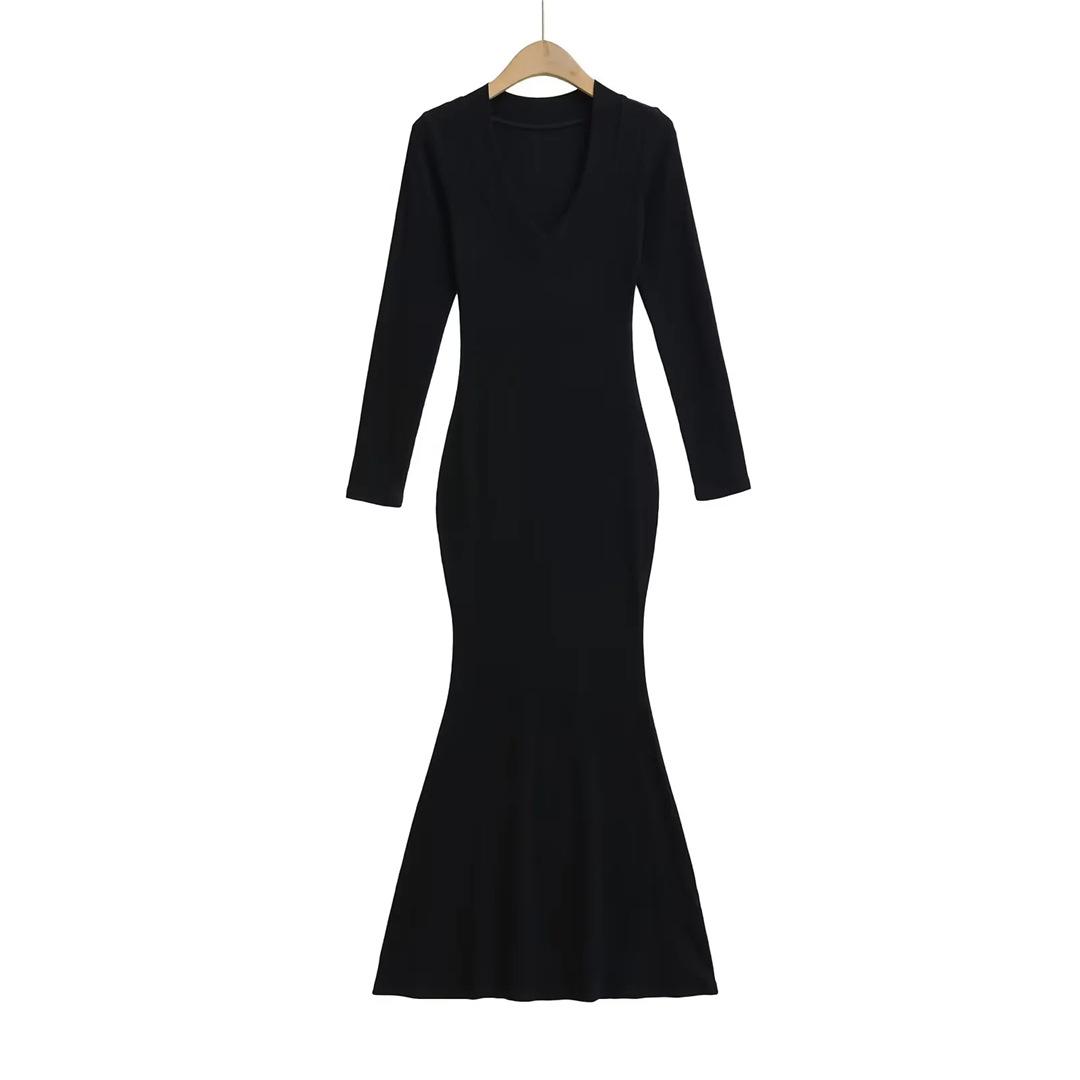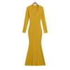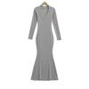 Vestido de Manga Larga Sexy para Chica Caliente de Color Sólido con Cuello en V Profundo para Mujer Europeo y Americano Retro Ajustado Ceñido a la Cintura con Caderas Envolventes Vestido Largo de Cola de Pez