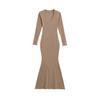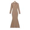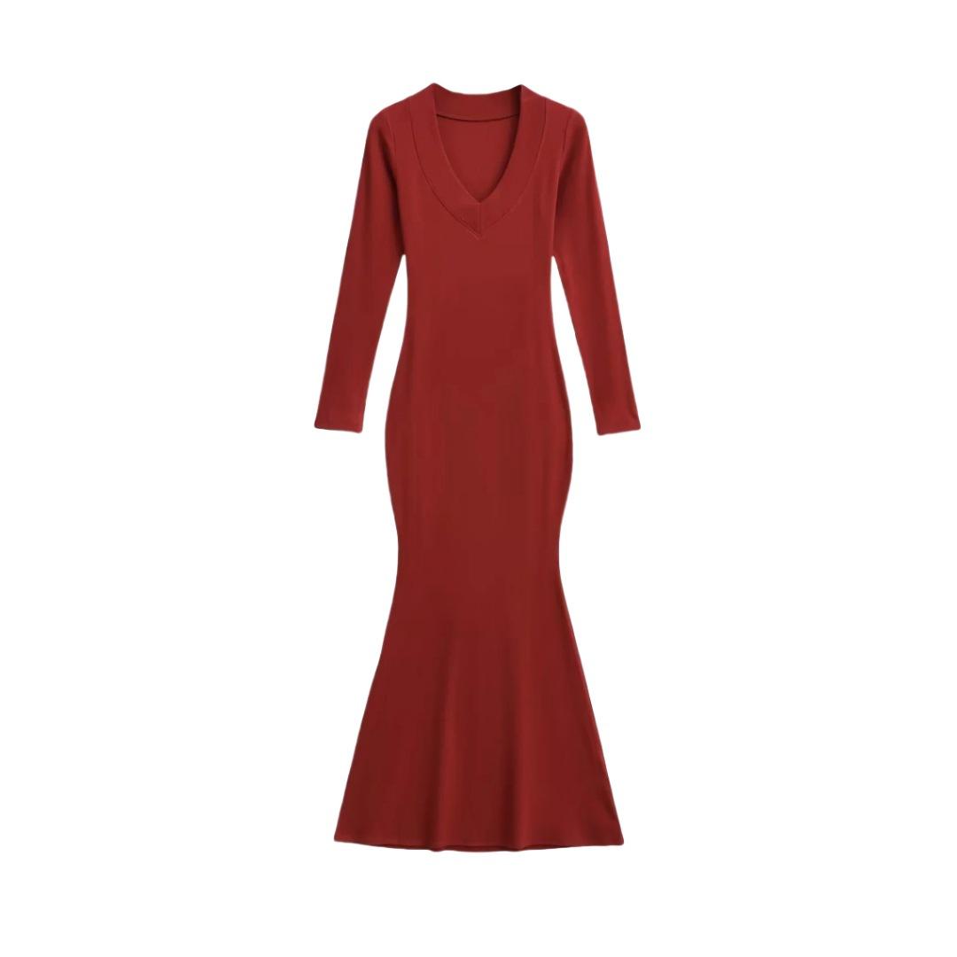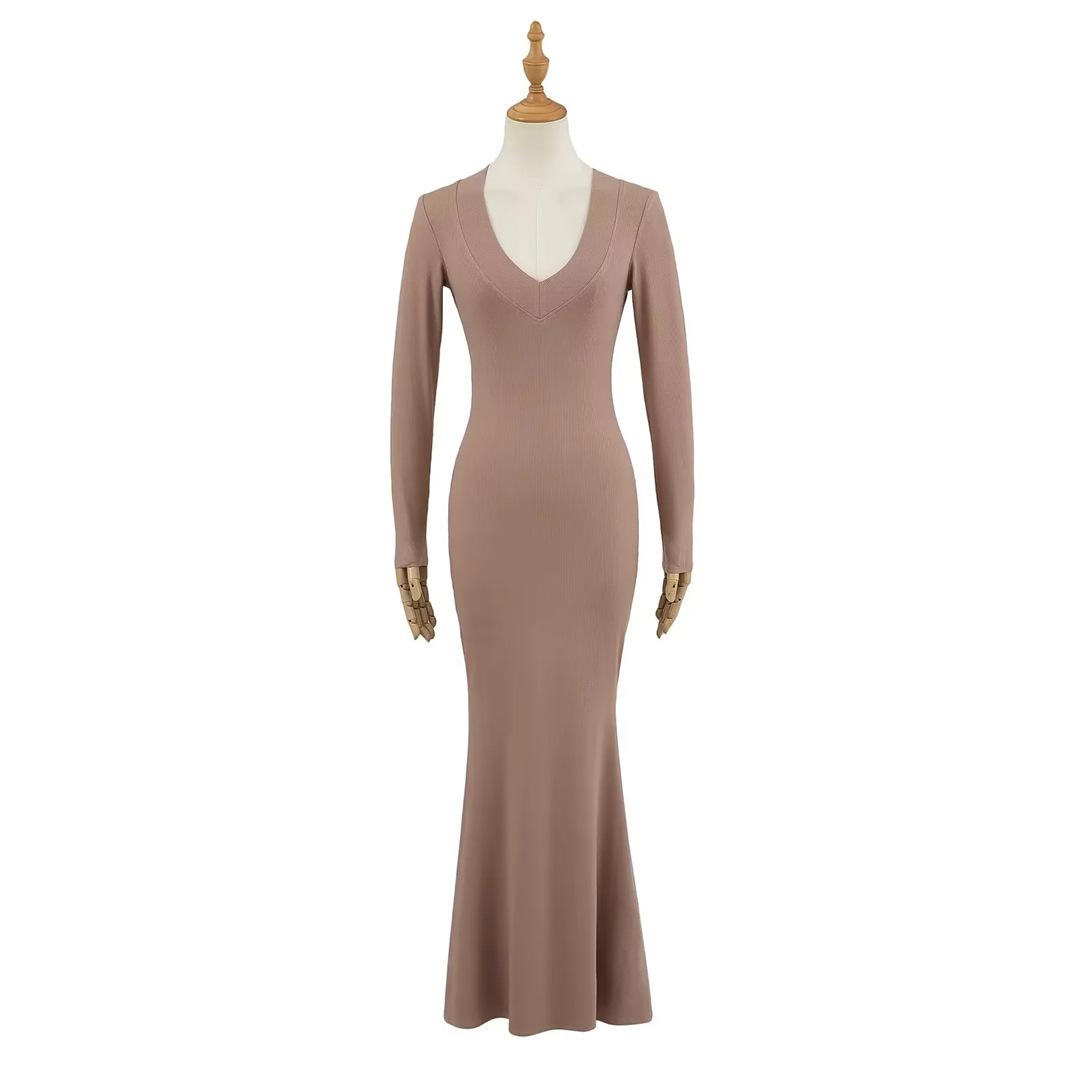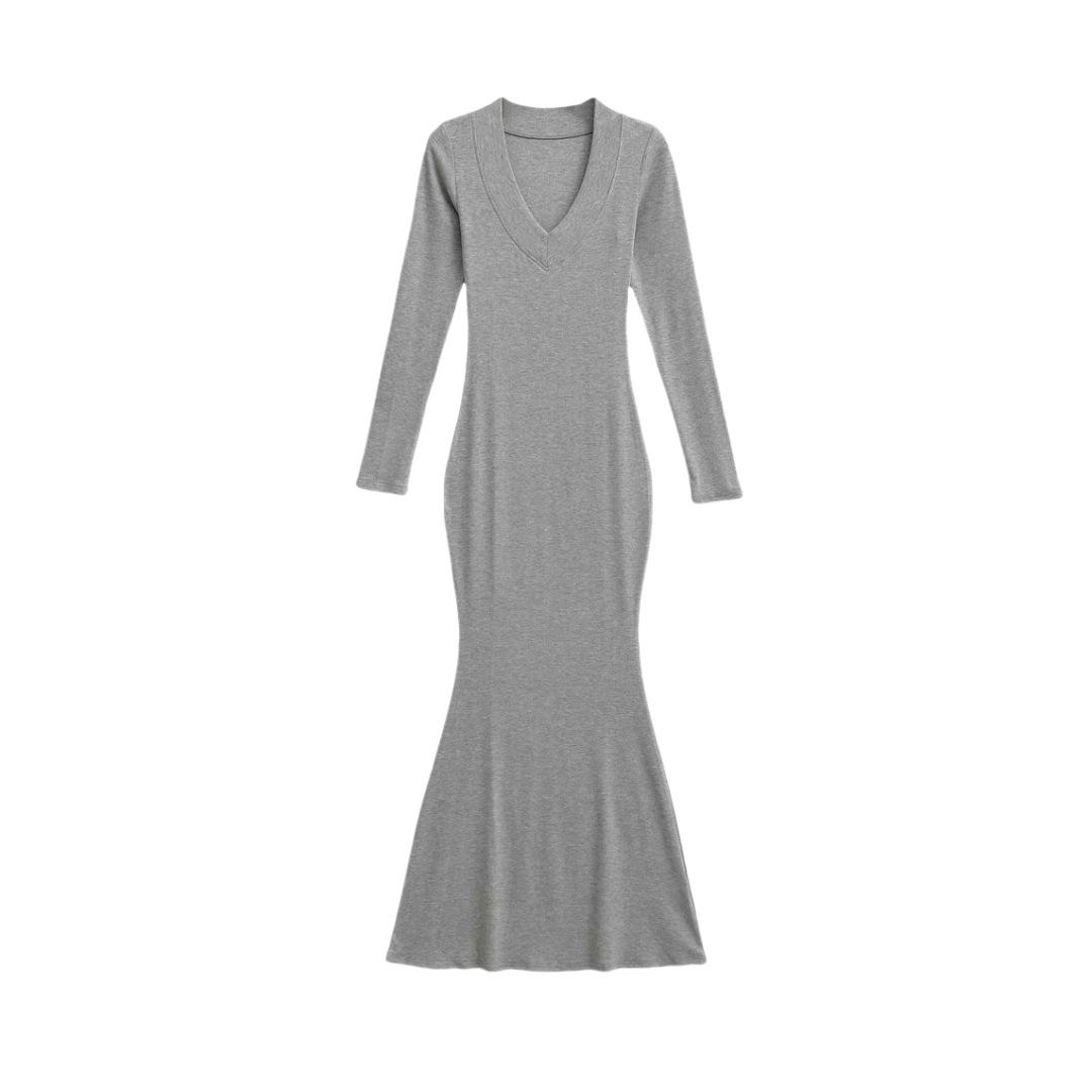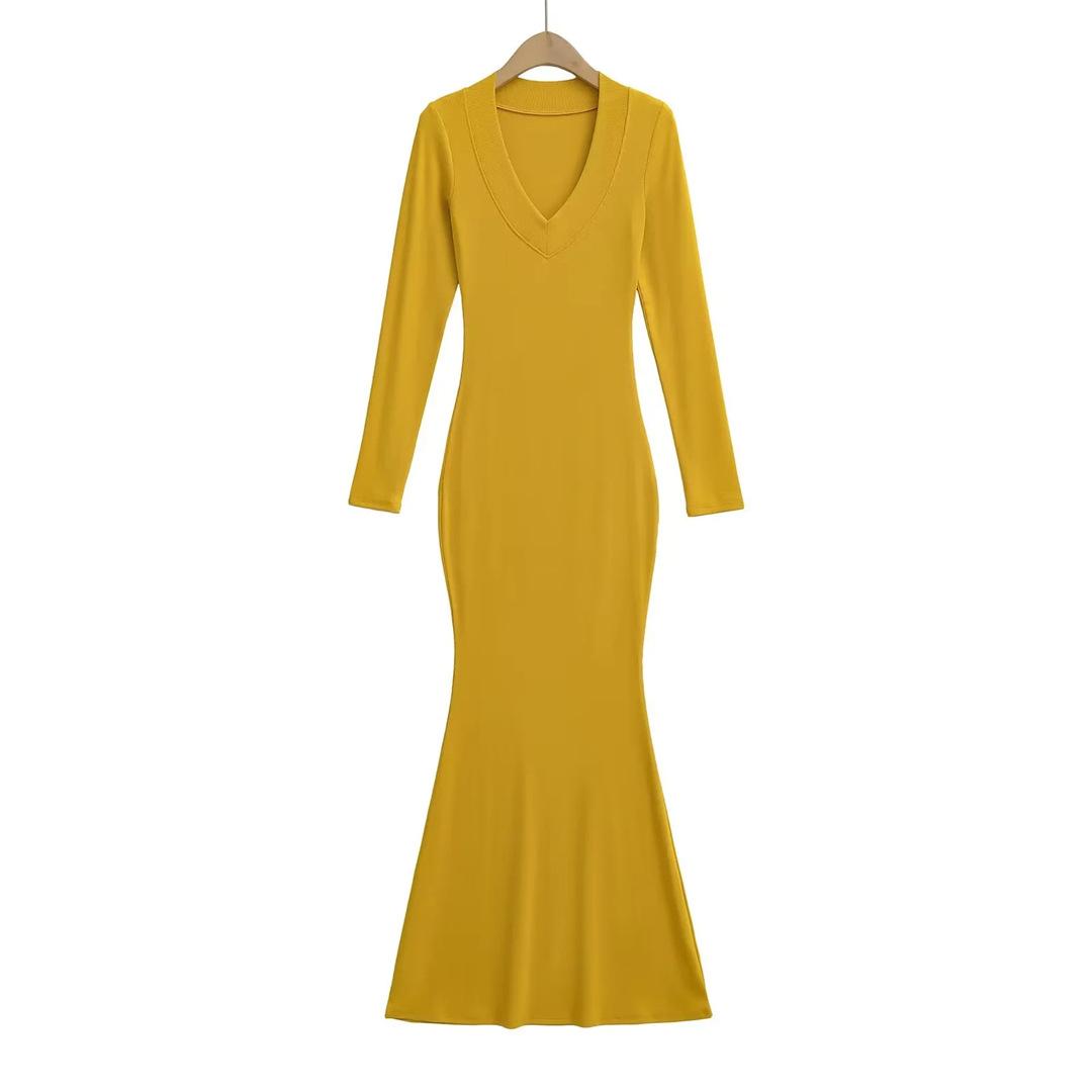Vestido de Manga Larga Sexy para Chica Caliente de Color Sólido con Cuello en V Profundo para Mujer Europeo y Americano Retro Ajustado Ceñido a la Cintura con Caderas Envolventes Vestido Largo de Cola de Pez