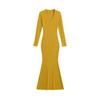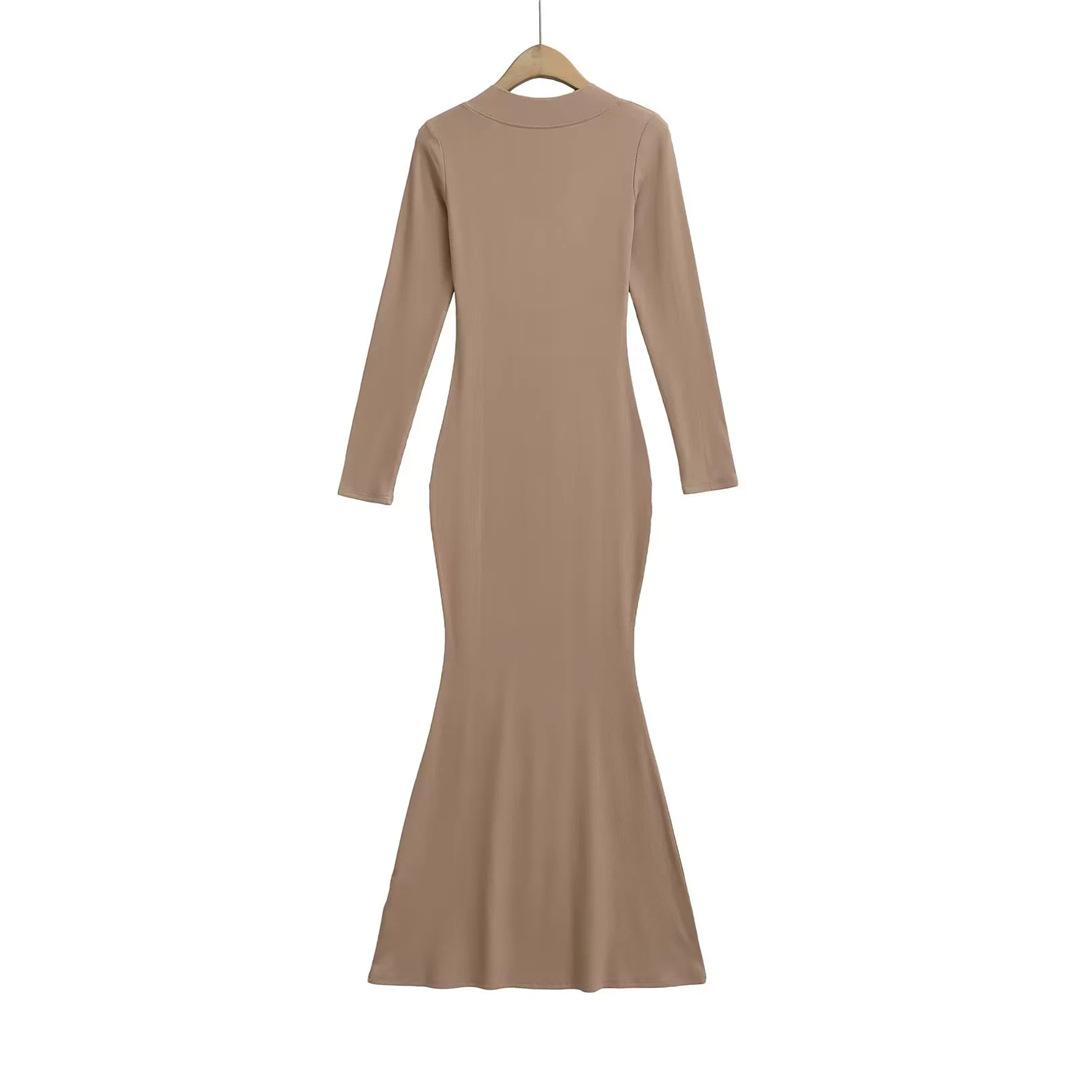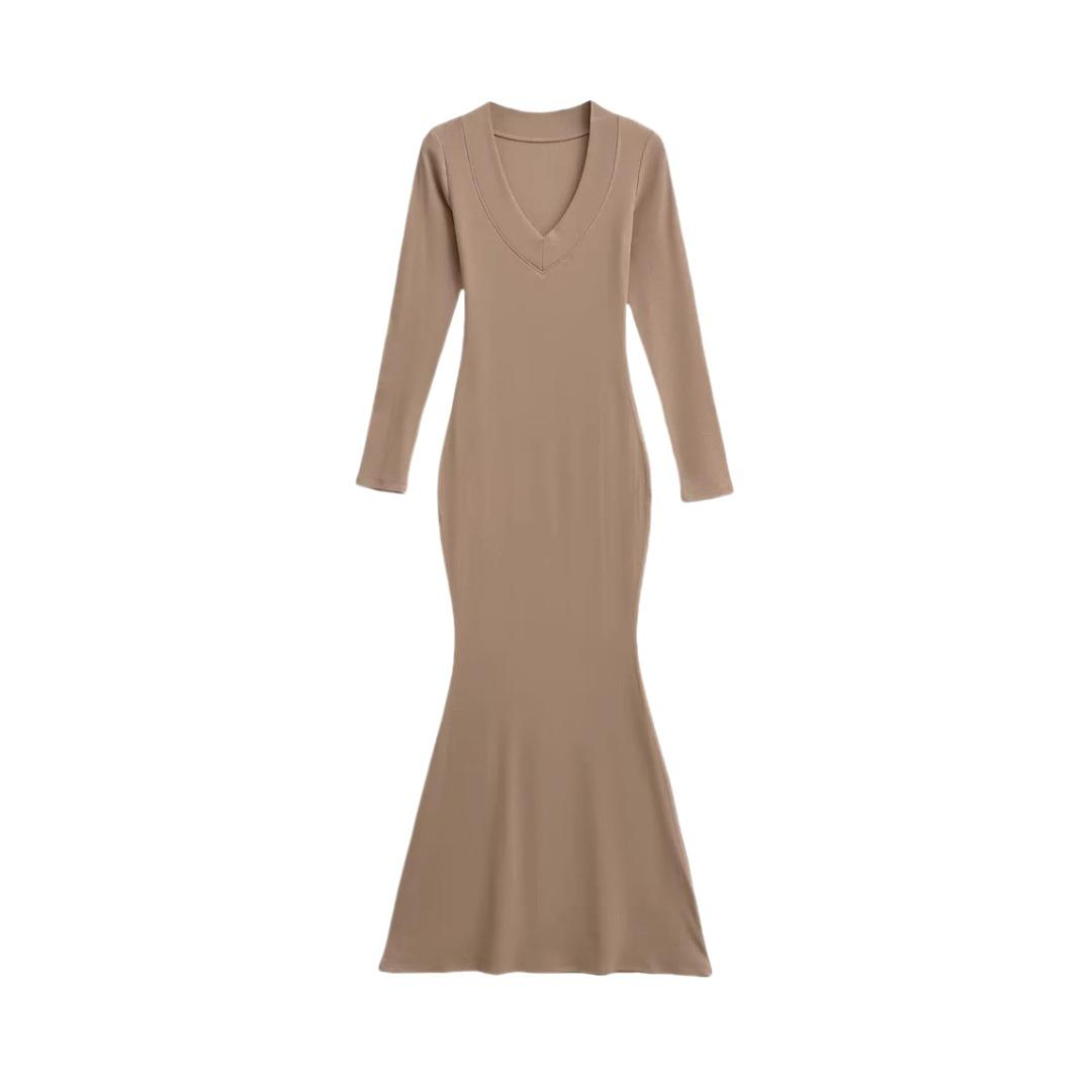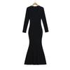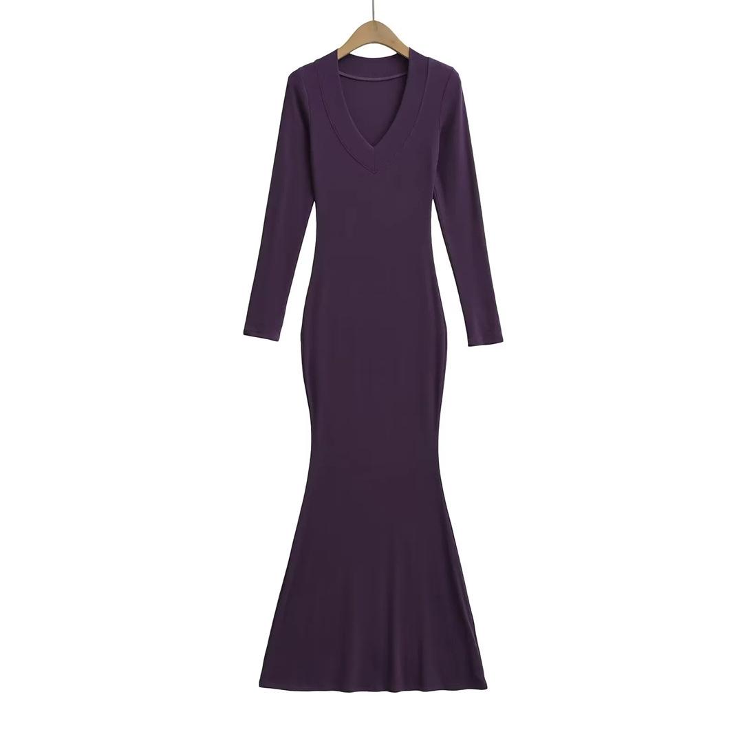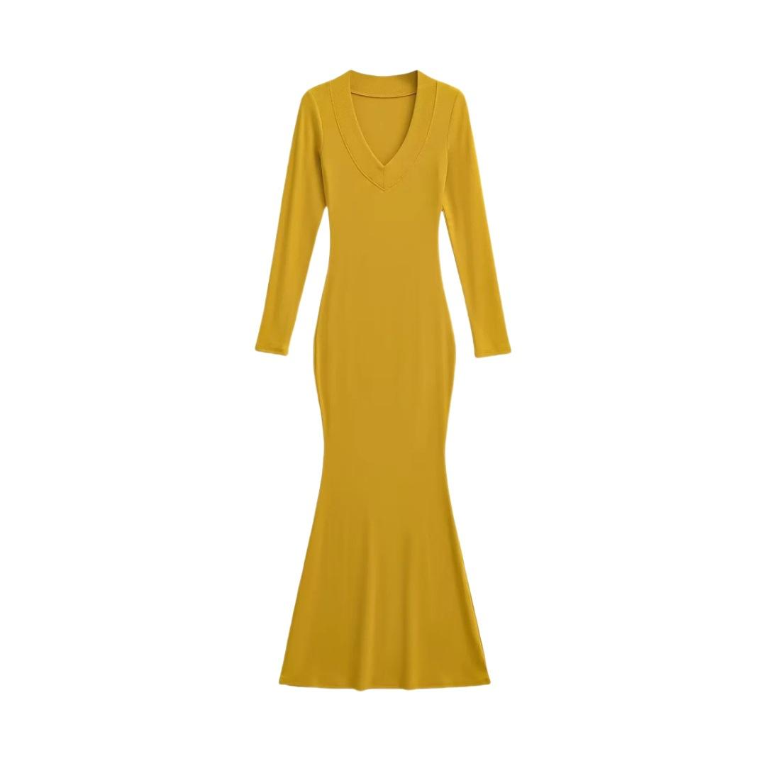 Vestido de Manga Larga Sexy para Chica Caliente de Color Sólido con Cuello en V Profundo para Mujer Europeo y Americano Retro Ajustado Ceñido a la Cintura con Caderas Envolventes Vestido Largo de Cola de Pez