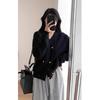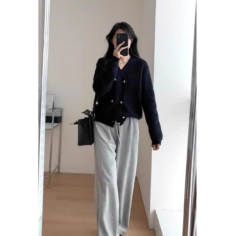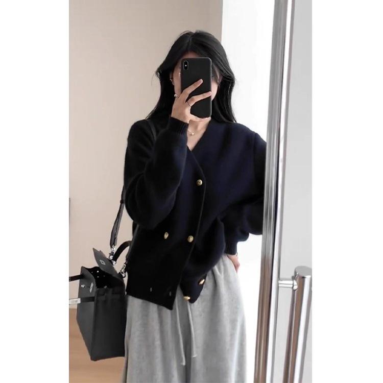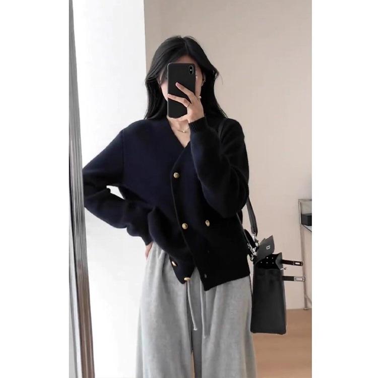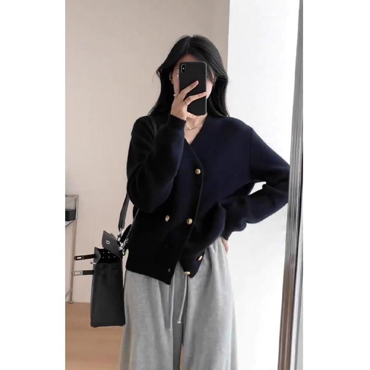 Suéter Otoño e Invierno Retro Francés Negro Cuello en V para Mujer Pequeño Aroma Estilo Perezoso Cárdigan Tejido Retro Abrigo Top