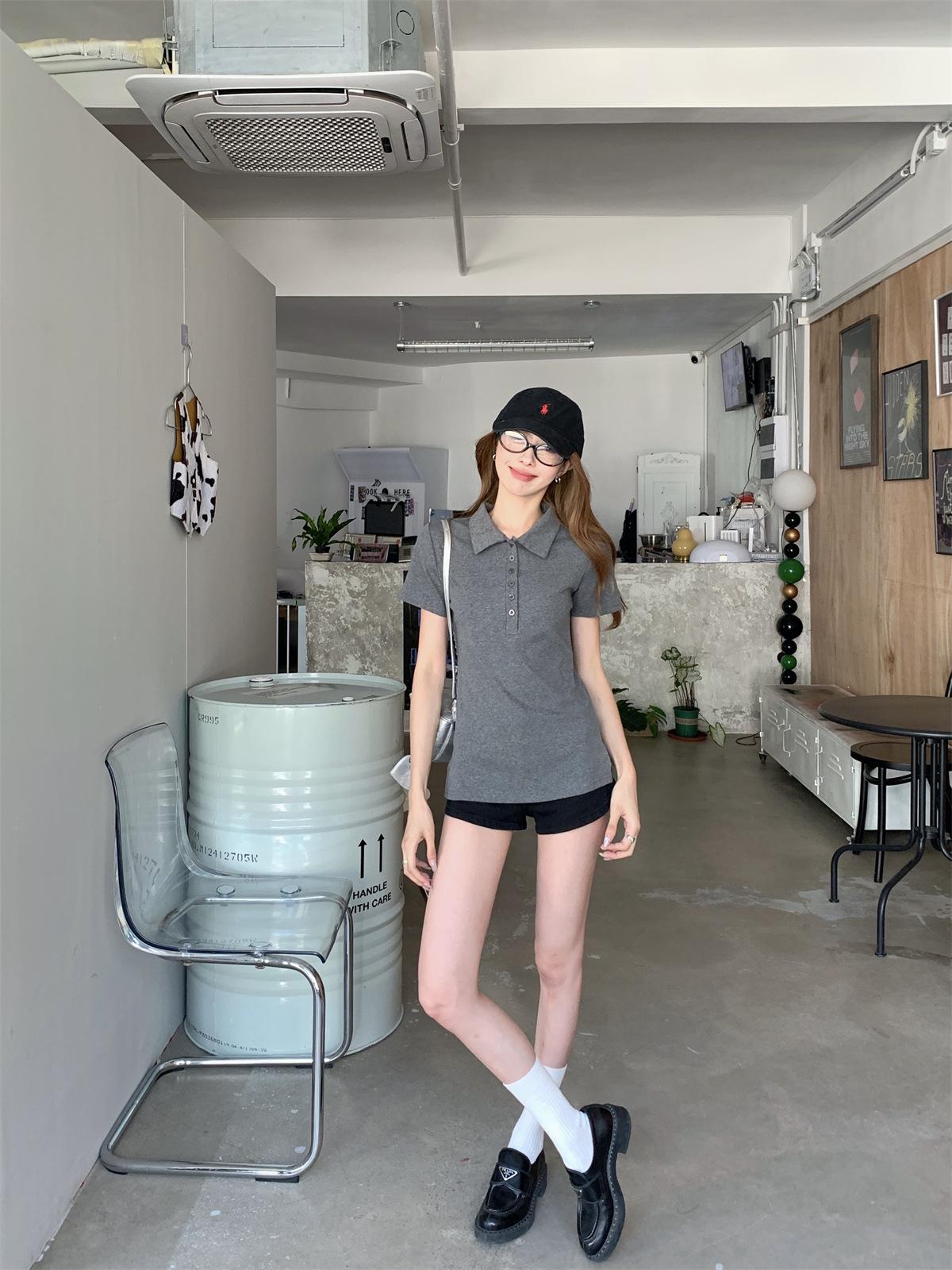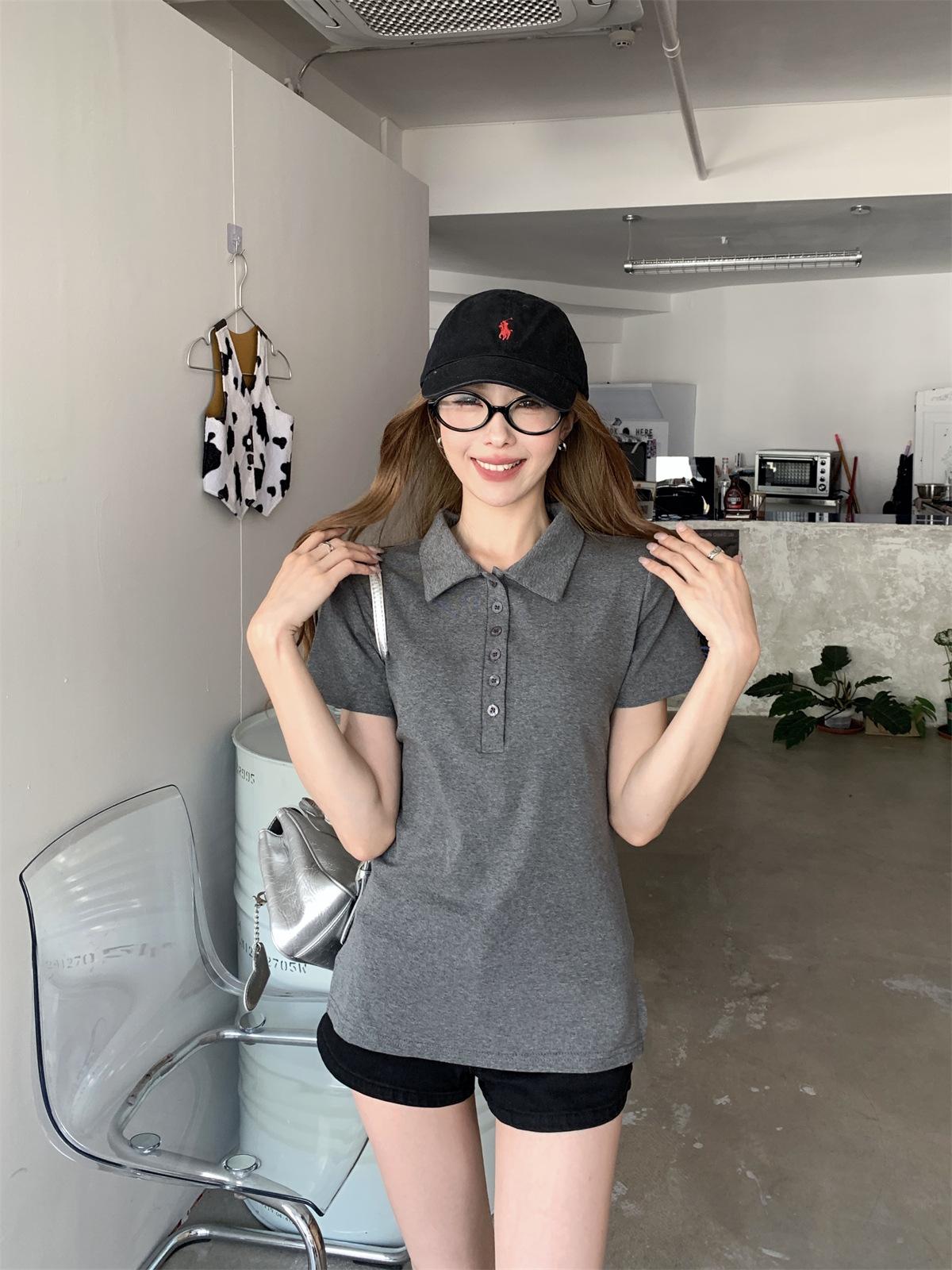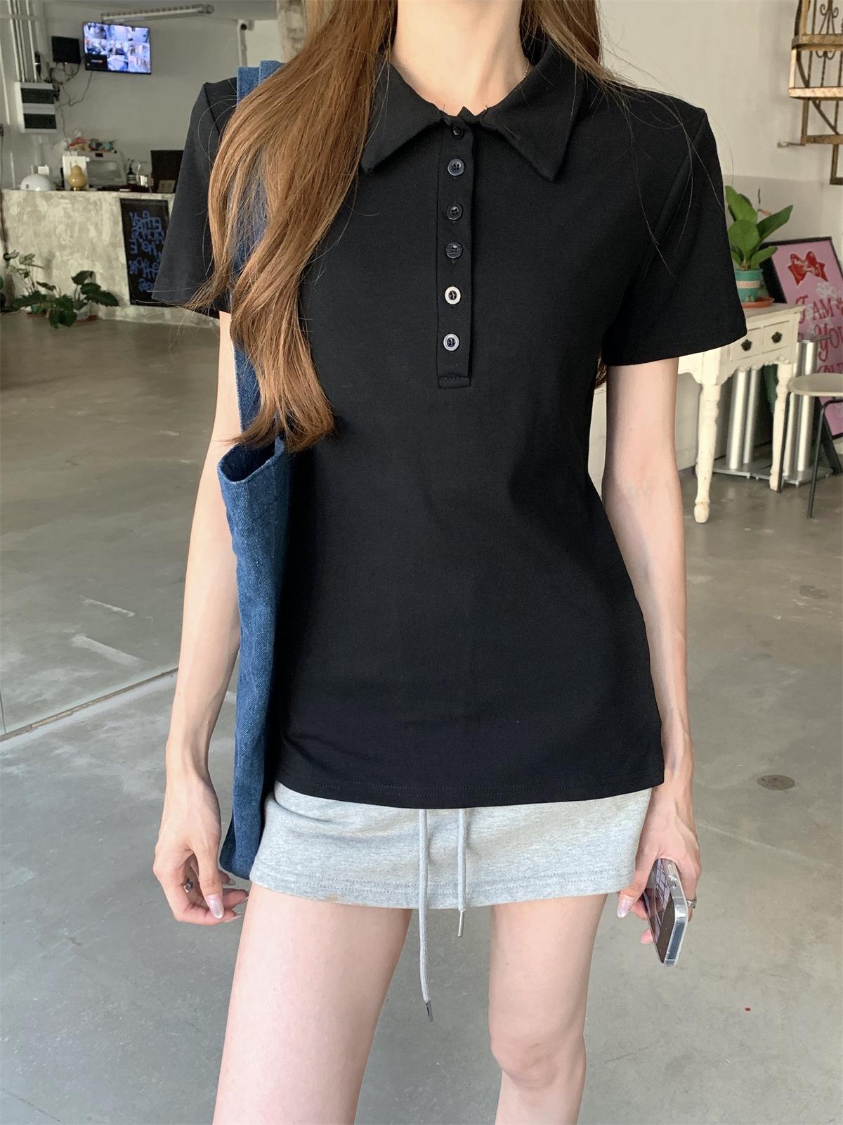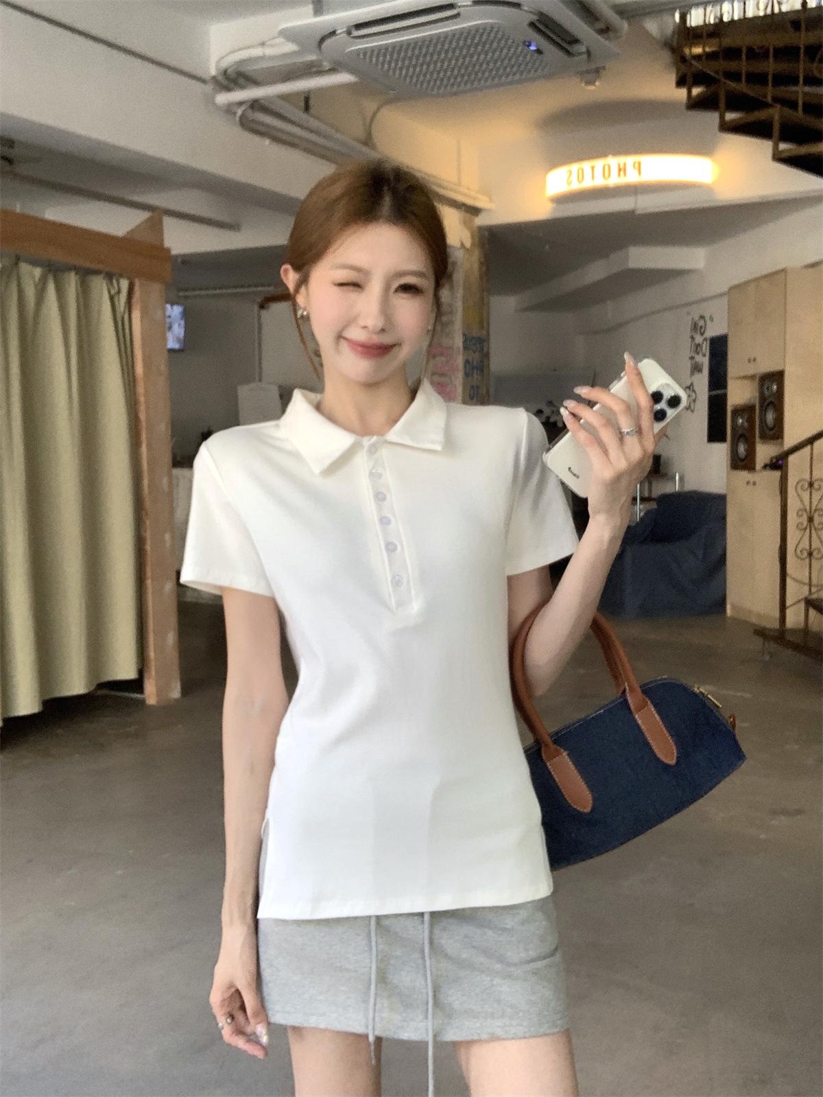 Foto Real de Verano Estilo Coreano Cuello Polo Diseño de Botones Versátil Simple Camiseta de Manga Corta Tops para Mujer 85487
