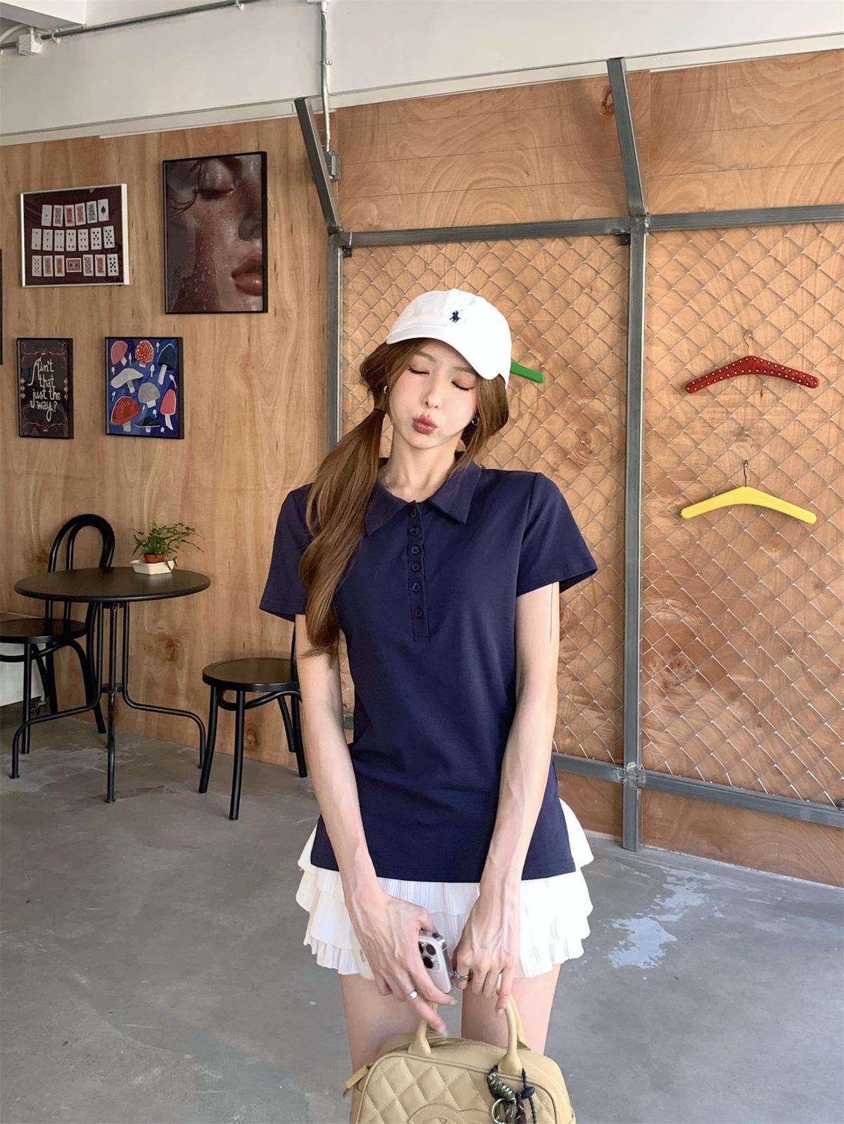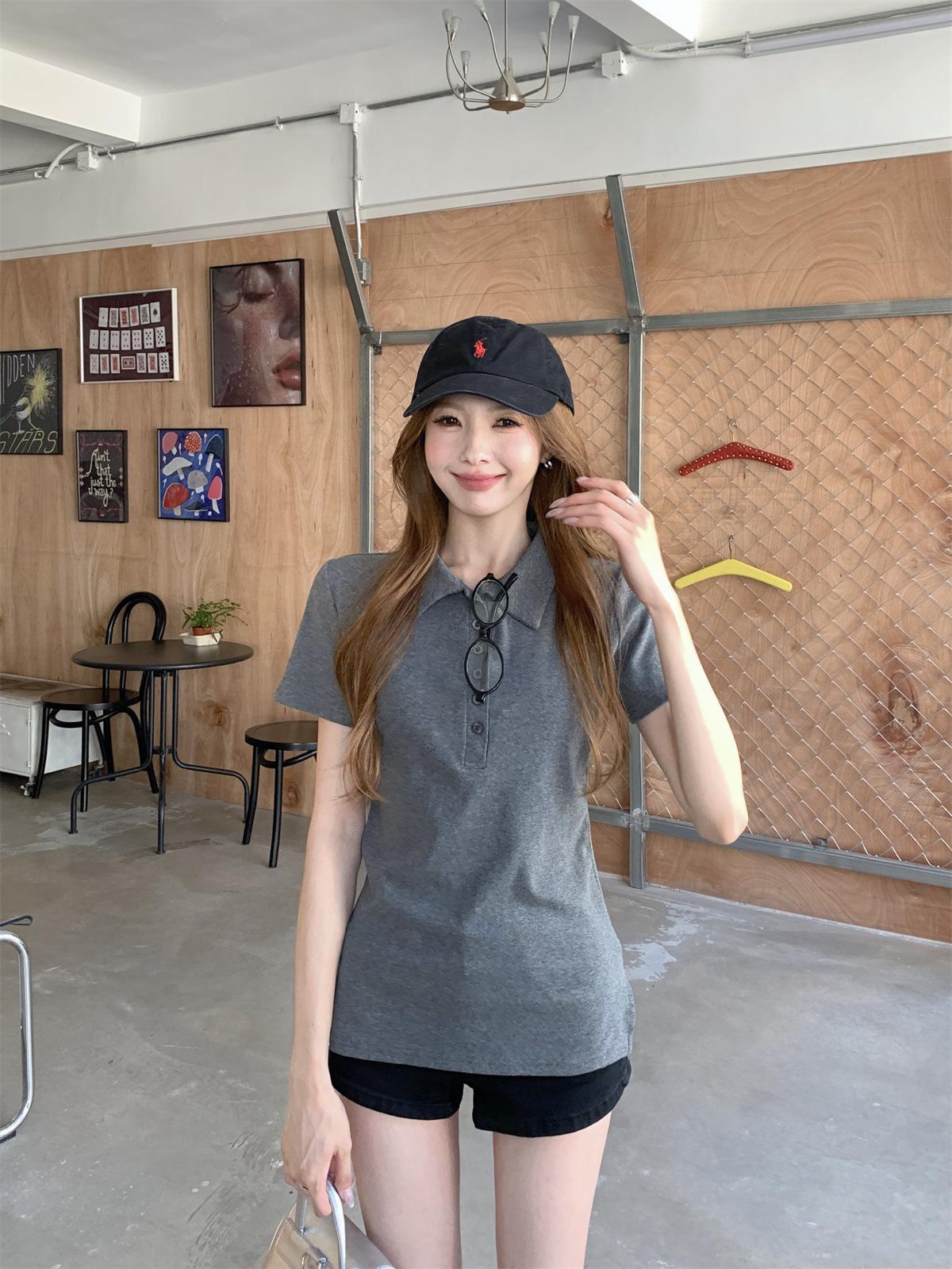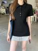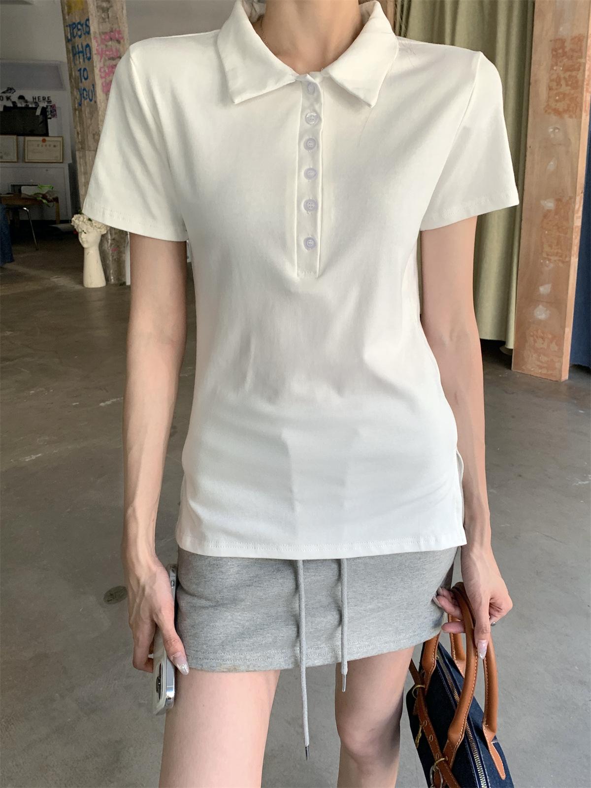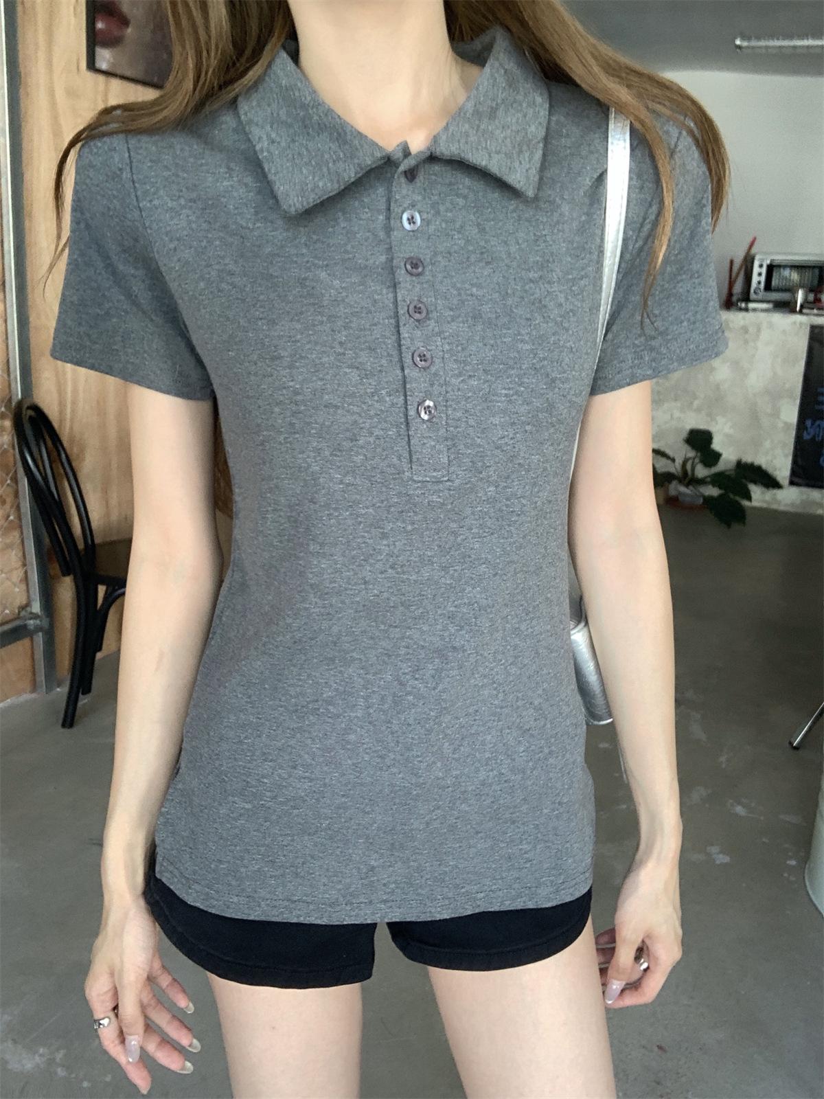 Foto Real de Verano Estilo Coreano Cuello Polo Diseño de Botones Versátil Simple Camiseta de Manga Corta Tops para Mujer 85487