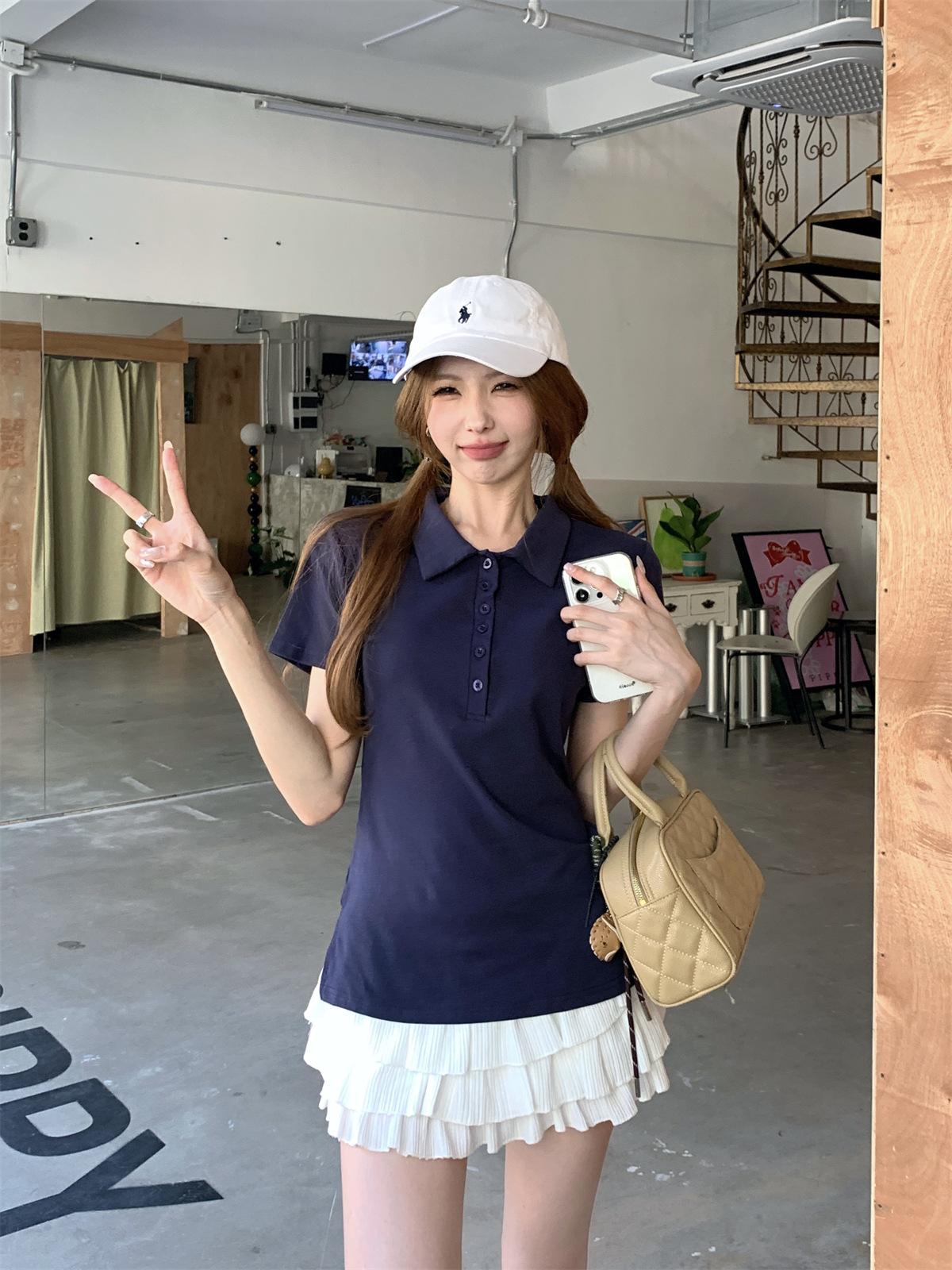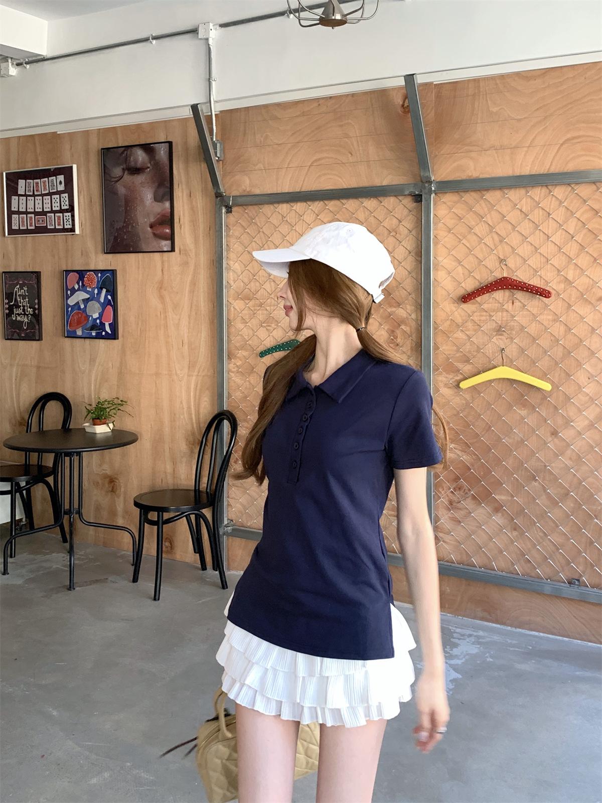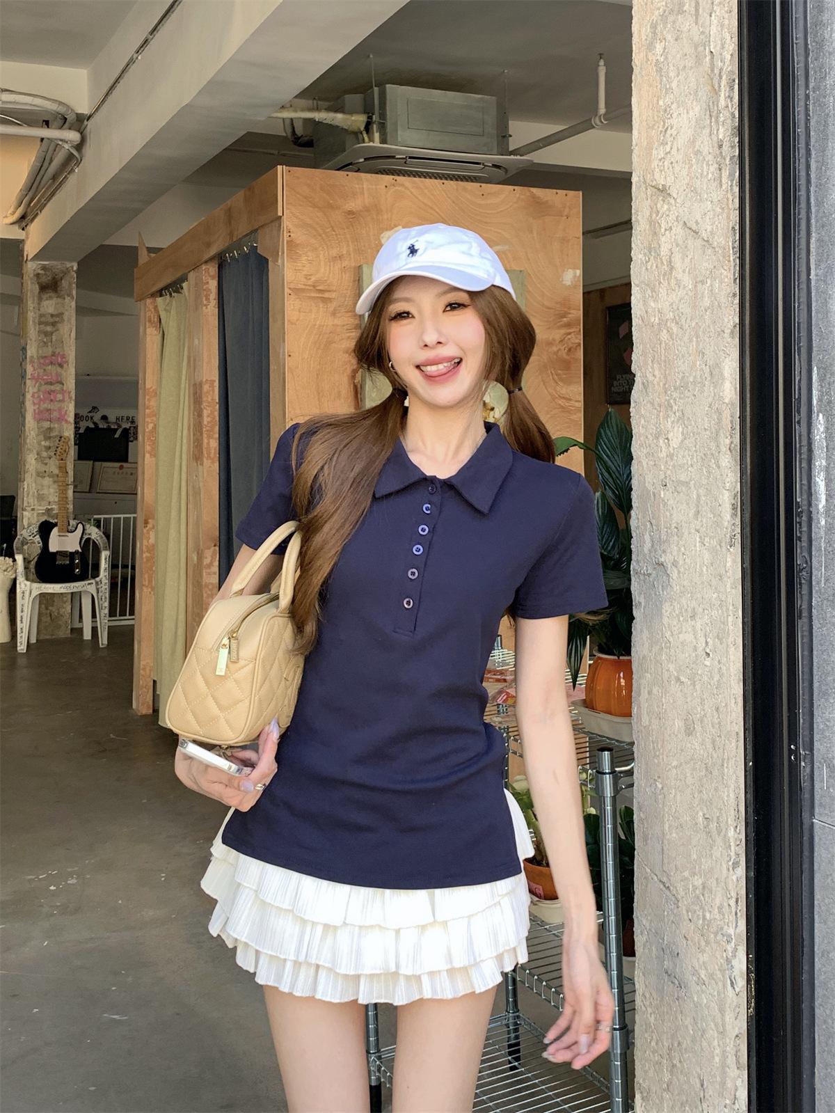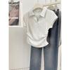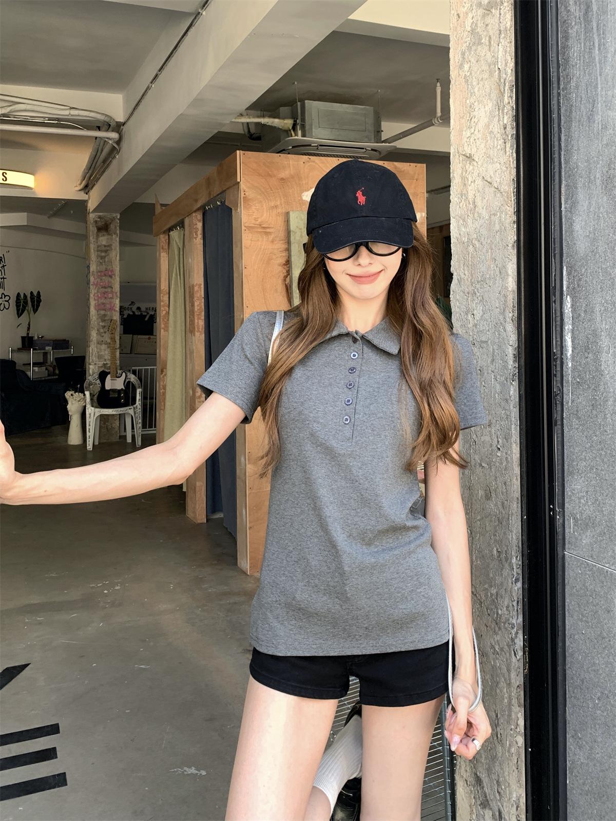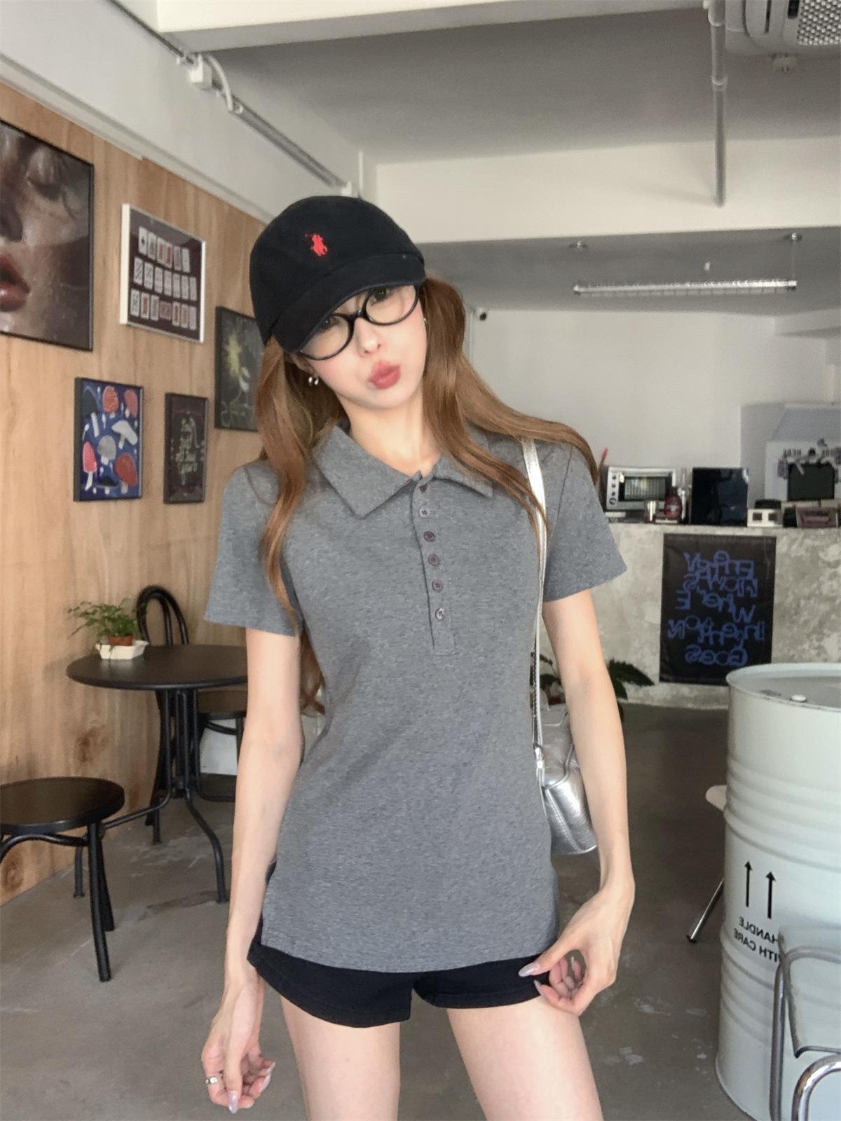 Foto Real de Verano Estilo Coreano Cuello Polo Diseño de Botones Versátil Simple Camiseta de Manga Corta Tops para Mujer 85487