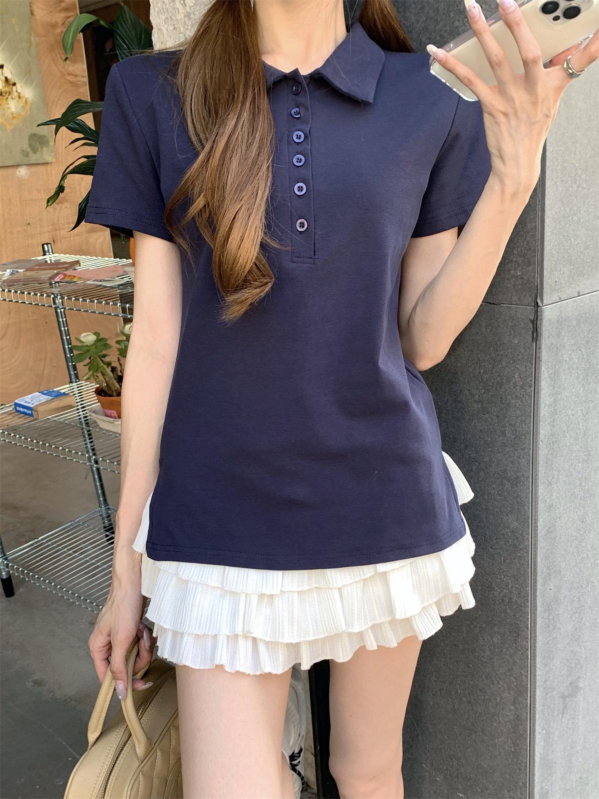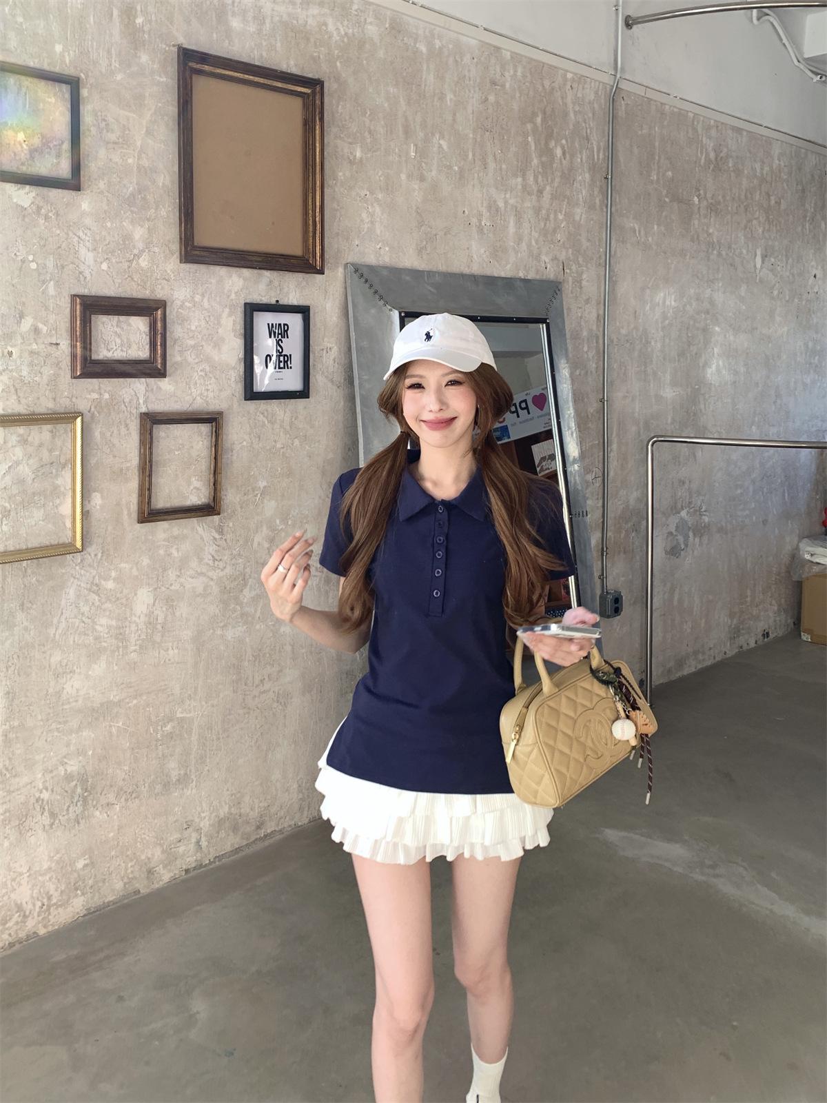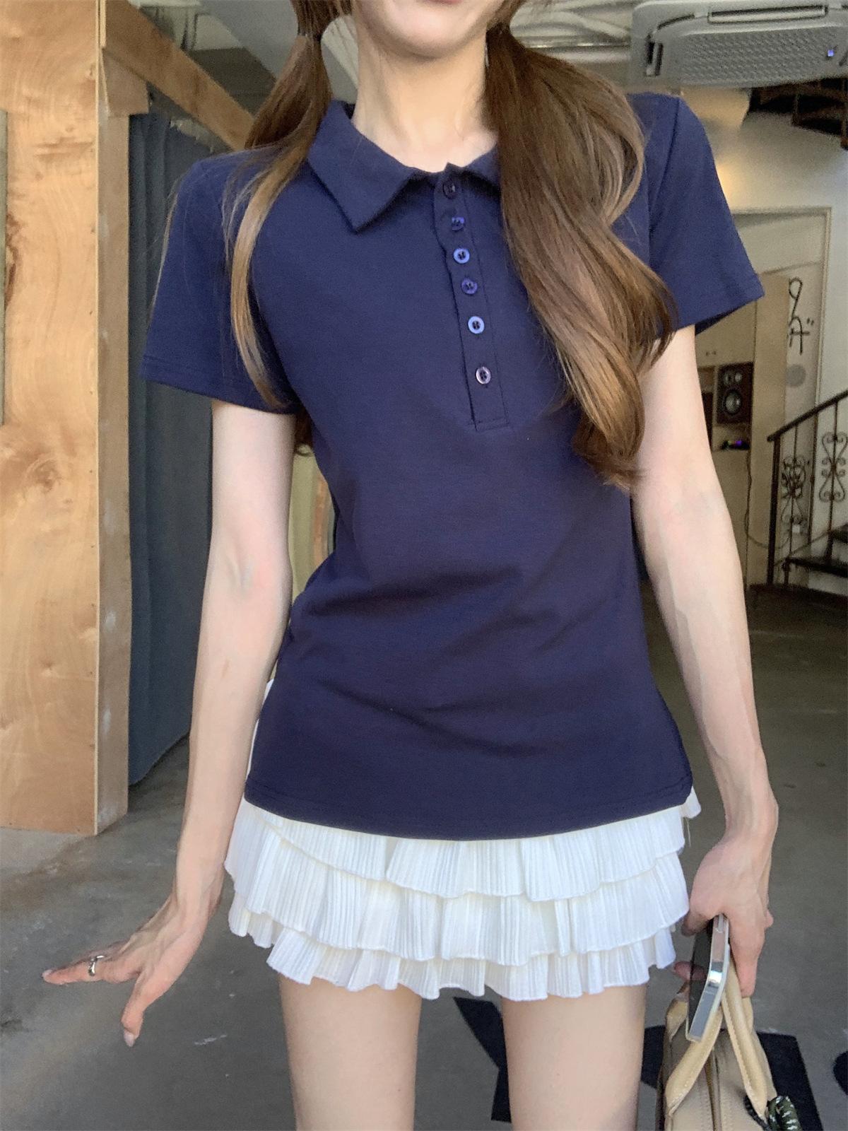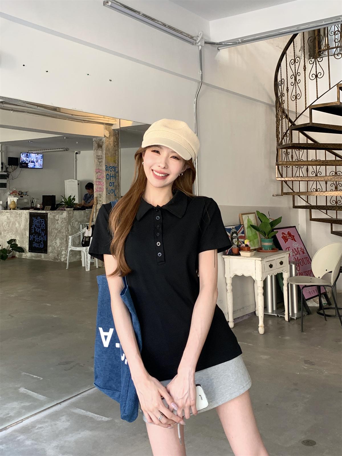 Foto Real de Verano Estilo Coreano Cuello Polo Diseño de Botones Versátil Simple Camiseta de Manga Corta Tops para Mujer 85487