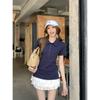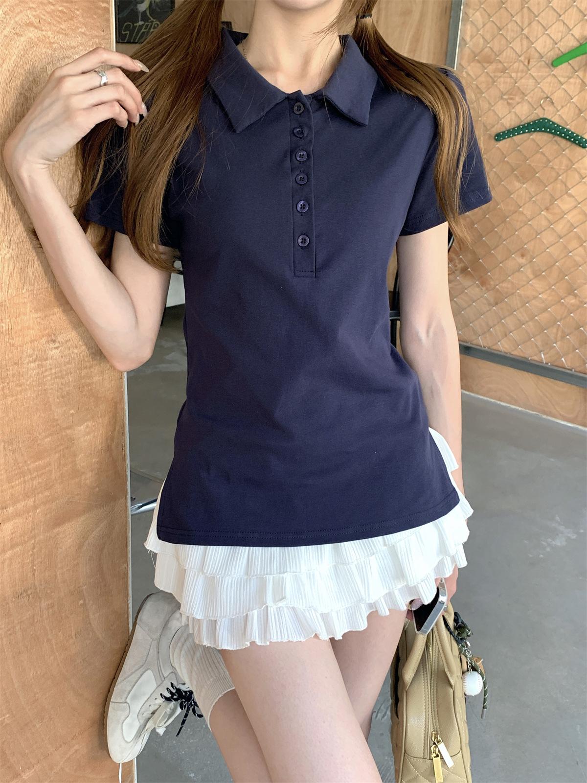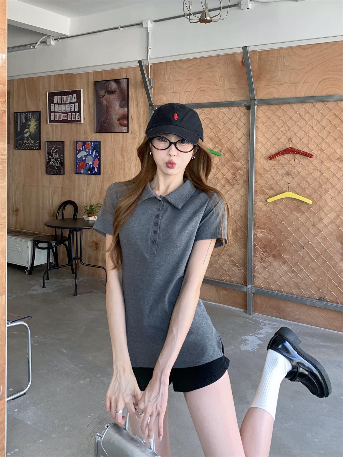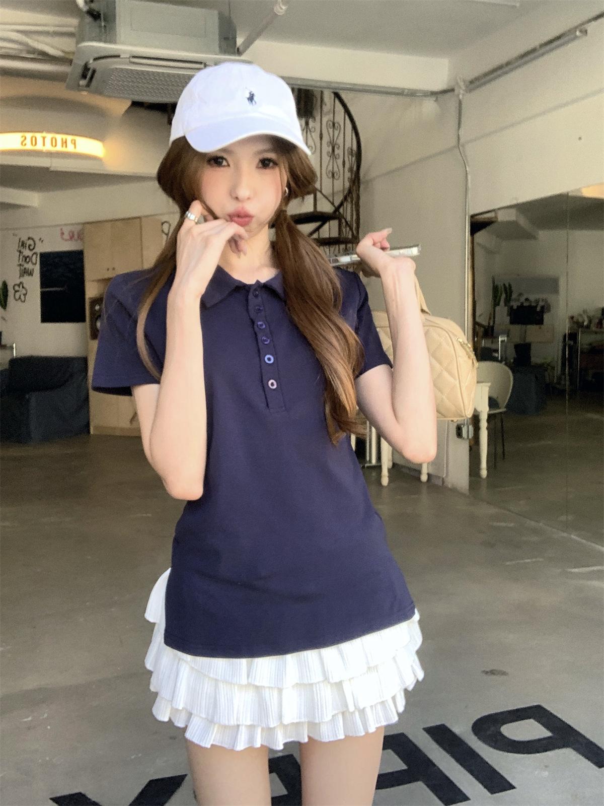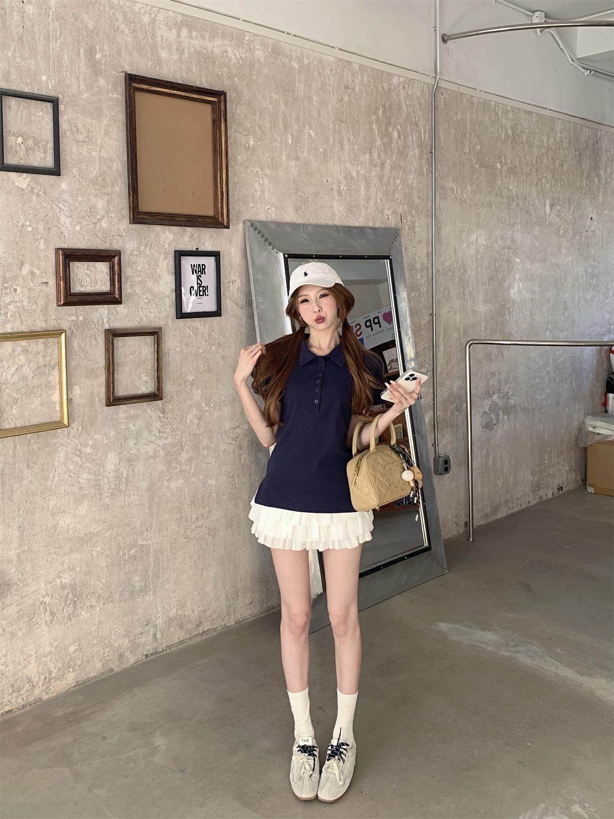 Foto Real de Verano Estilo Coreano Cuello Polo Diseño de Botones Versátil Simple Camiseta de Manga Corta Tops para Mujer 85487