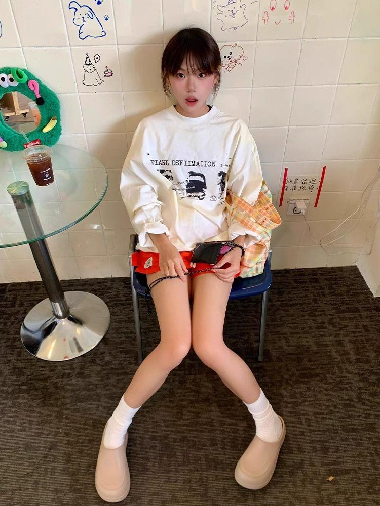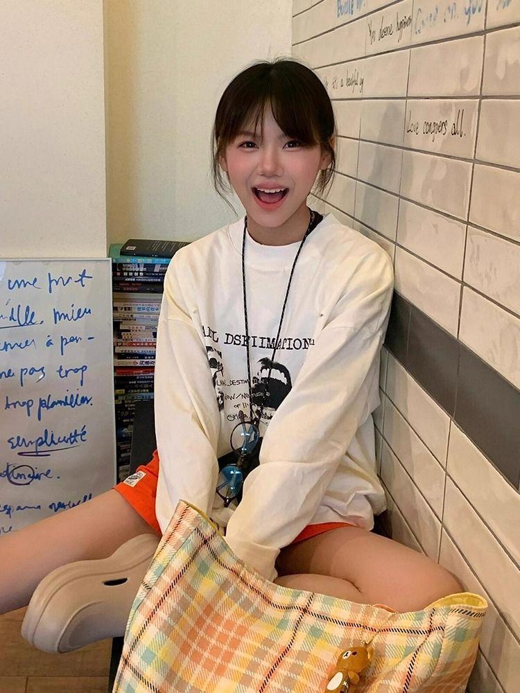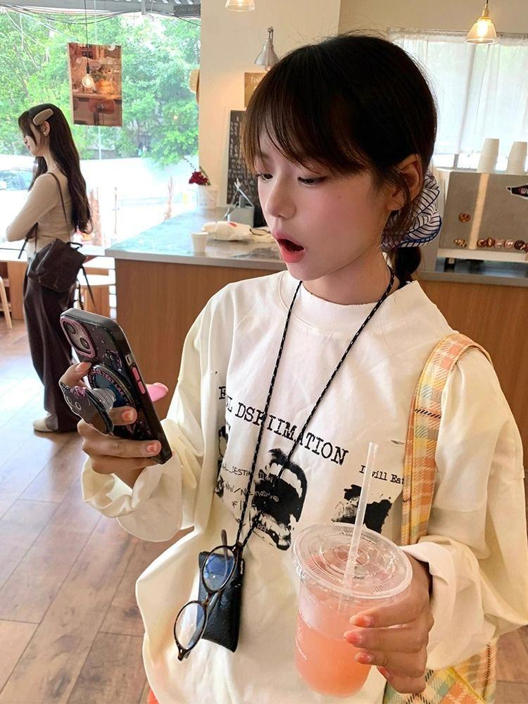 Principios de Otoño Nuevo Estilo Coreano Super Caliente Algodón Puro Manga Larga Camiseta Mujer Vibe Relajada Retro Perezosa Vintage Suelta Estampado Top