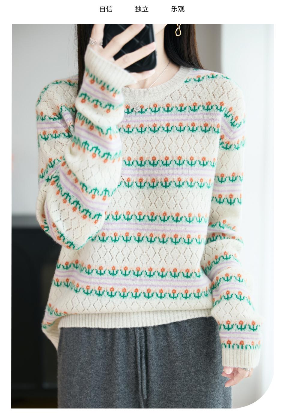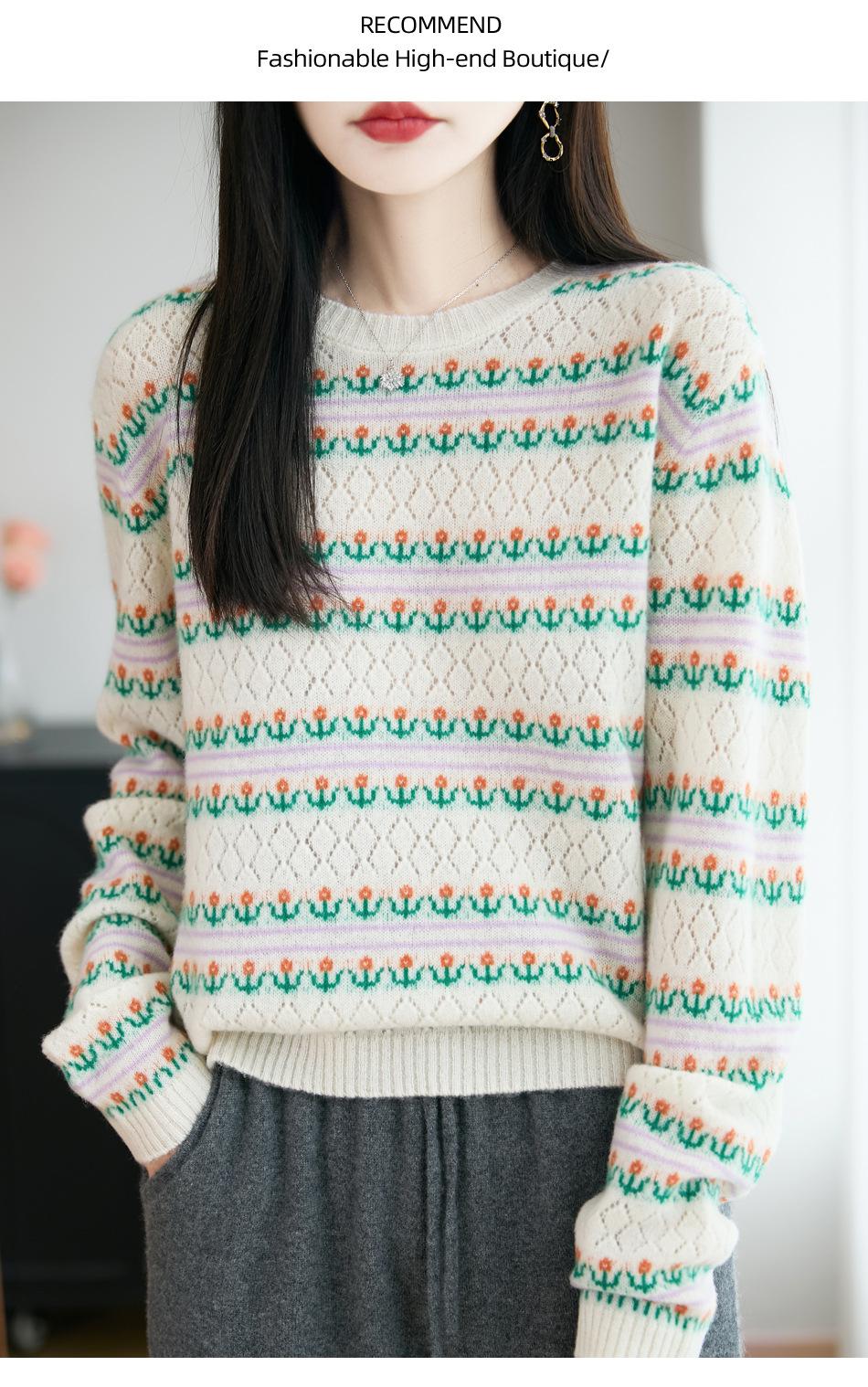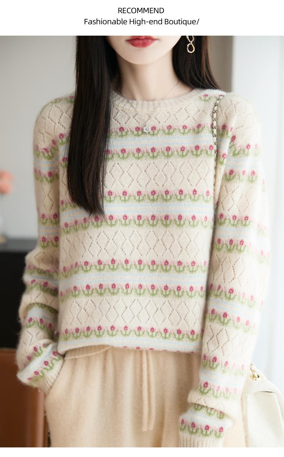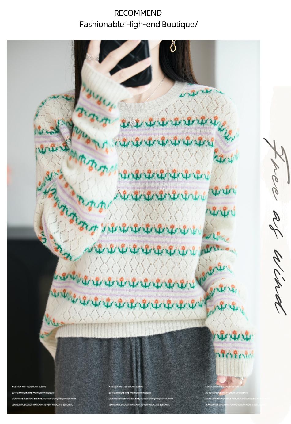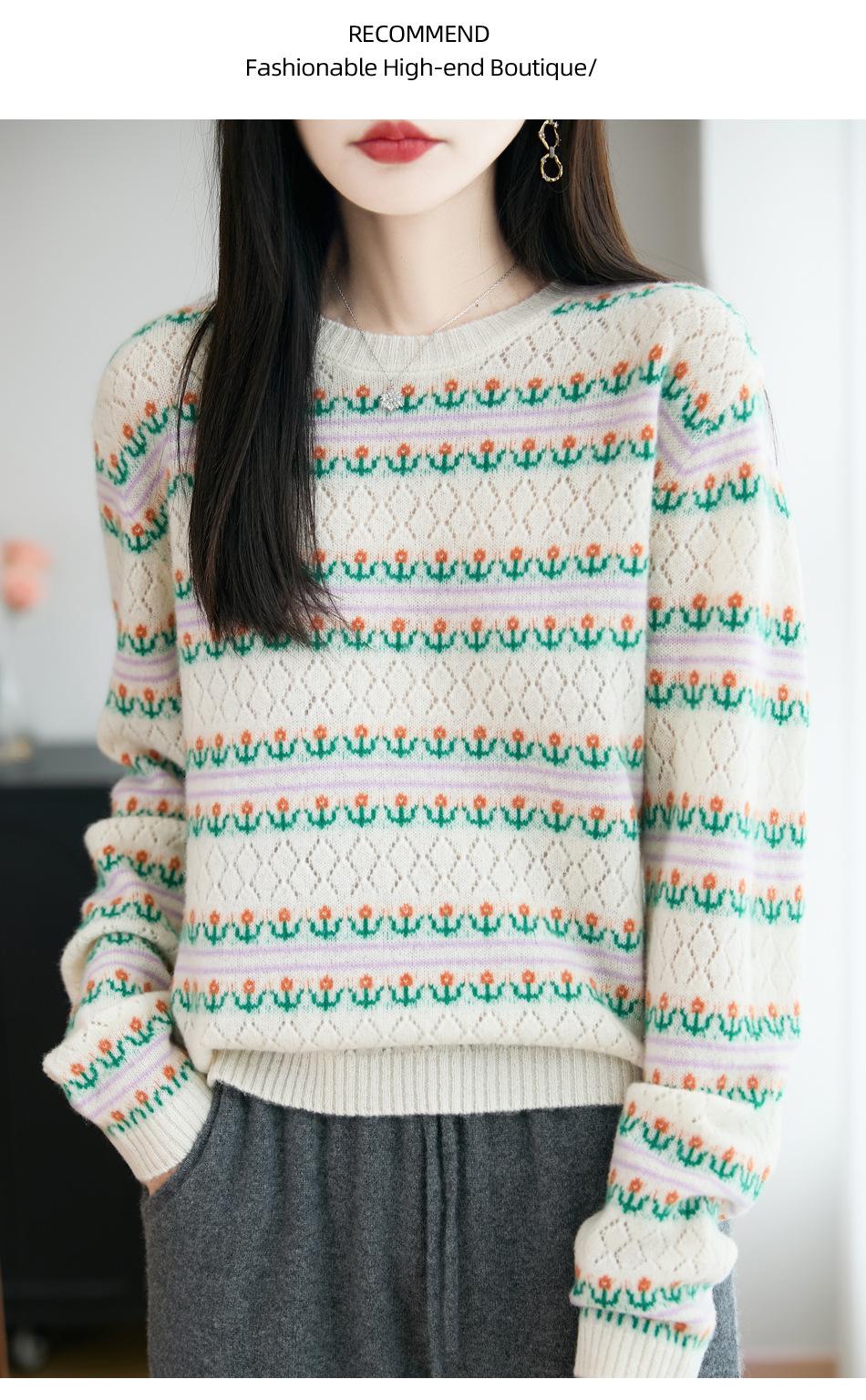 Otoño/Invierno 2025 Nuevo Suéter Tejido de Cuello Redondo de Lana Pura Manga Larga Jacquard Calado Diseño Suelto Sentido Capa Base Top Mujer