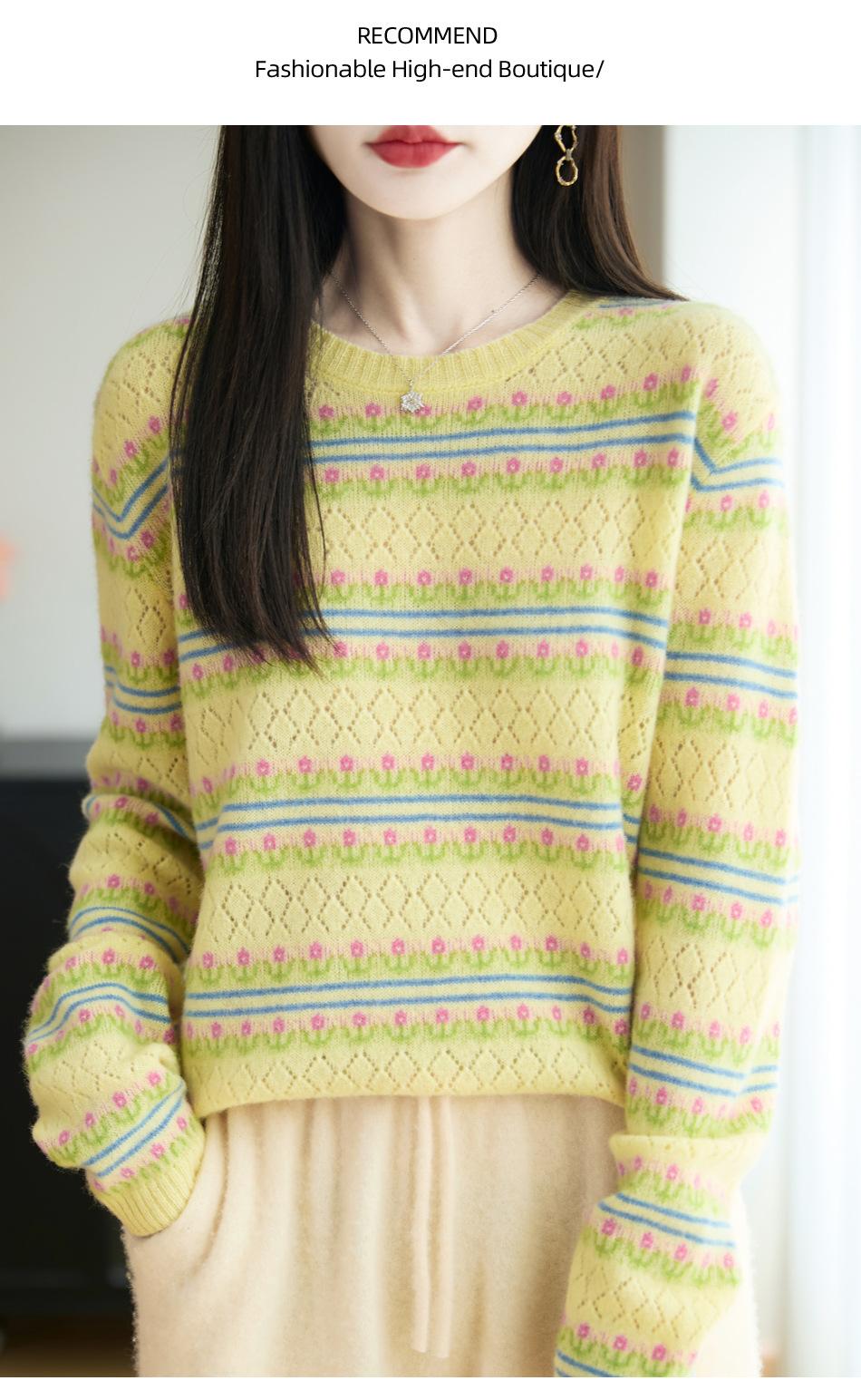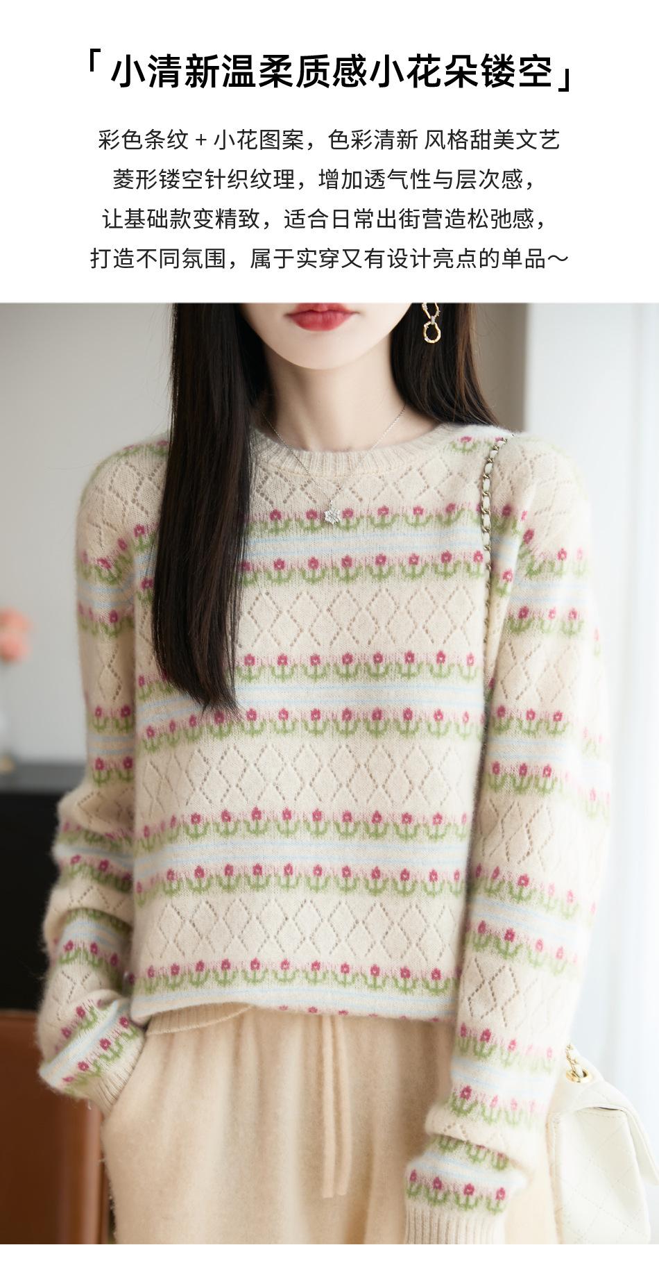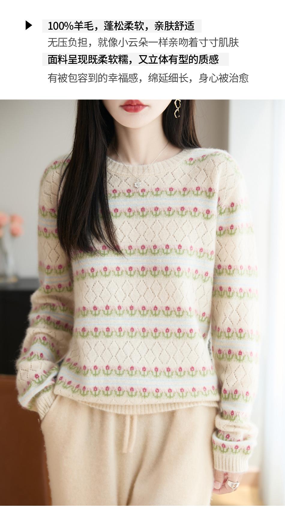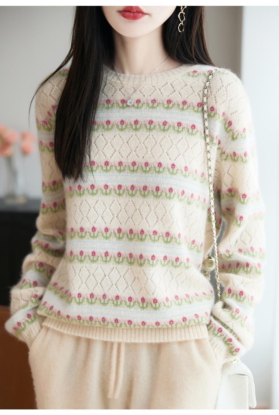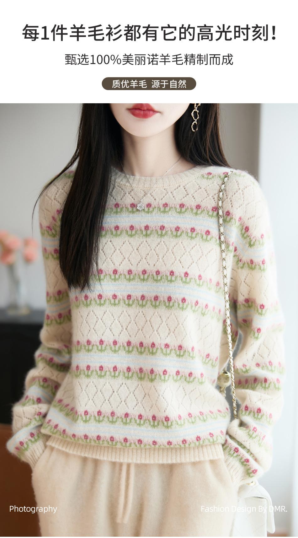 Otoño/Invierno 2025 Nuevo Suéter Tejido de Cuello Redondo de Lana Pura Manga Larga Jacquard Calado Diseño Suelto Sentido Capa Base Top Mujer