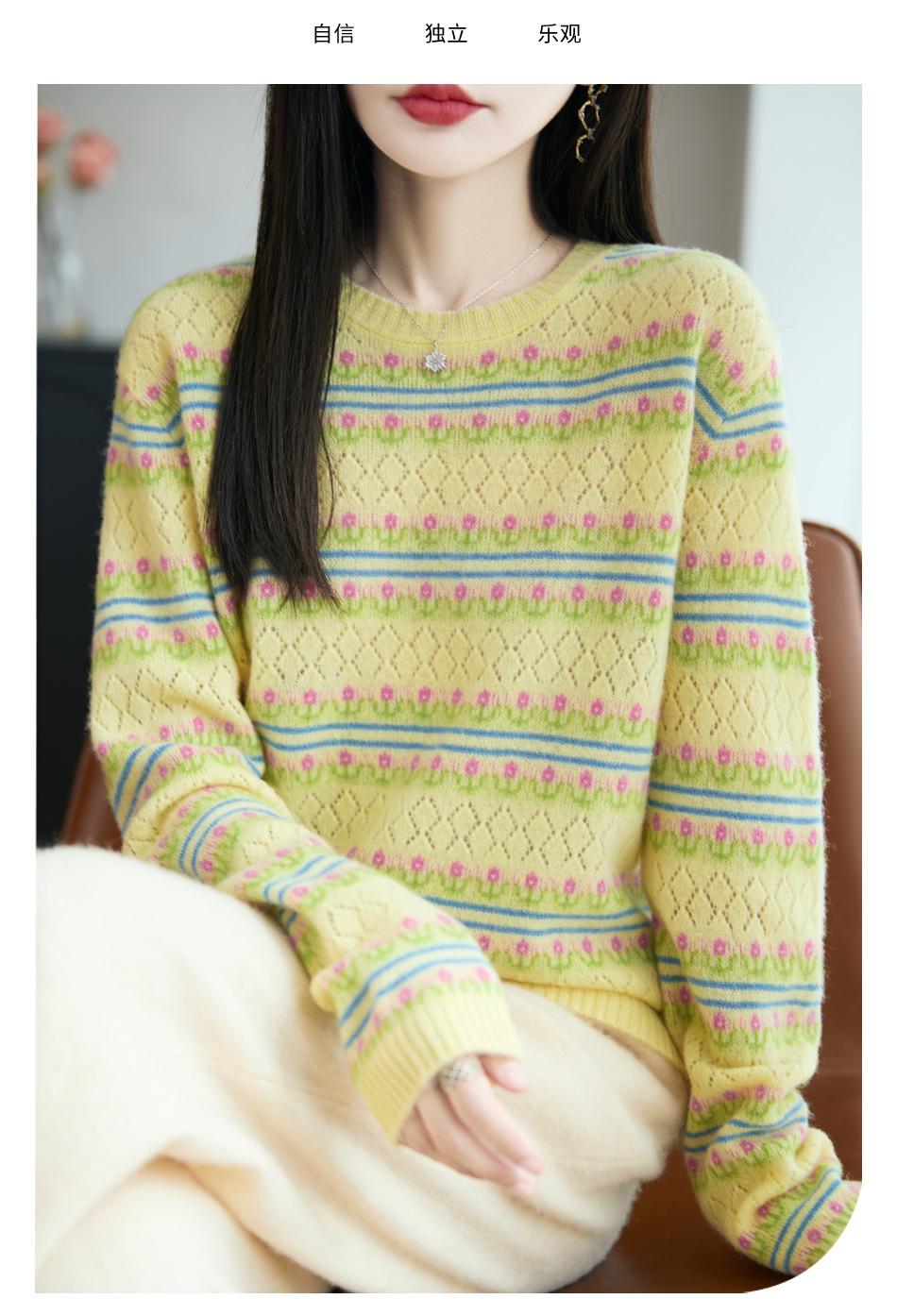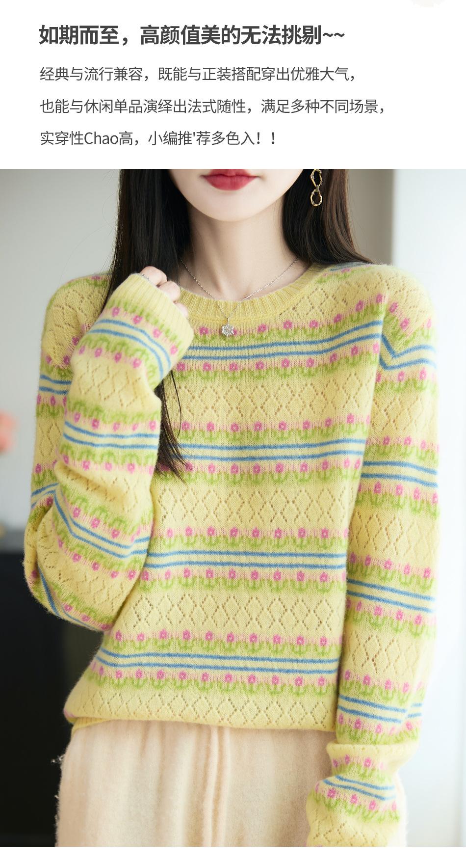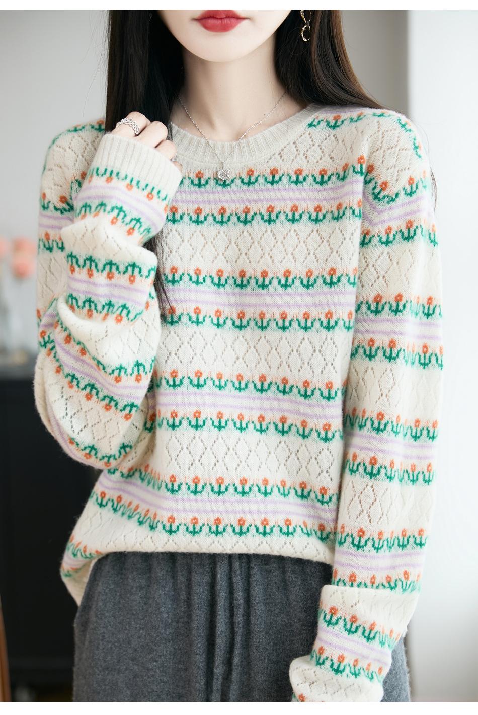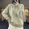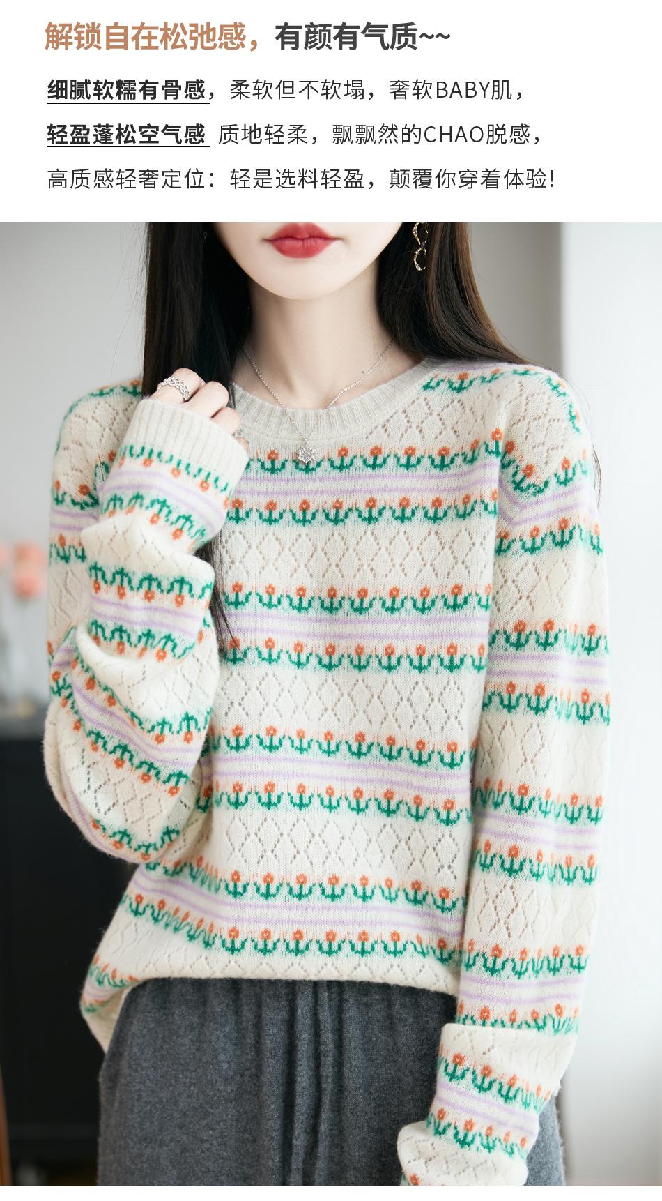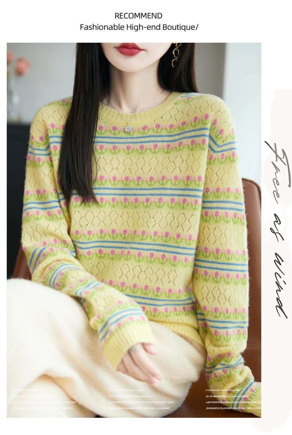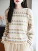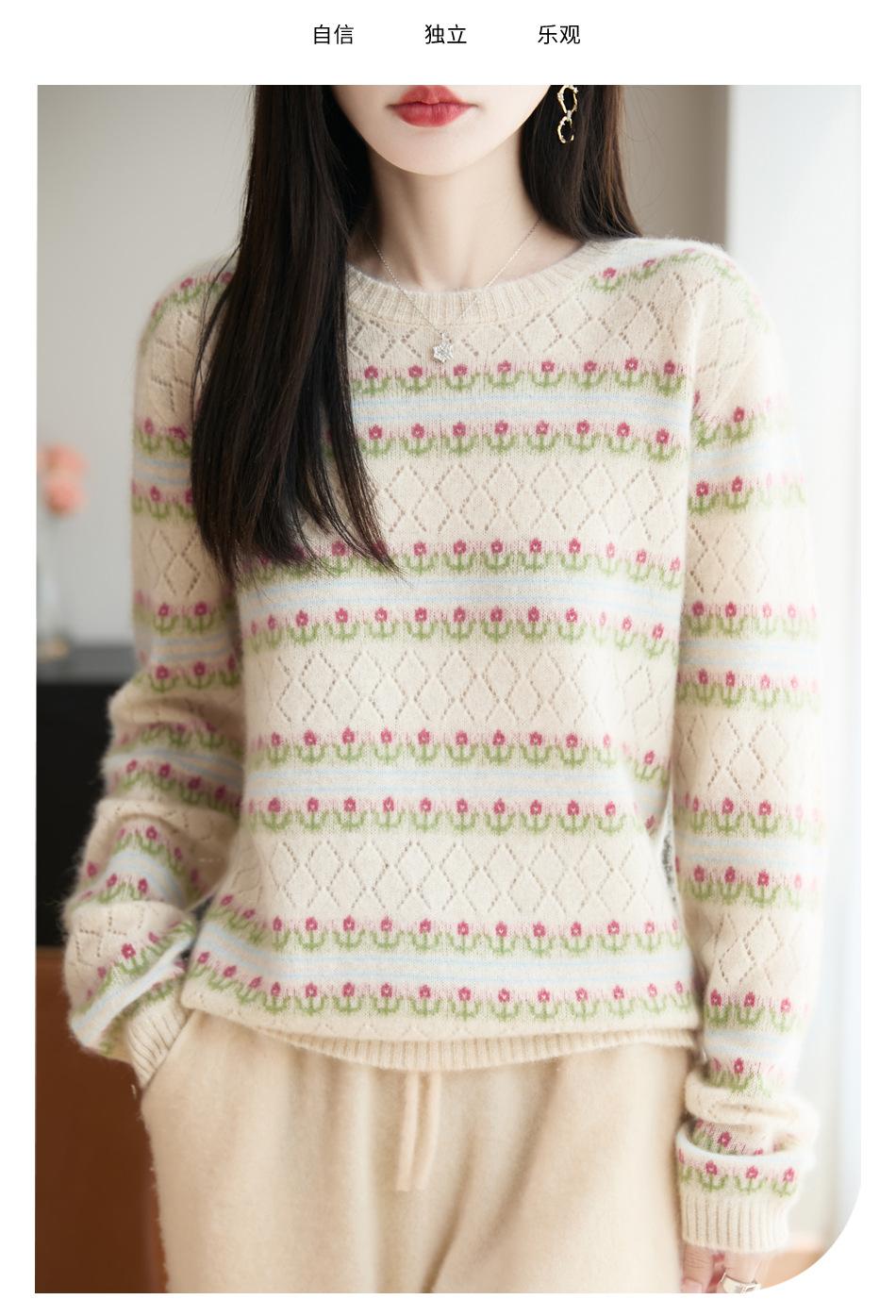 Otoño/Invierno 2025 Nuevo Suéter Tejido de Cuello Redondo de Lana Pura Manga Larga Jacquard Calado Diseño Suelto Sentido Capa Base Top Mujer